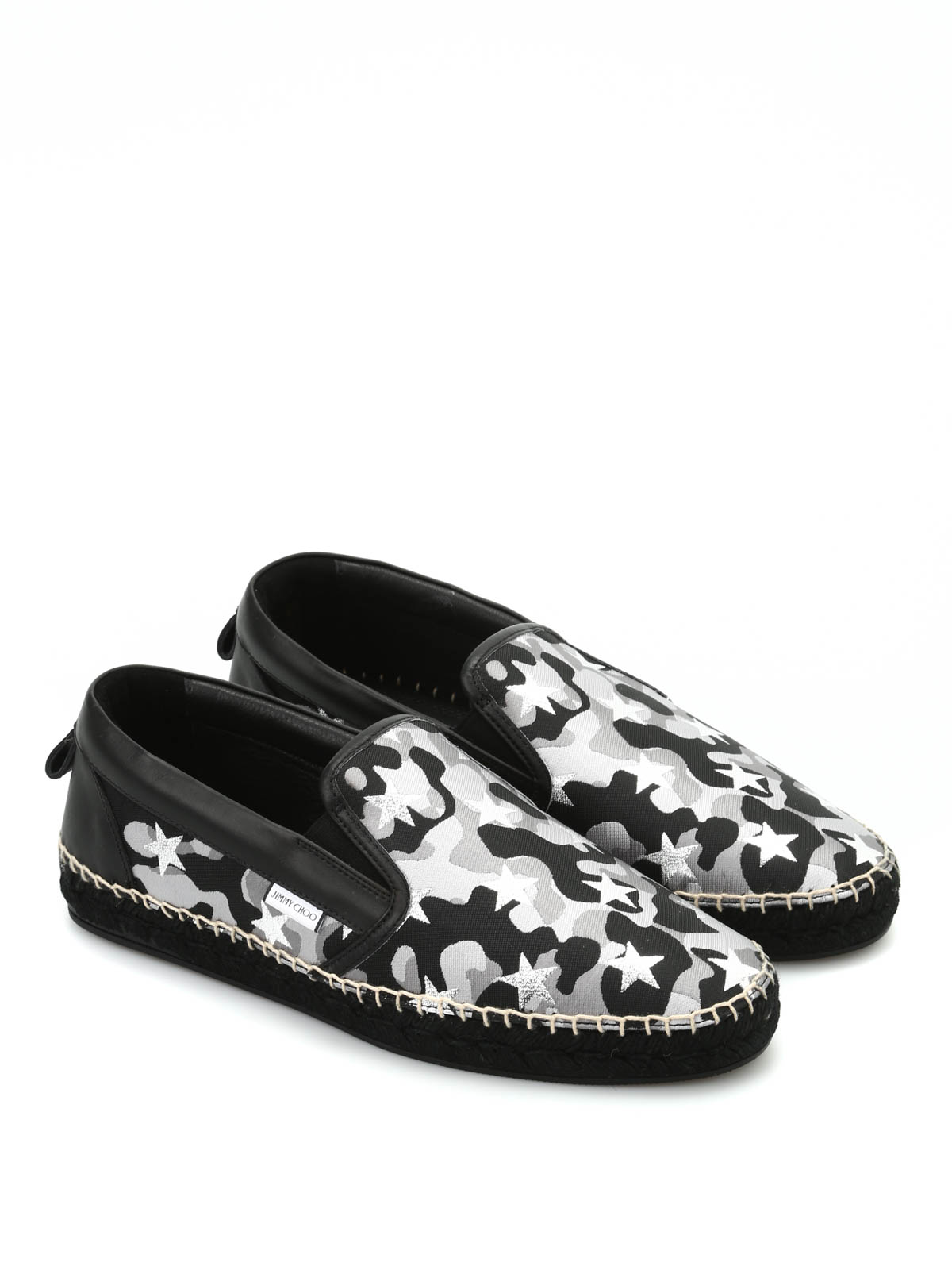 Fabric slippers featuring military camouflage and metallic stars print, leather trims, heel insert and lining, side elastic bands, espadrilles rope pattern on midsole and rubber sole.