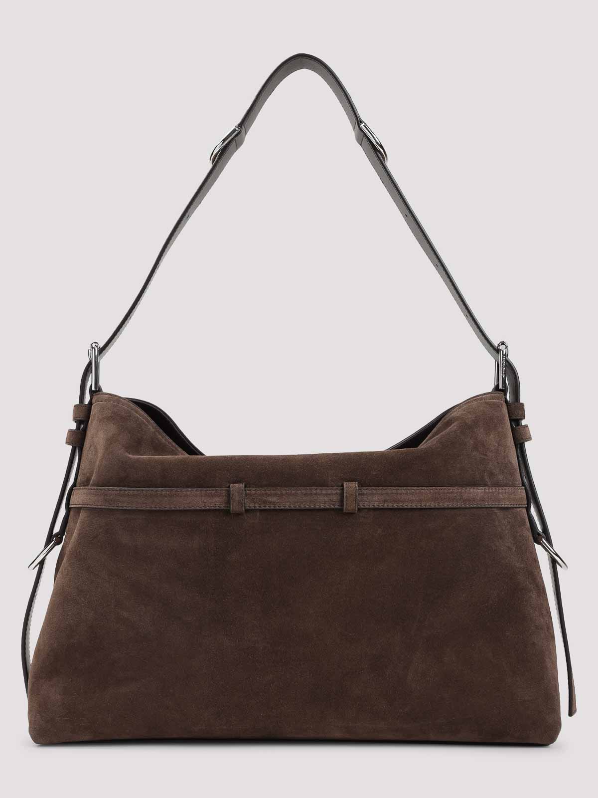 Givenchy voyou medium brown suede calf leather shoulder bag. crafted from soft brown grained calfskin leather, featuring silver-toned hardware, top zip fastening, adjustable shoulder strap that can be converted into a crossbody, buckle strap embellishments, givenchy logo stamped on the front, and one main compartment with an inner flap pocket.
