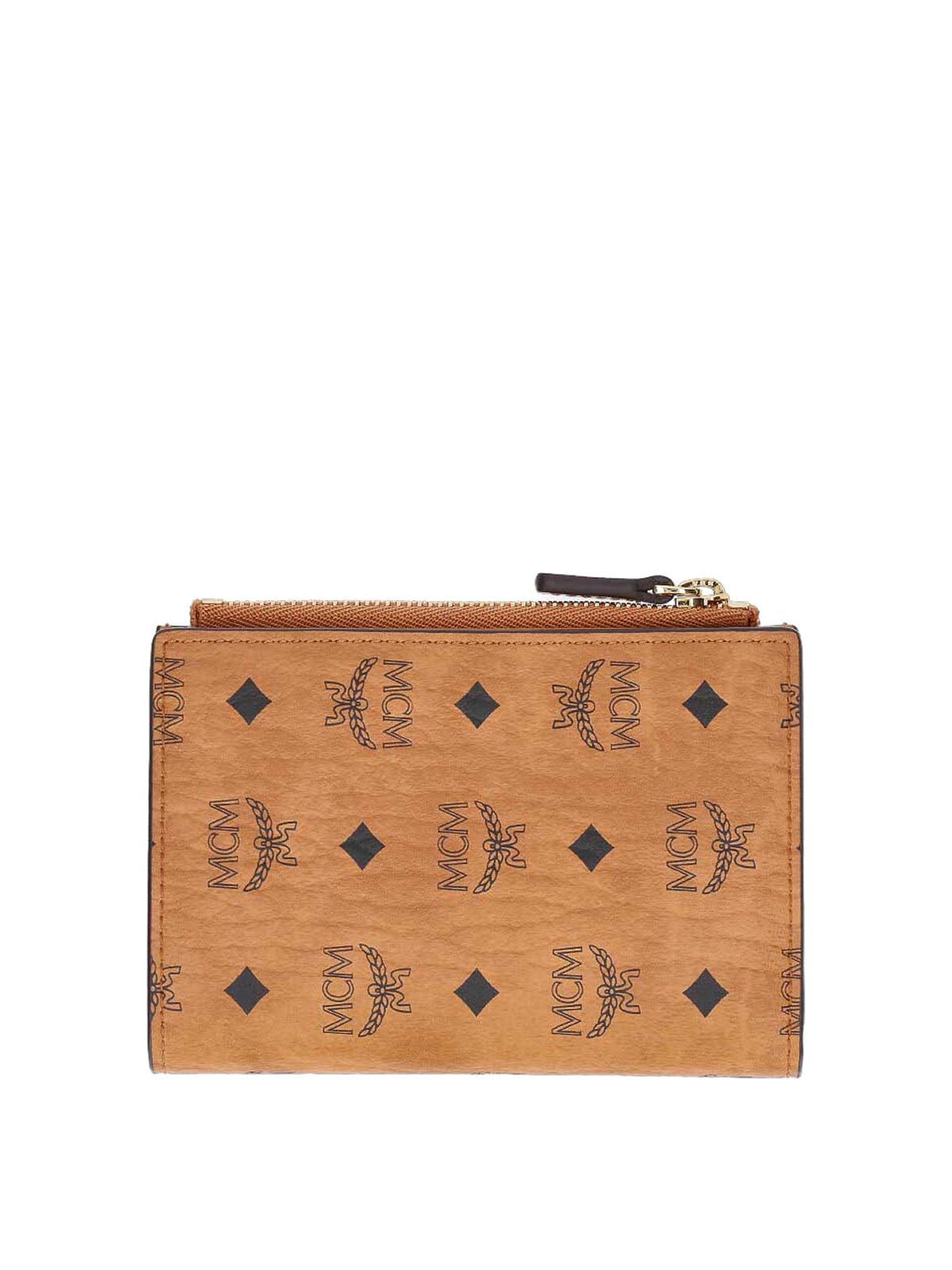 Mcm zip wallet in brown visetos eco-leather, all-over logo motif, top zip and button closure, one zip pocket, four card slots, one banknote compartment.