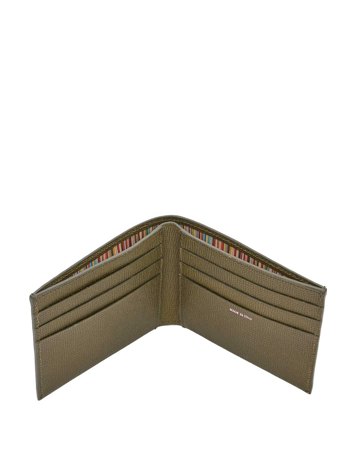 Floral Street Wallet in Military Green. Textured leather wallet by Paul Smith with a contrasting engraved logo on the front. Inside, it features a lined compartment with a signature stripe motif and card slots. Textured leather, engraved logo on the front, bill pocket with a signature stripe, card slots. Color: Military Green. 100% leather. Made in Italy.