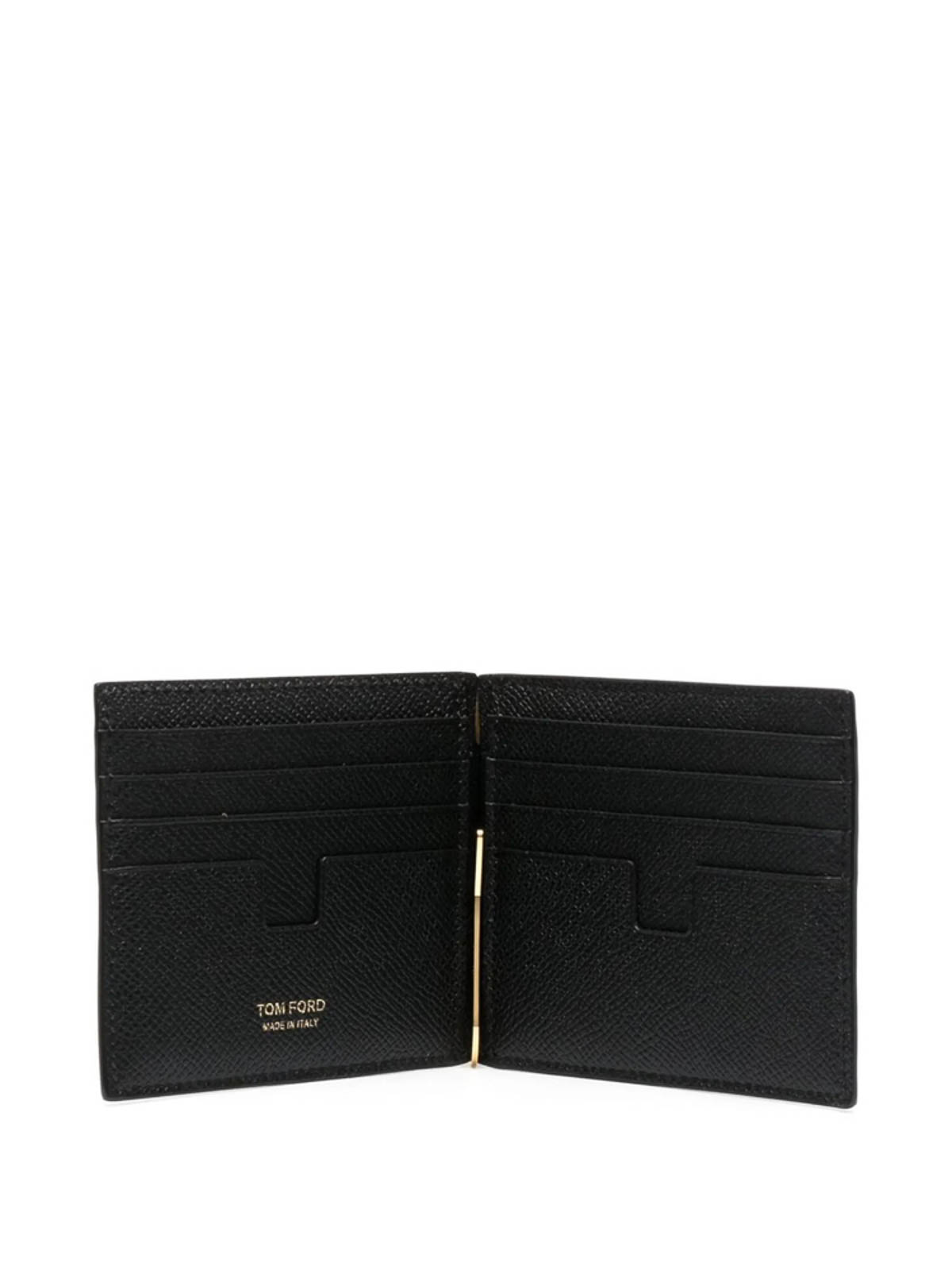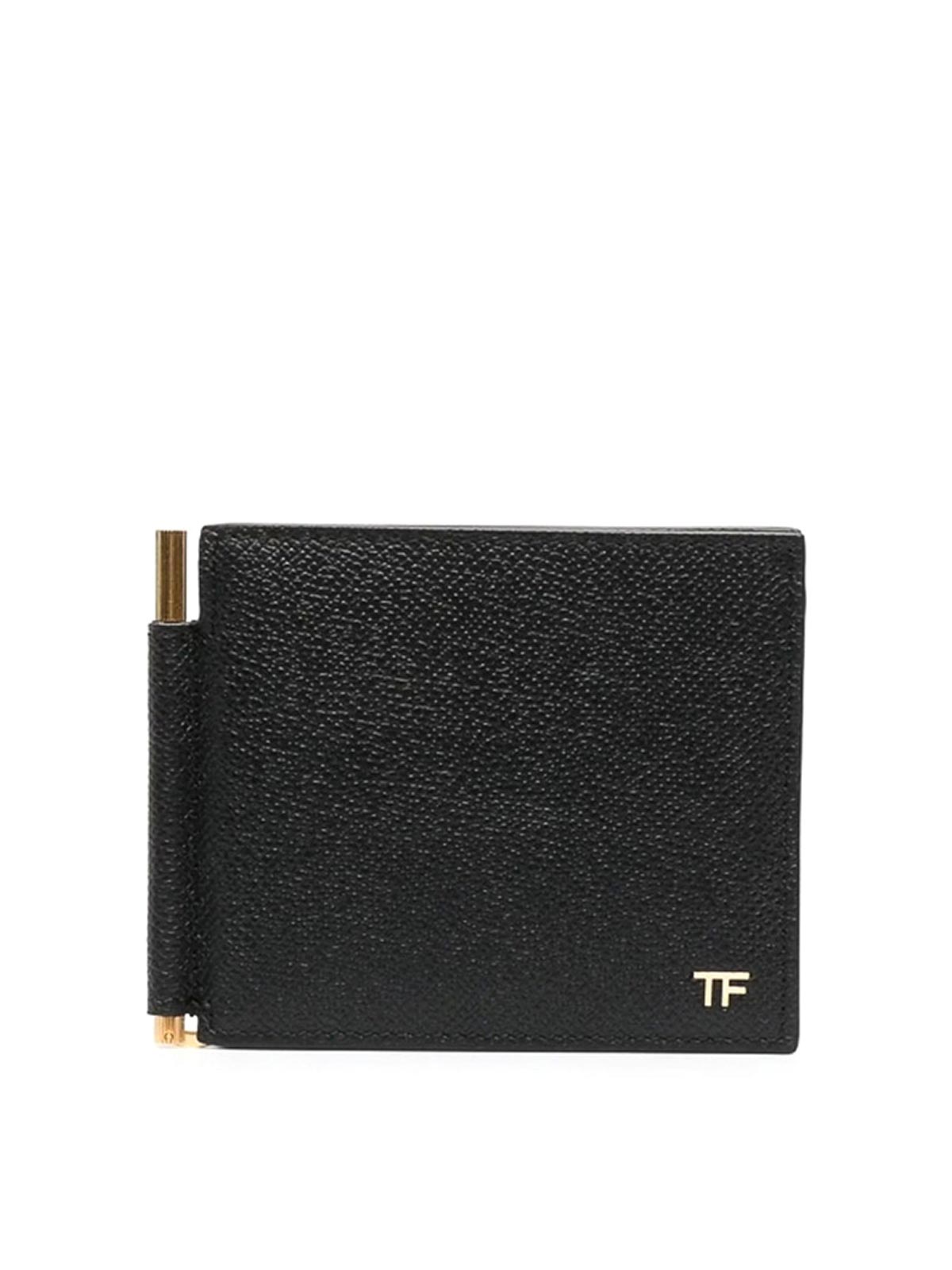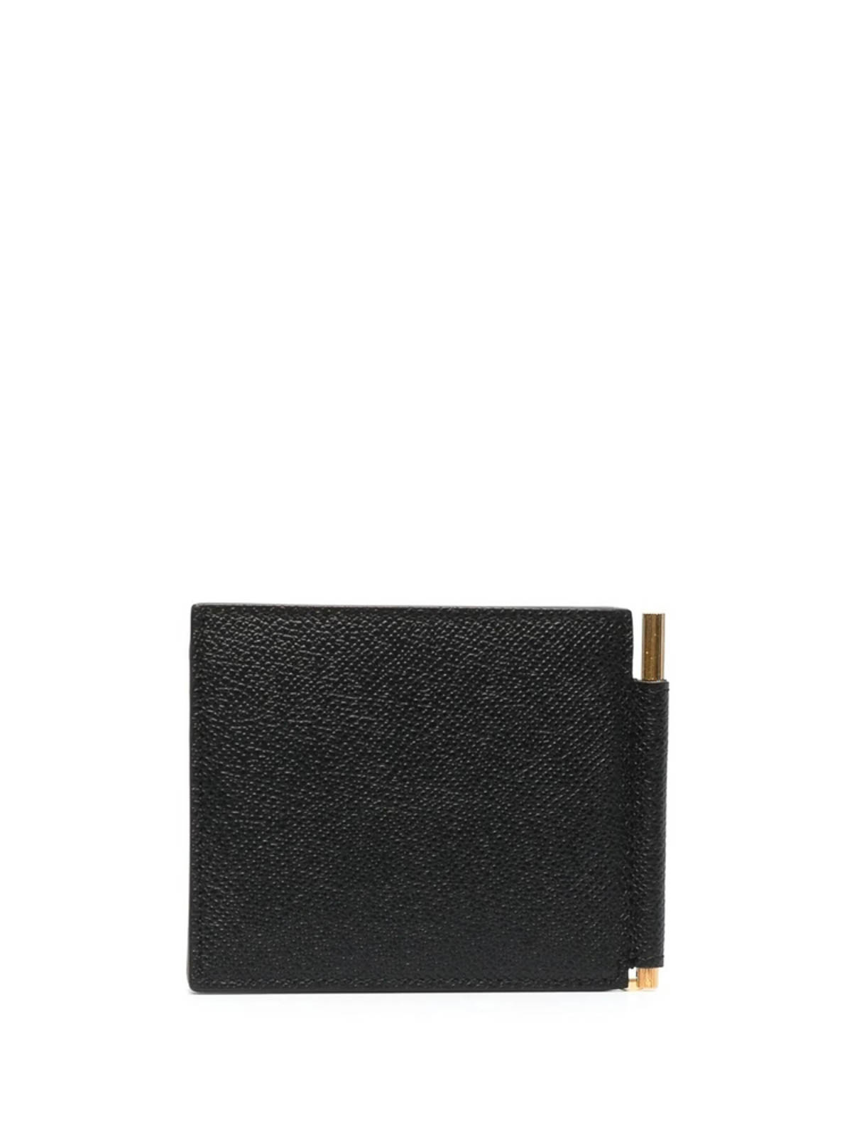 Black sheepskin grained texture folding design multiple internal card slots gold-tone logo plaque