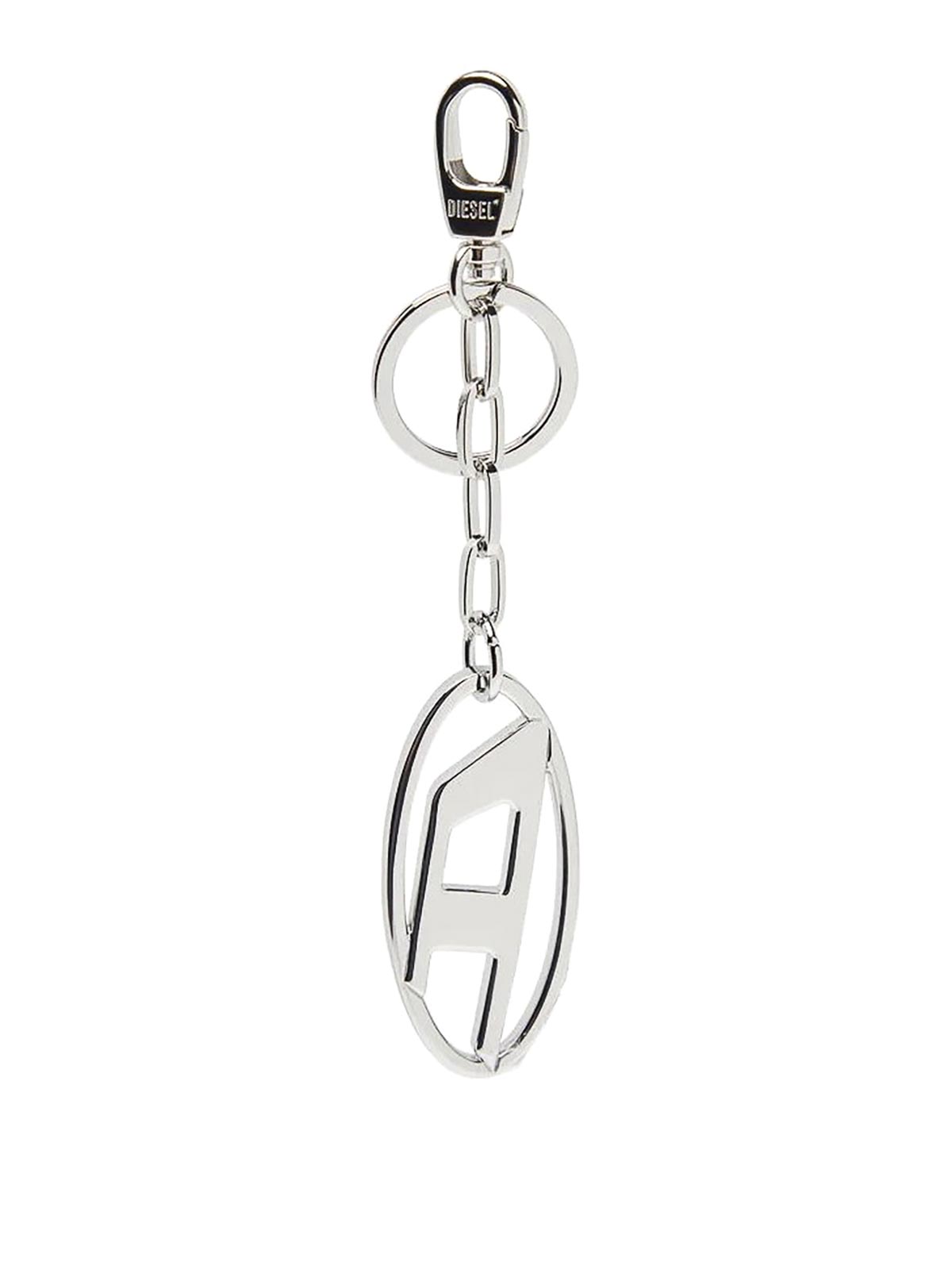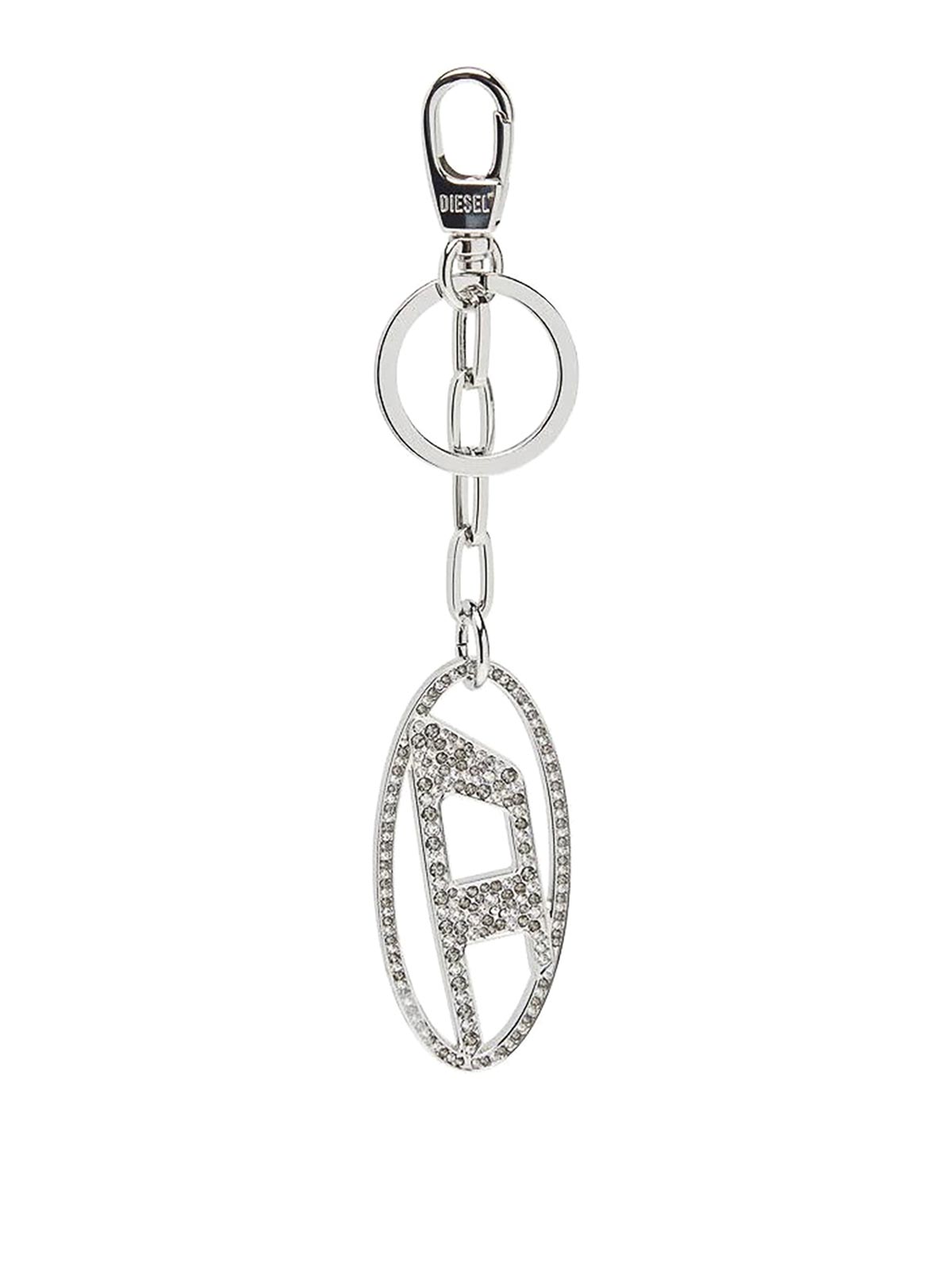 Holy-c diesel keyring made of metal with a silver finish, this women's keyring features the oval d plaque suspended from a short chain: one side is polished, the other is decorated with crystals of various sizes.