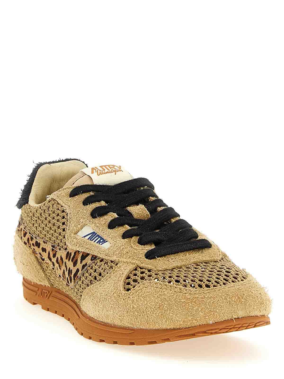 windspin' sneakers in used-effect shaved suede and woven and crochet perforated fabric, contrast heel, side detail in pony leather animal print, slightly padded nylon tongue and jacquard logo patch, leather and cotton terry lining, mesh lined insole, ultra-flat rubber sole.