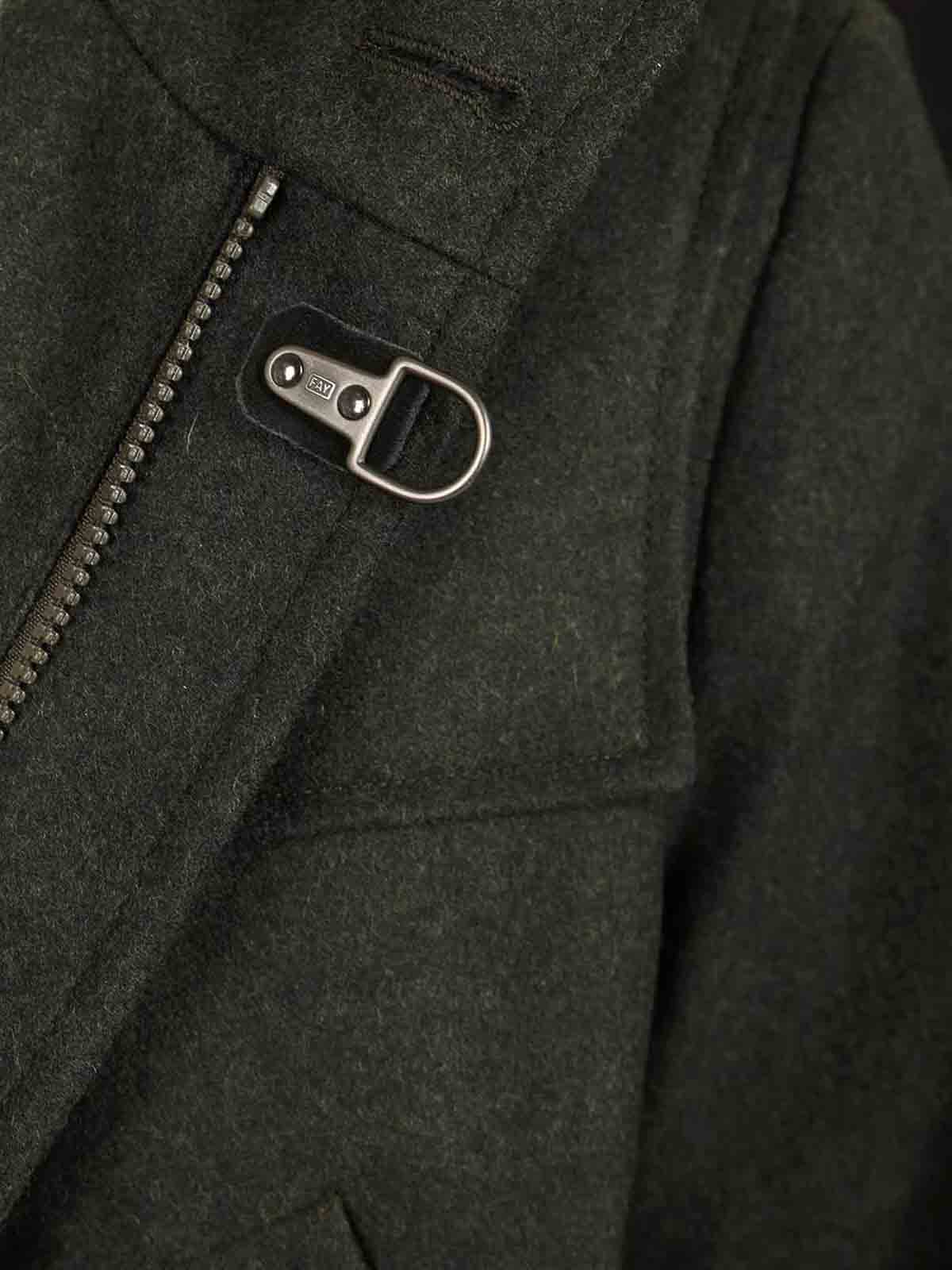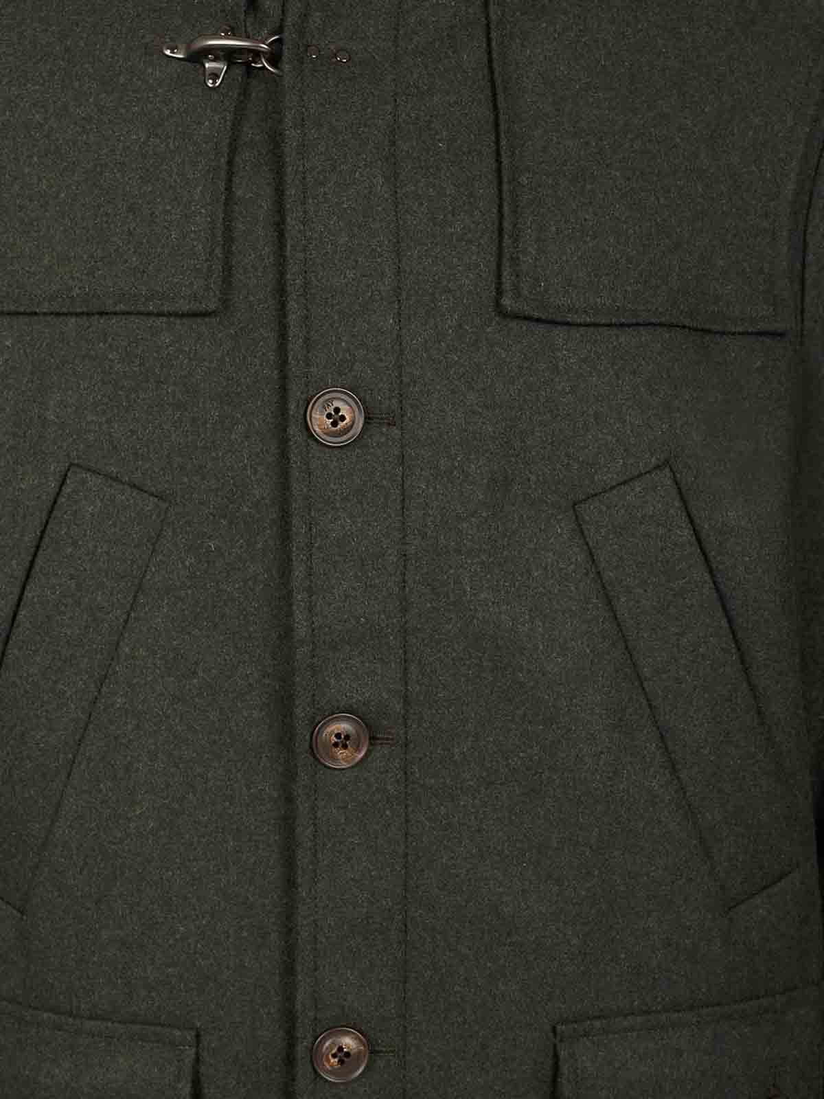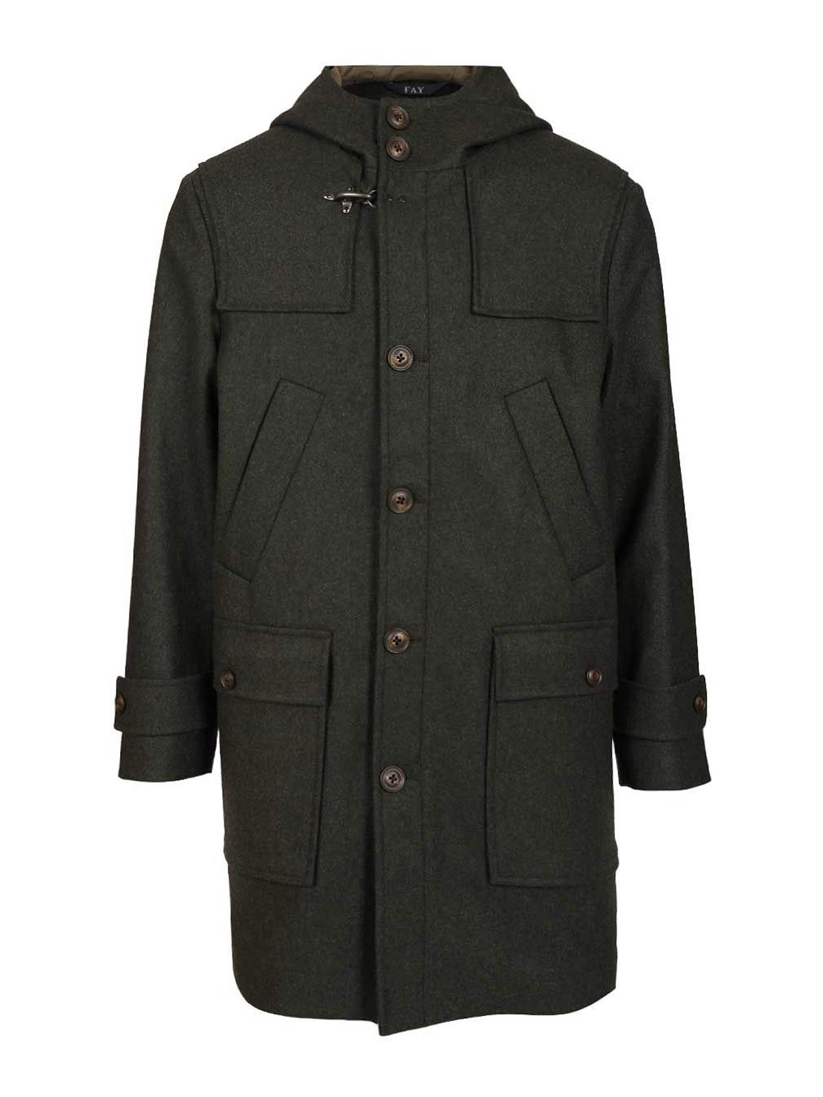 Wool and coat by fay featuring a hood shoulders and toggles at the bottom of the sleeves has lower patch pockets with flap and handwarmer pockets