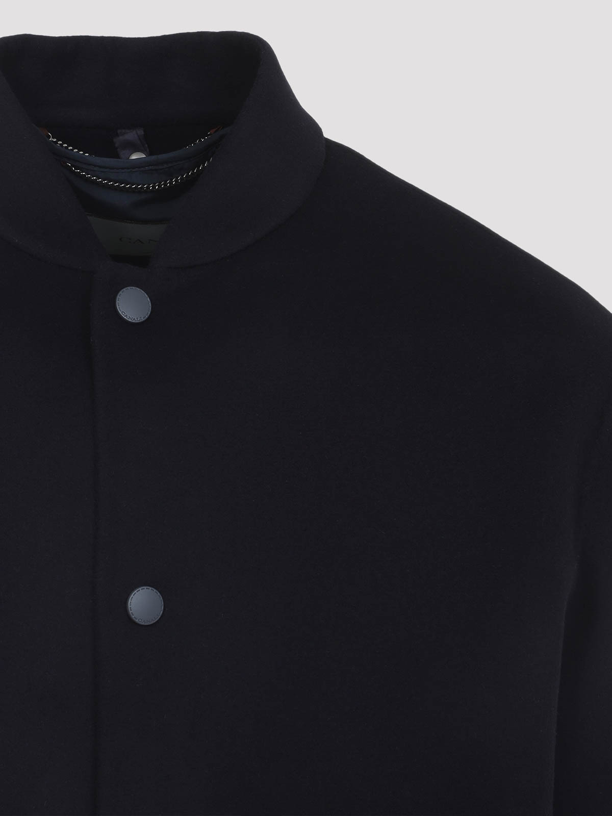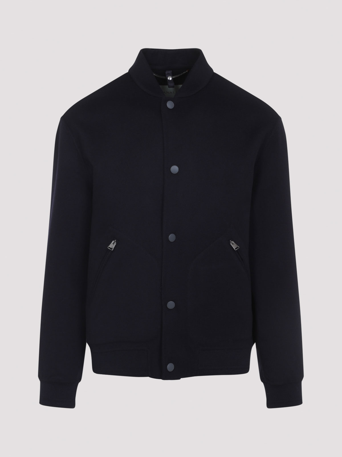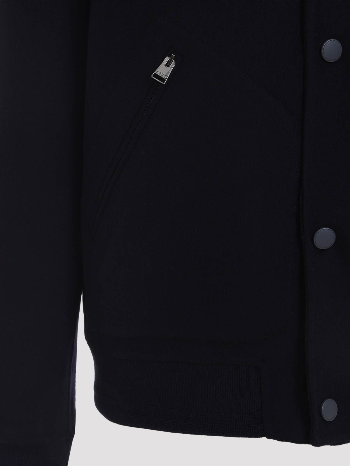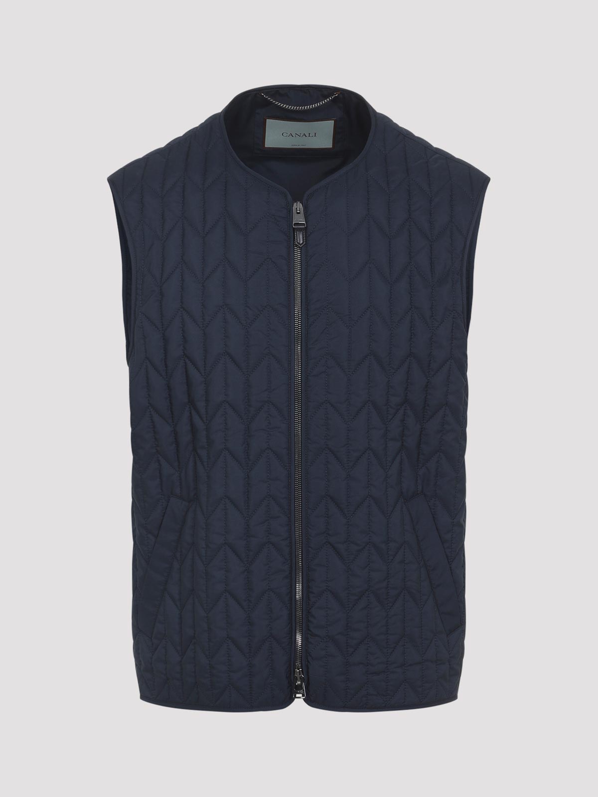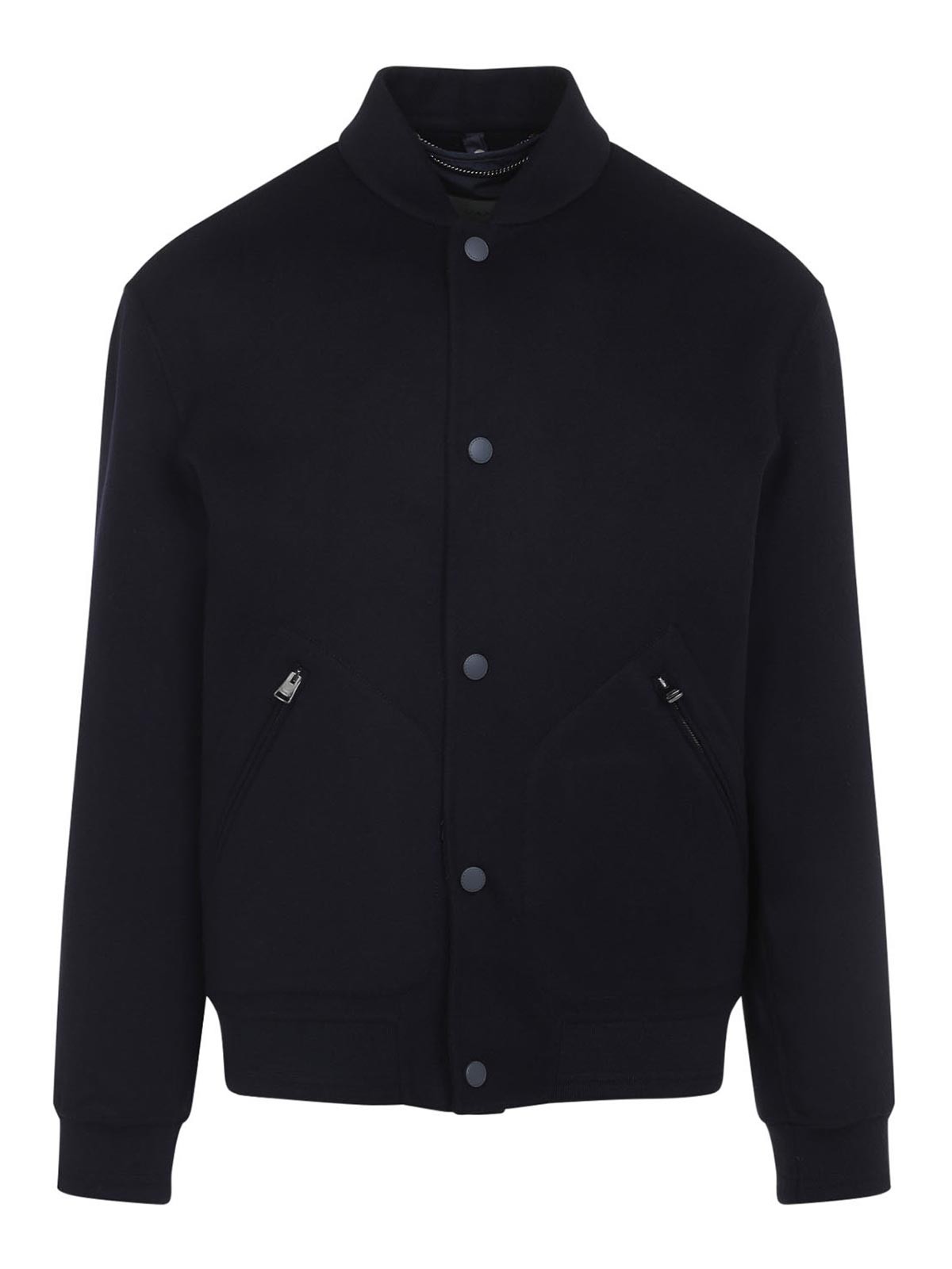 Canali wool navy blue bomber jacket. crafted from navy blue wool and cashmere, round neckline, front snap button fastening, two zip pockets on the front, long sleeves. inner detachable padded vest with geometric quilted pattern, round neckline, front zip fastening and two front pockets.