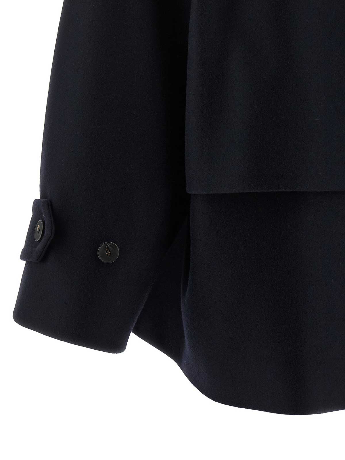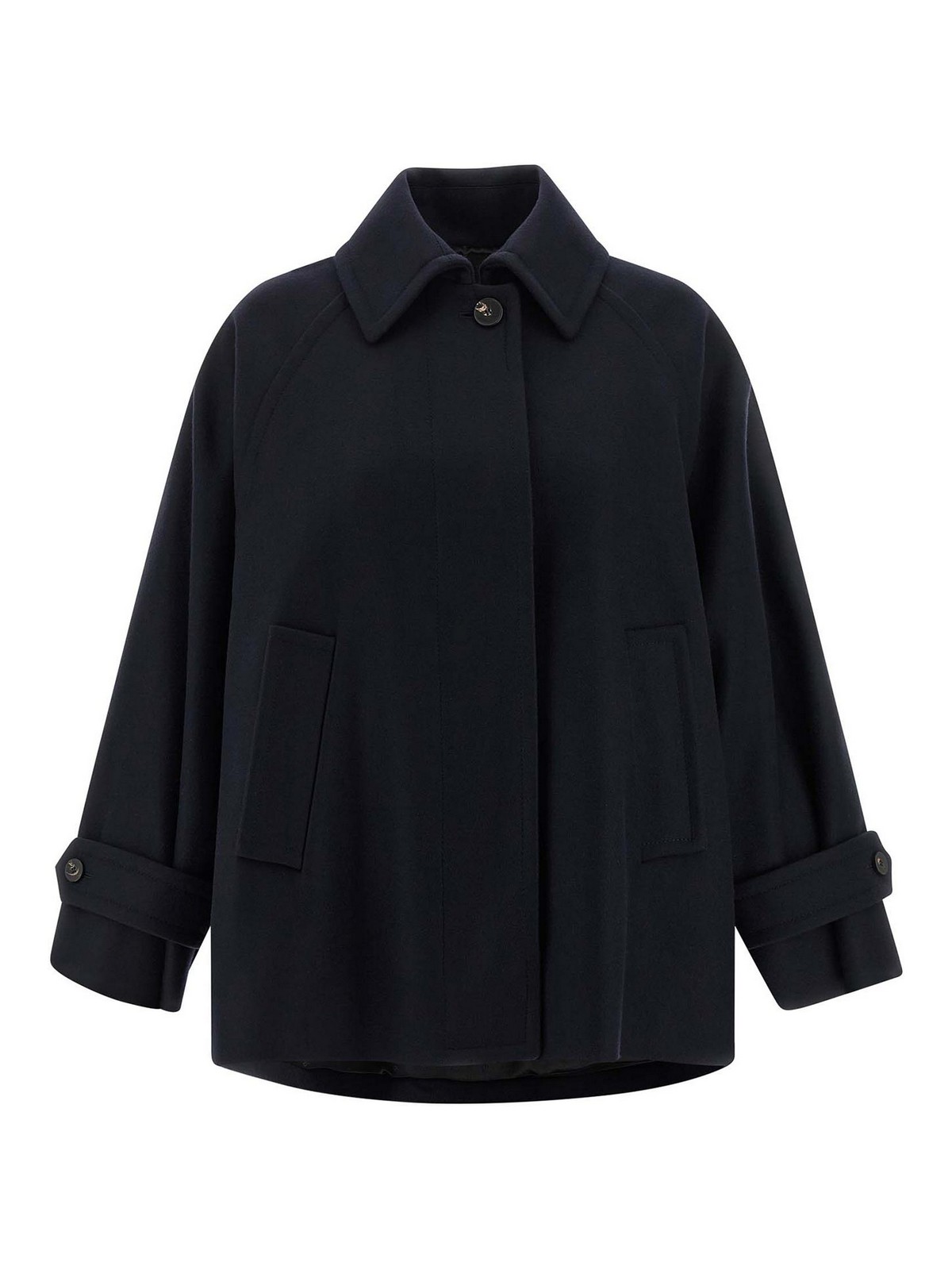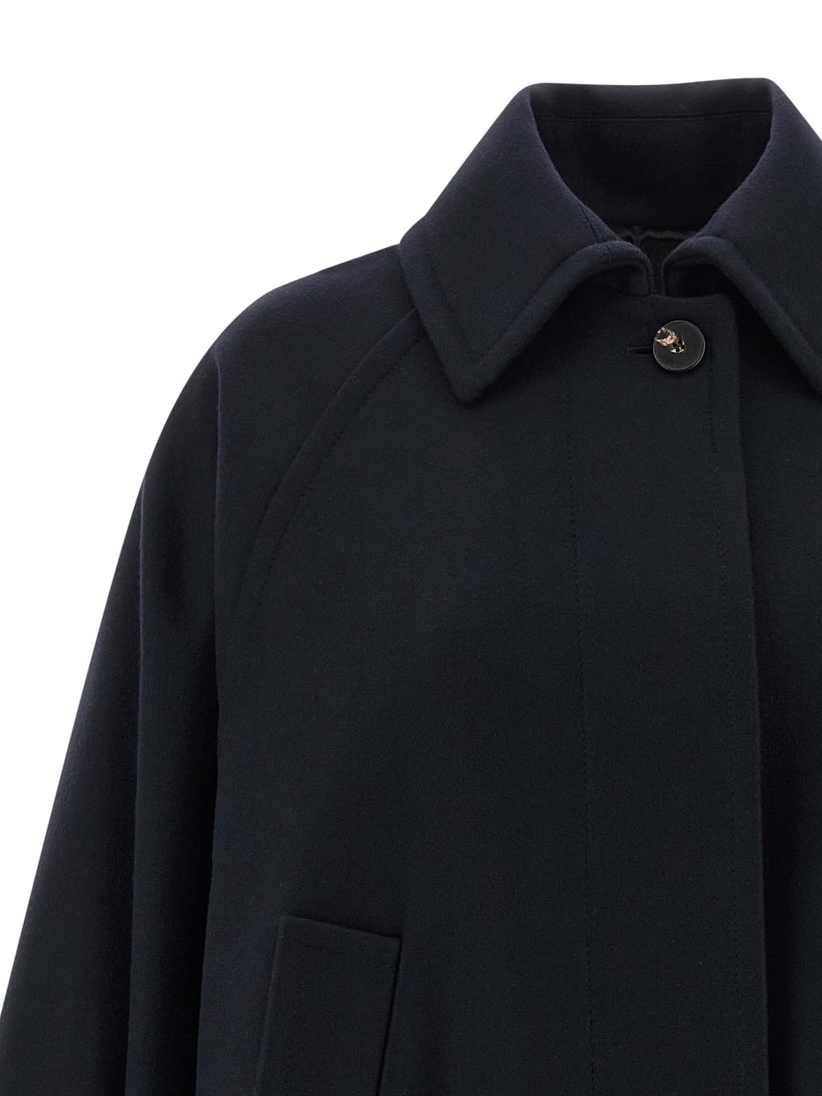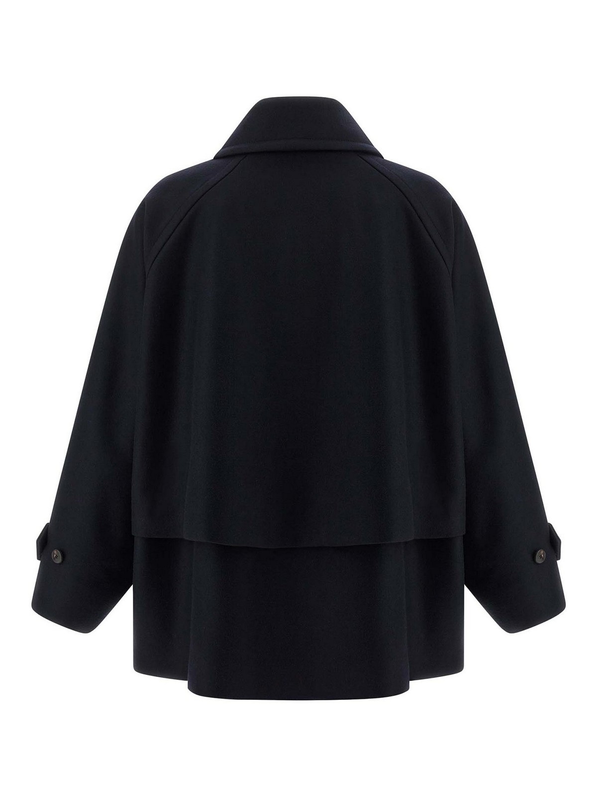 Wool blend caban with front button closure, loose fit with bat sleeves, front pockets, long sleeves with adjustable strap on the cuff.