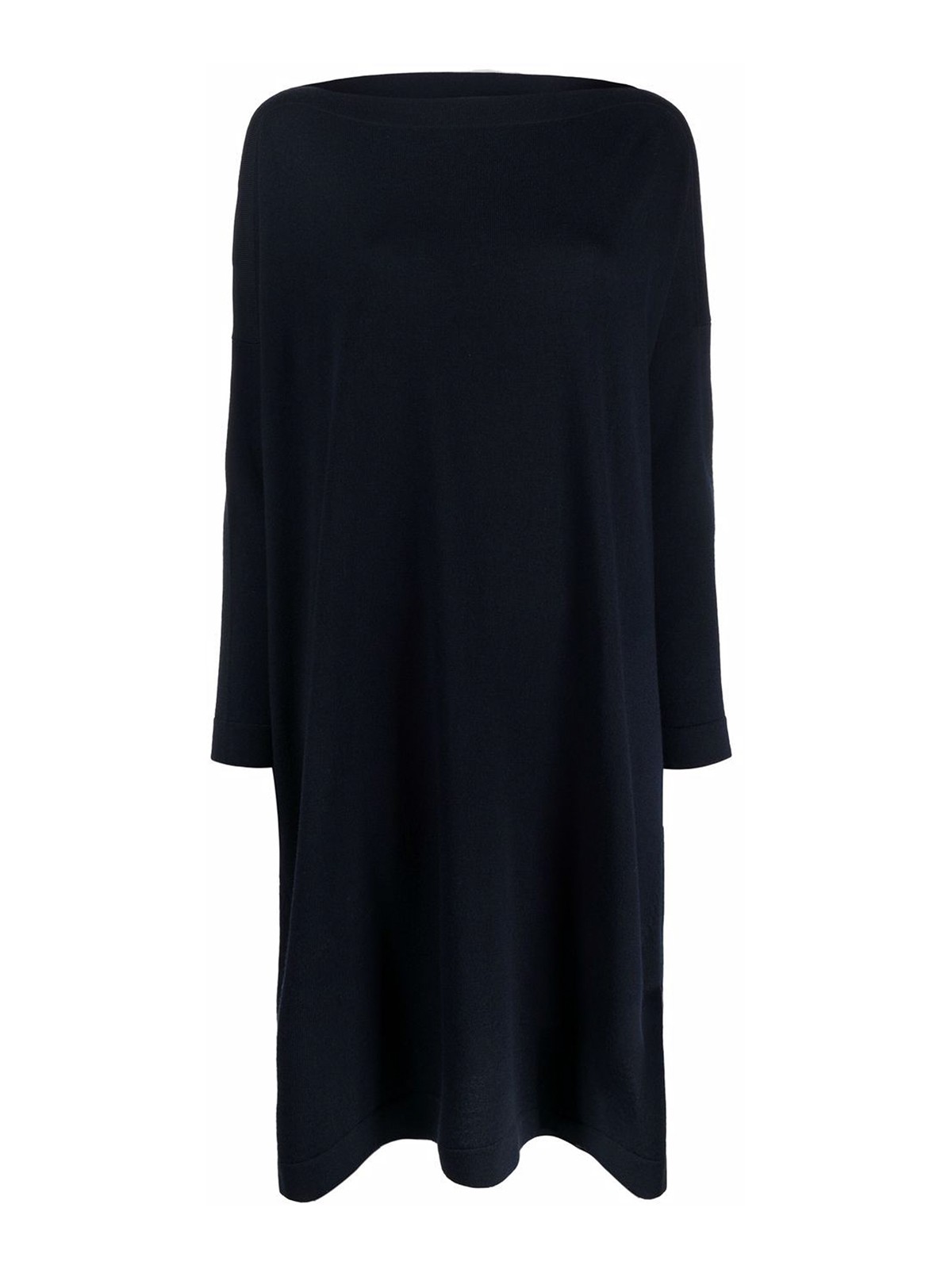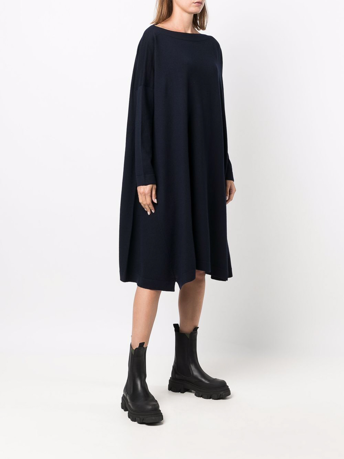 Navy blue wool flared knitted dress from daniela gregis featuring flared knitted construction boat neck drop shoulder and long sleeves