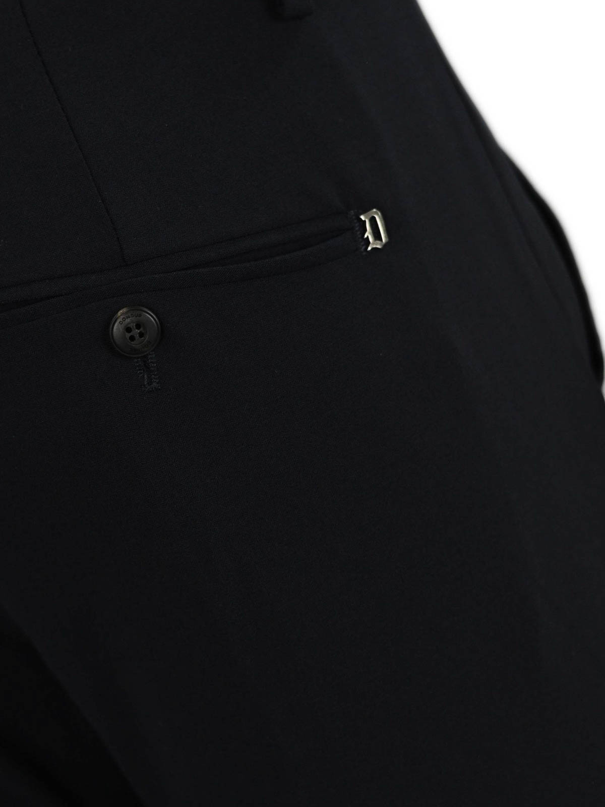 Wool low, rise waist belt loops zip and hook side pockets back welt pockets slim fit
