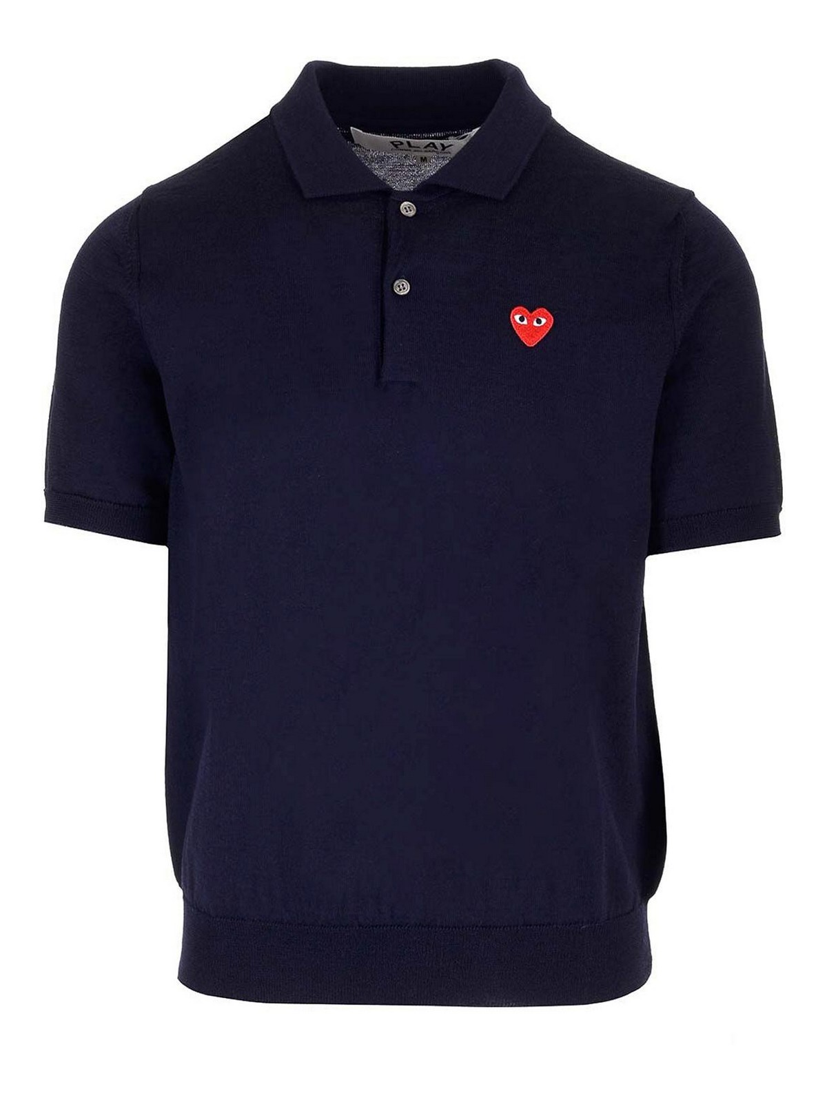 Comme des garcons play wool polo shirt, short sleeve, classic collar, iconic red heart embroidery on one side of the chest.