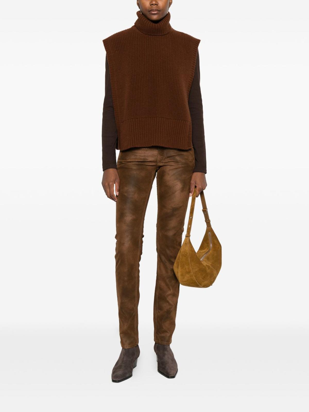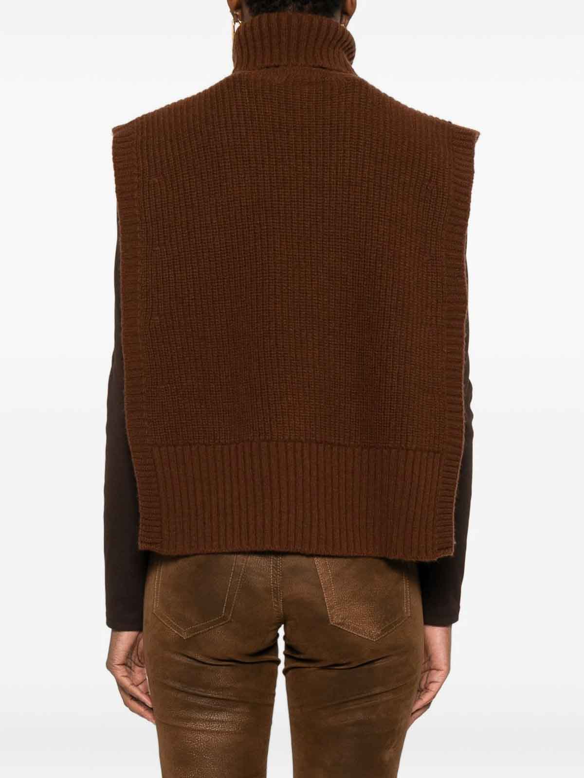 Brown ribbed knit sleeveless turtleneck straight hem