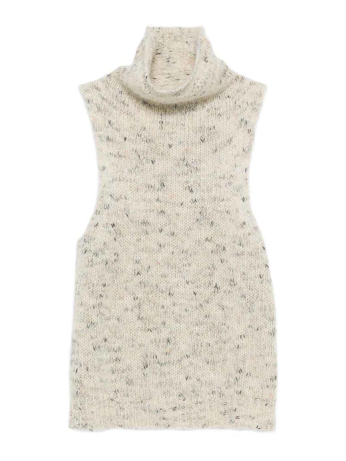 Beige, turtleneck, sleeveless, speckled pattern.