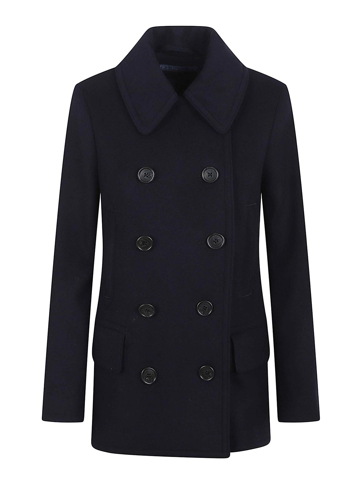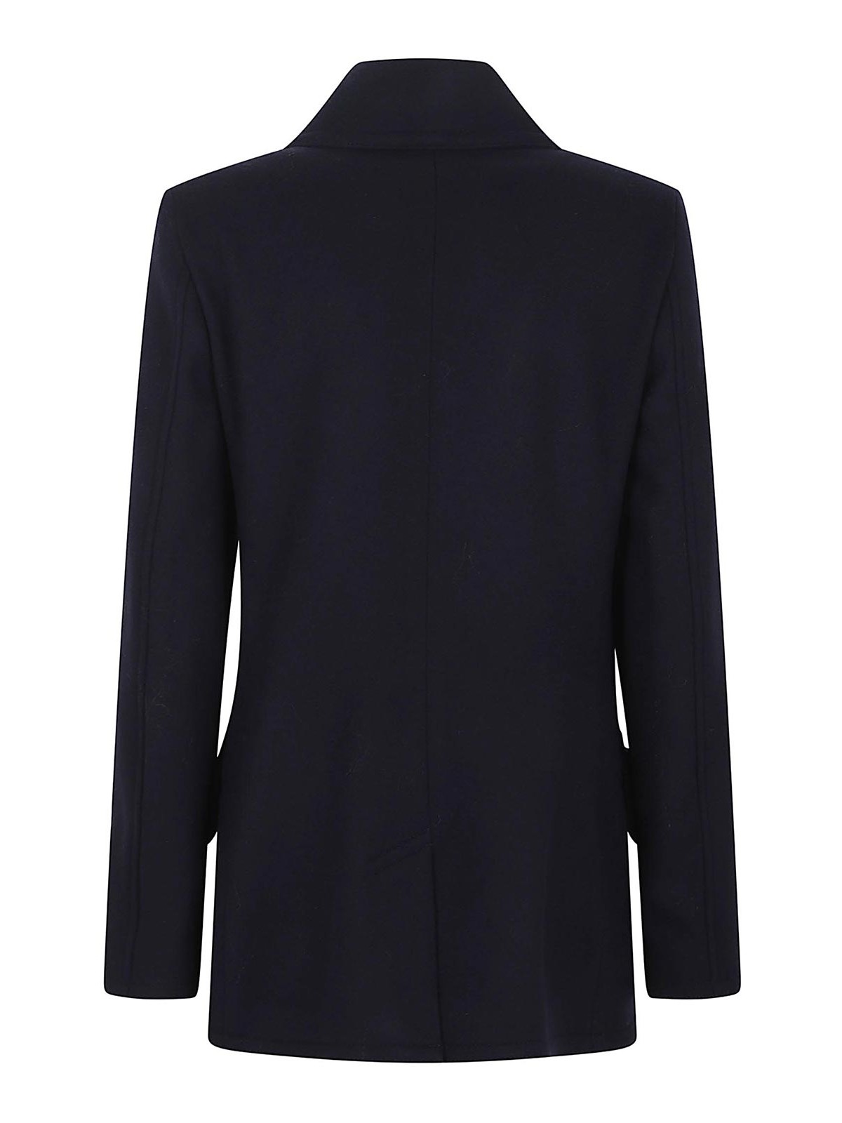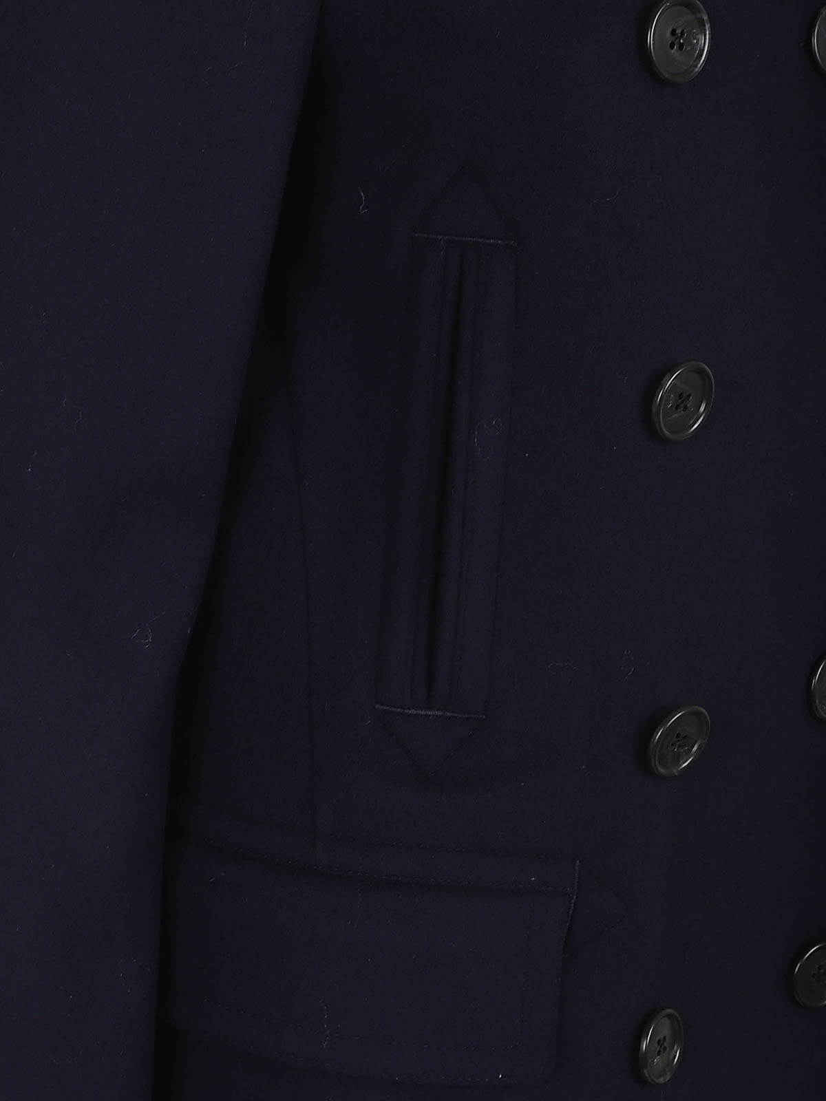 Wool picot, open collar, long sleeves, blue double-breasted, four pockets, two with flaps and one diagonal.