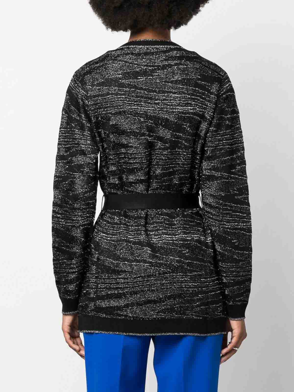 Metallic slub crochet-knit cardigan from missoni featuring black silver-tone knitted construction threading open long sleeves tied waist two patch pockets and straight hem the item you receive may differ slightly from the item photographed this is due to the artisanal nature with which all missoni products are constructed