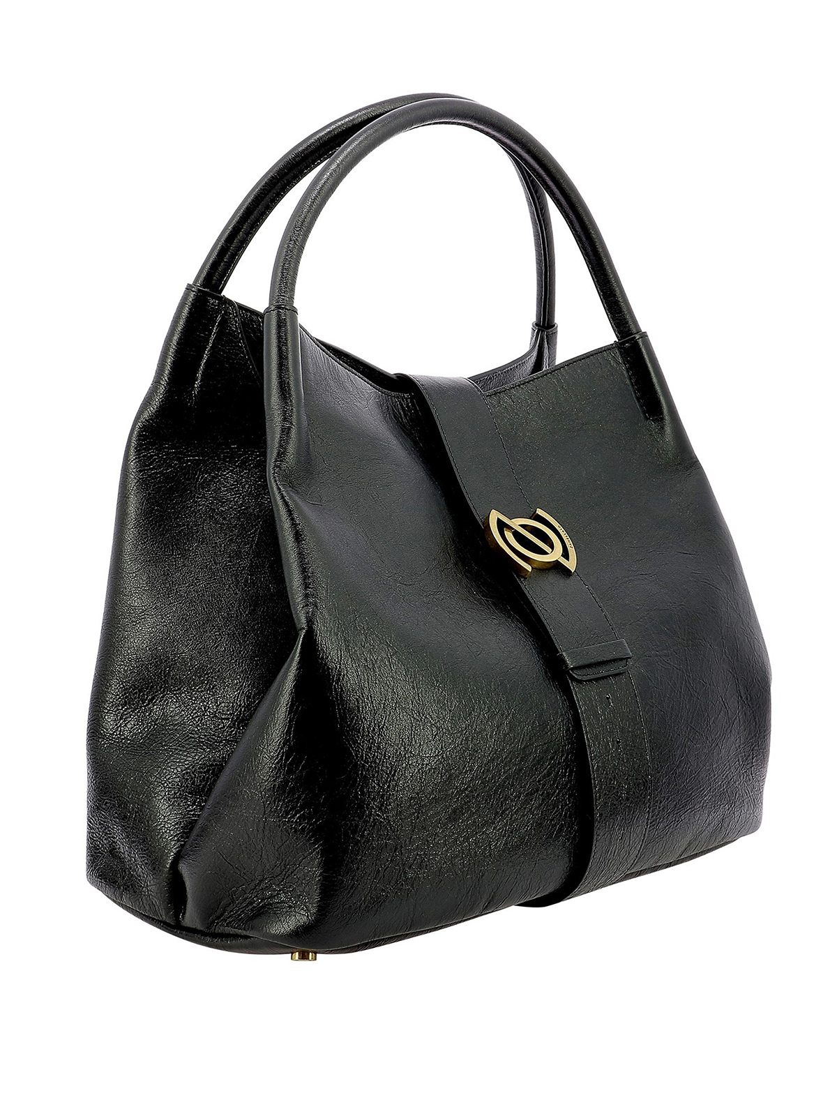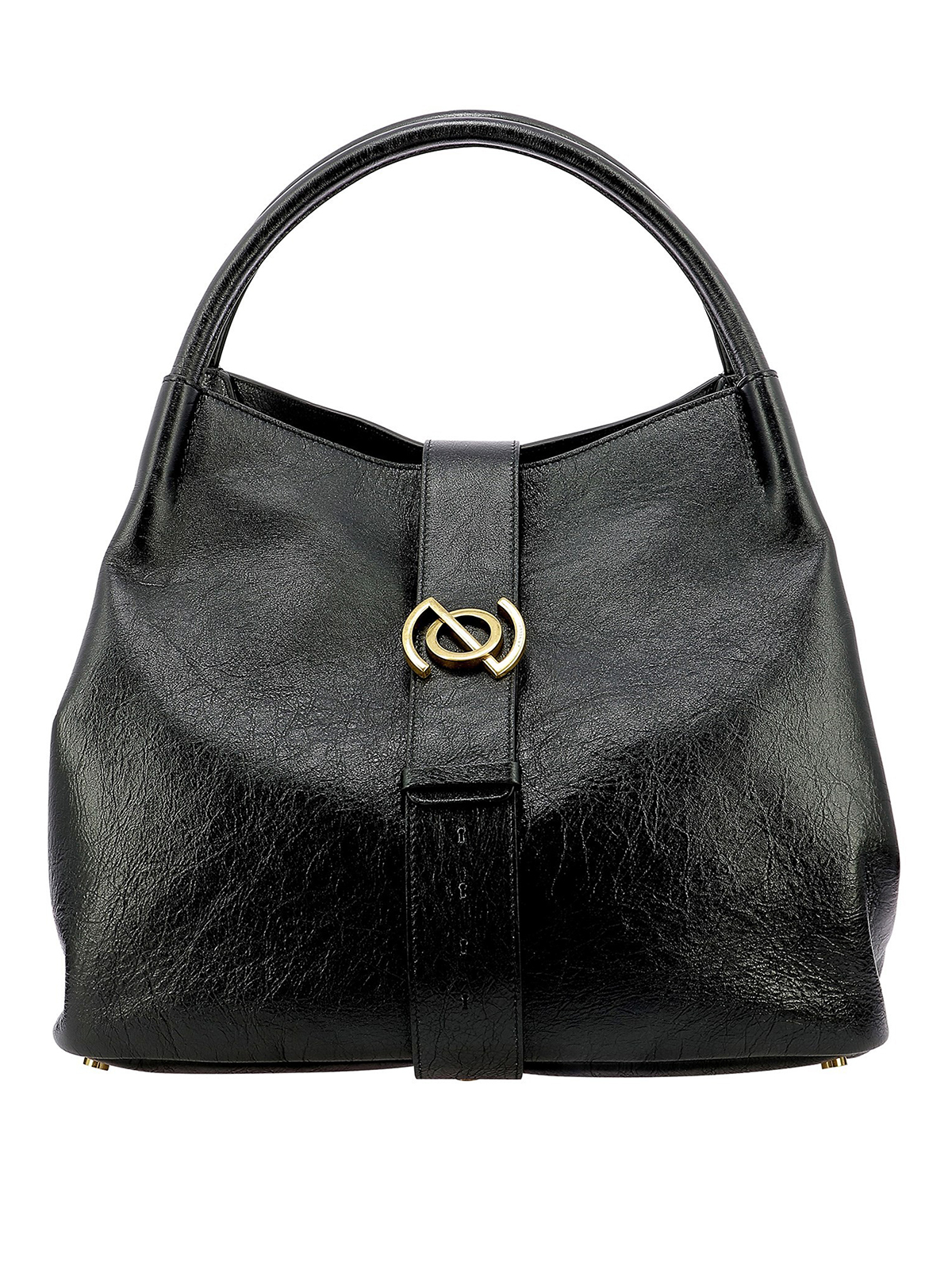 Crackled leather bag featuring adjustable buckle closure with gold-tone metal logo plaque, protective feet and inner zip pocket.