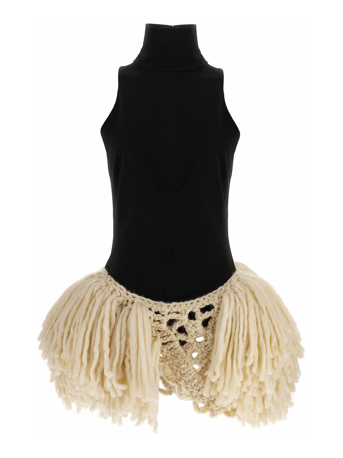Mini abito '01' in viscosa stretch, modello body con bottoni automatici sul fondo, collo alto, chiusura con zip posteriore, spettacolare gonna in lana lavorata all'uncinetto con frange esagerate e dettagli a trama larga che creano volume e movimento.