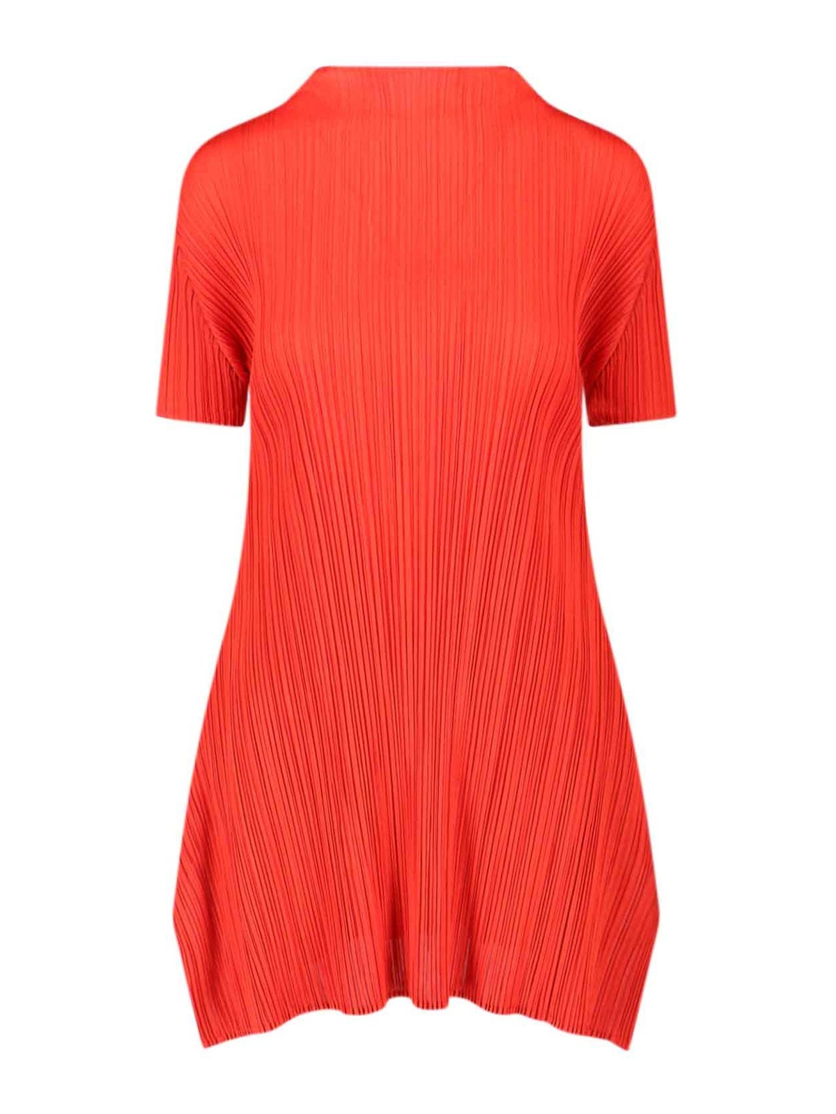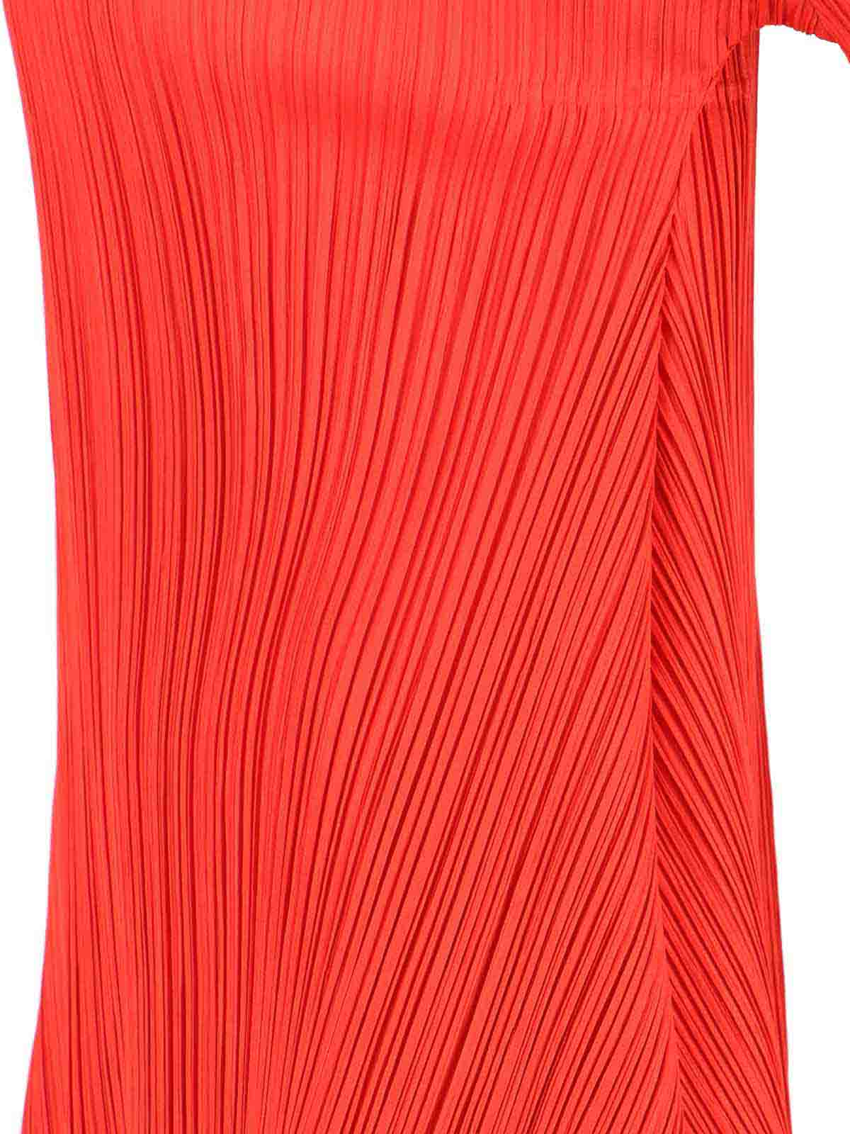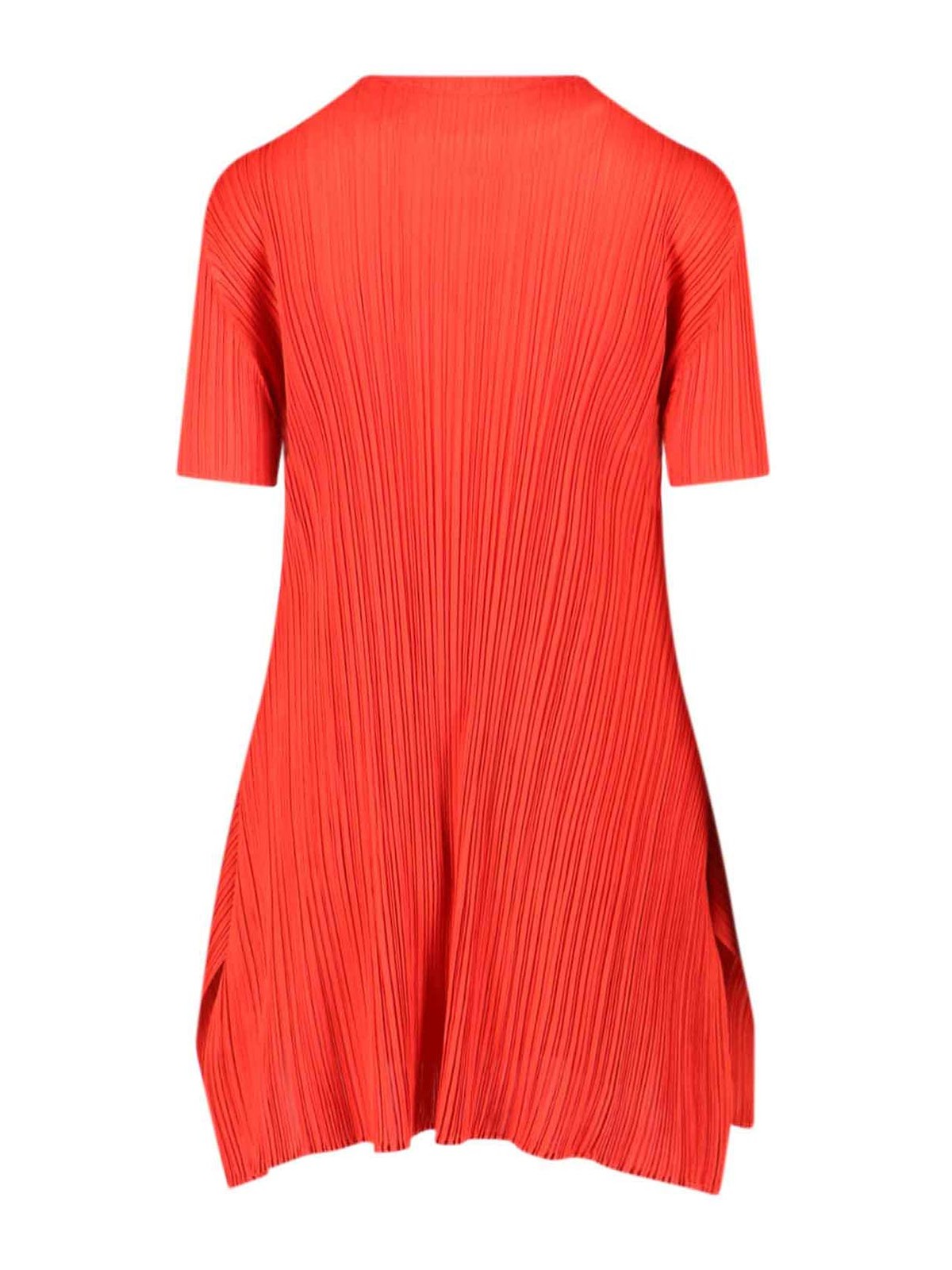 Abiti midi pliss pleats please, in tessuto rosso, girocollo, spalle scese, maniche corte, spacchi laterali su fondo, orlo curvo.