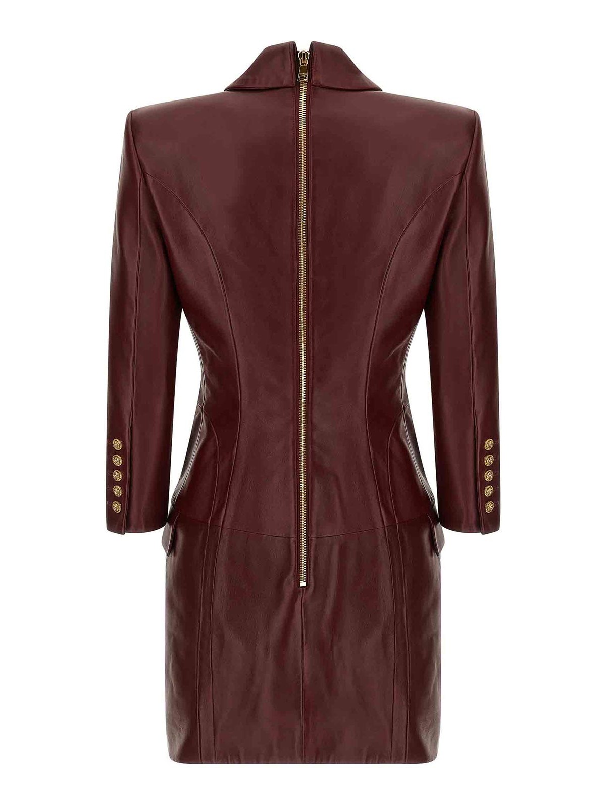 Miniabito in pelle con modello blazer doppiopetto, revers a lancia, tasche con patta, tracolla imbottita, maniche lunghe e chiusura con cerniera sul retro.