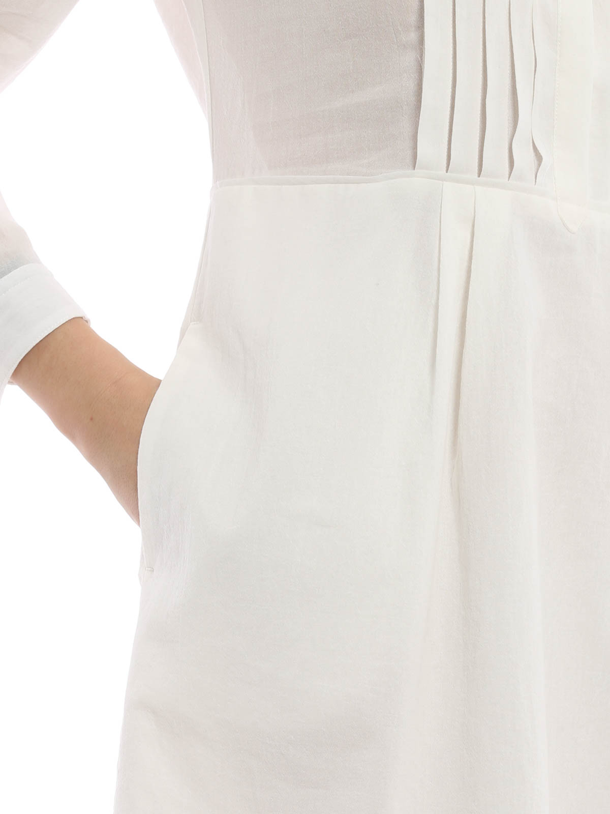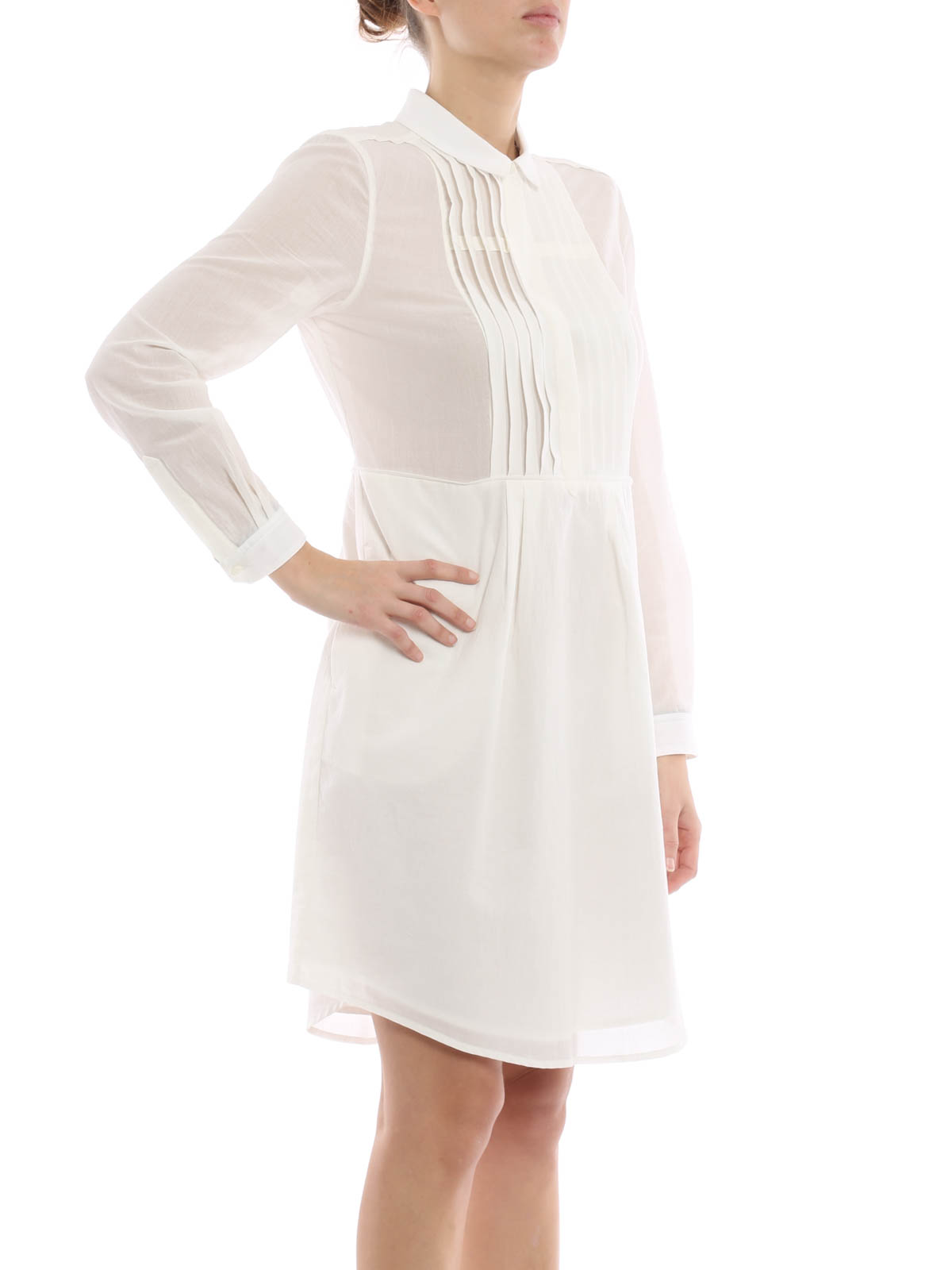 Abito chemisier in cotone, lunghezza al ginocchio, con maniche lunghe con polsini, corpetto plissettato e gonna svasata.