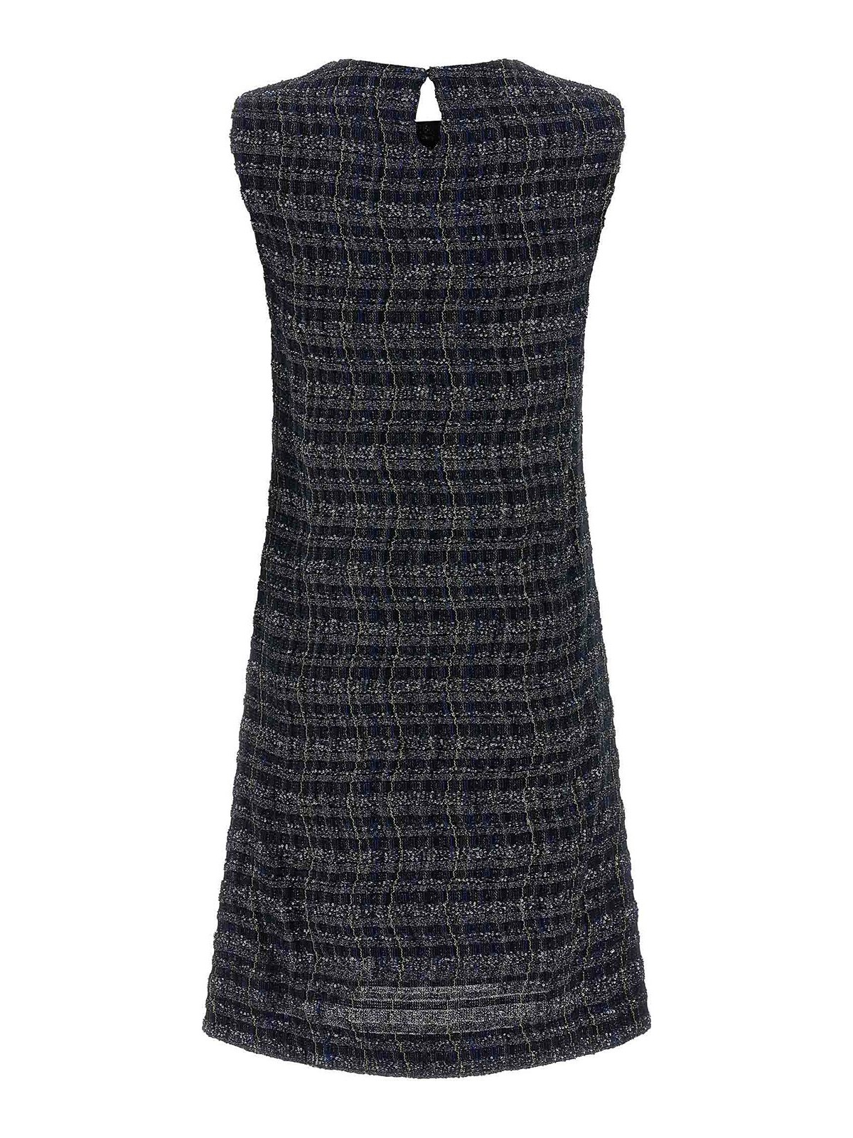 Mini abito in misto viscosa con filamenti di lam e struttura operata di caperdoni con motivo ad onde check, linea svasata, senza maniche, girocollo con chiusura posteriore con bottoni e dettaglio cut-out a goccia, foderato.