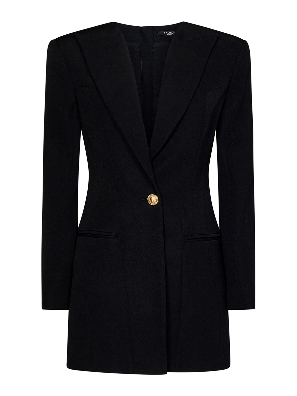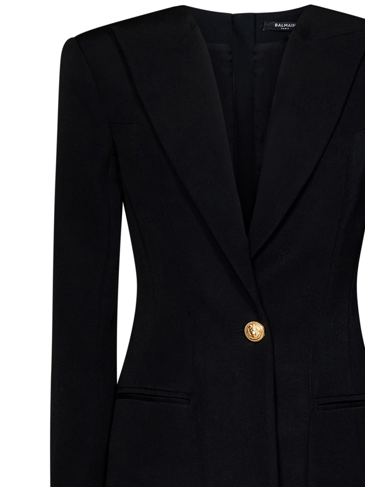 Xl chiusura con zip dorata sul retro e bottone goffrato oro sul davanti spalle in evidenza scollo a v ampio risvolto a punta tasche laterali a filo spacco con abbottonatura sul fondo delle maniche taglio corto e sciancrato 100% lana