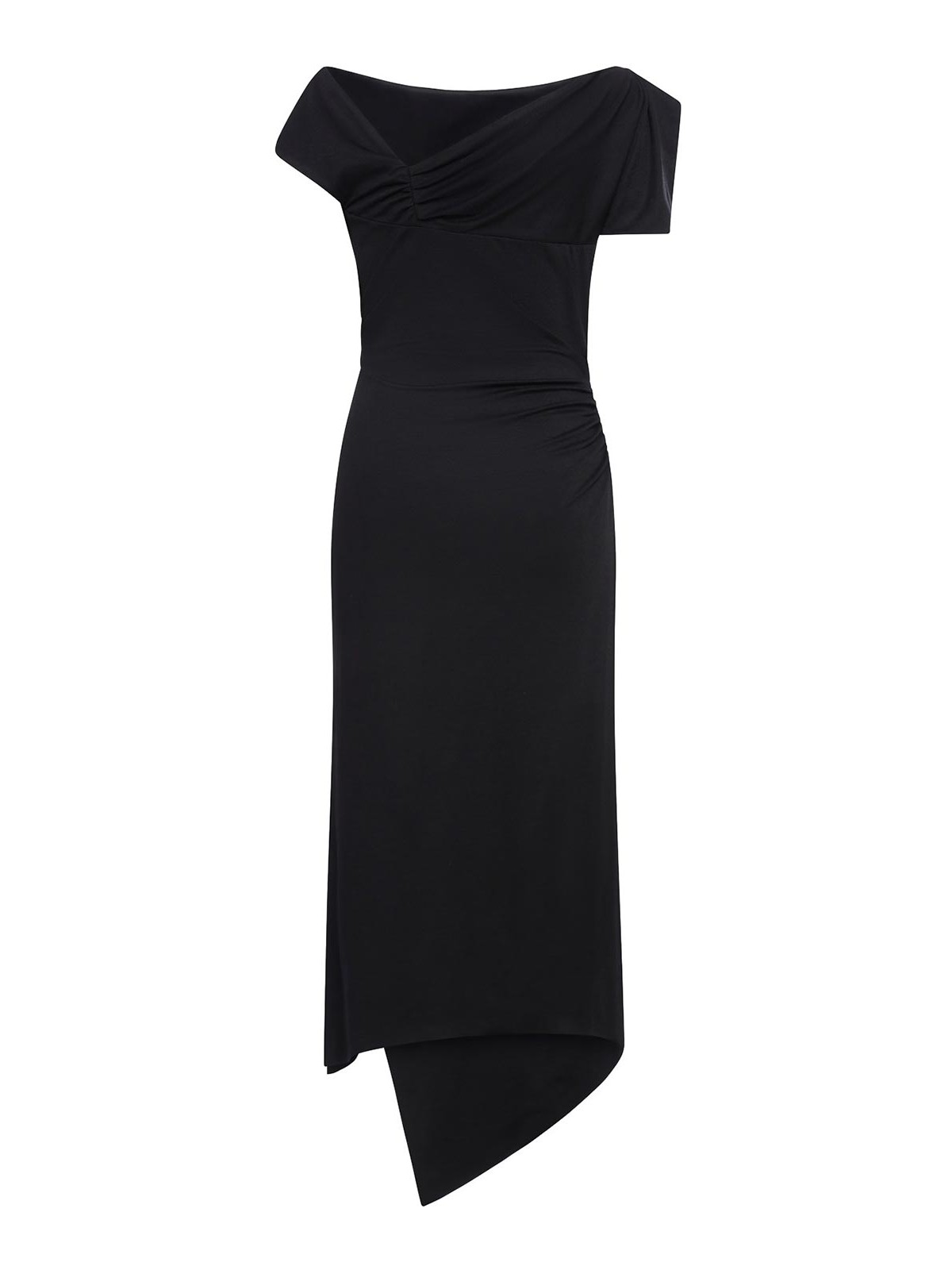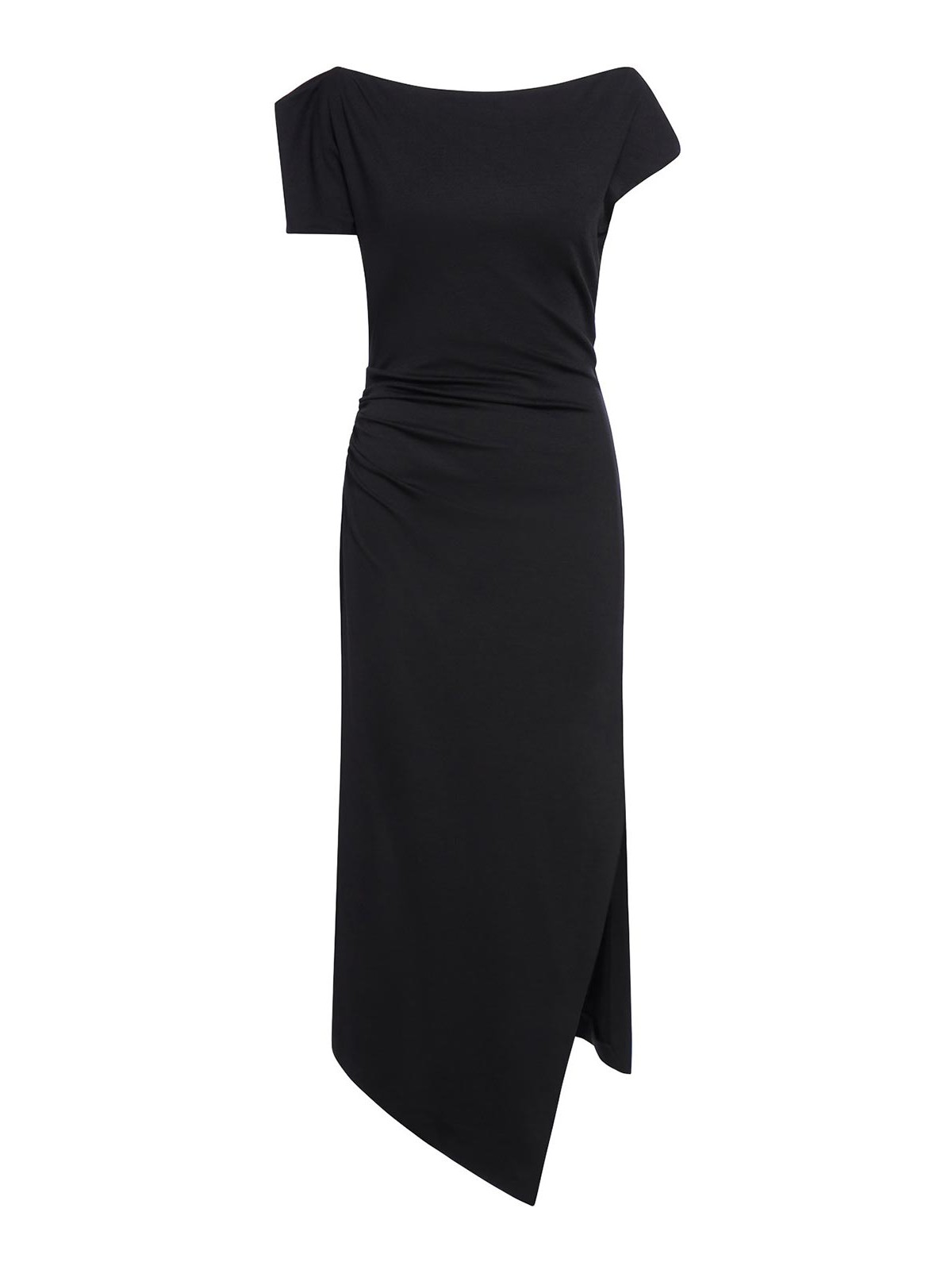 Abito midi elasticizzato scollo asimmetrico maniche corte drappeggio sul punto vita spacco laterale con zip nascosta