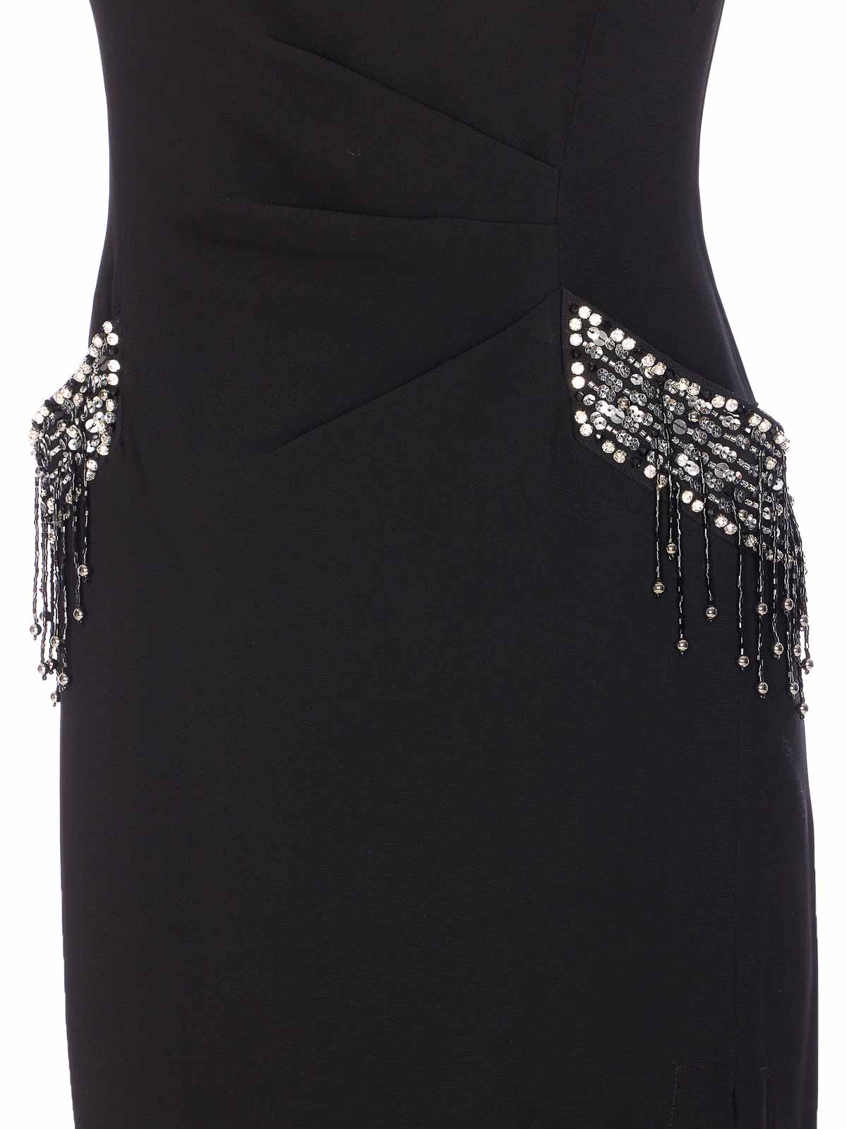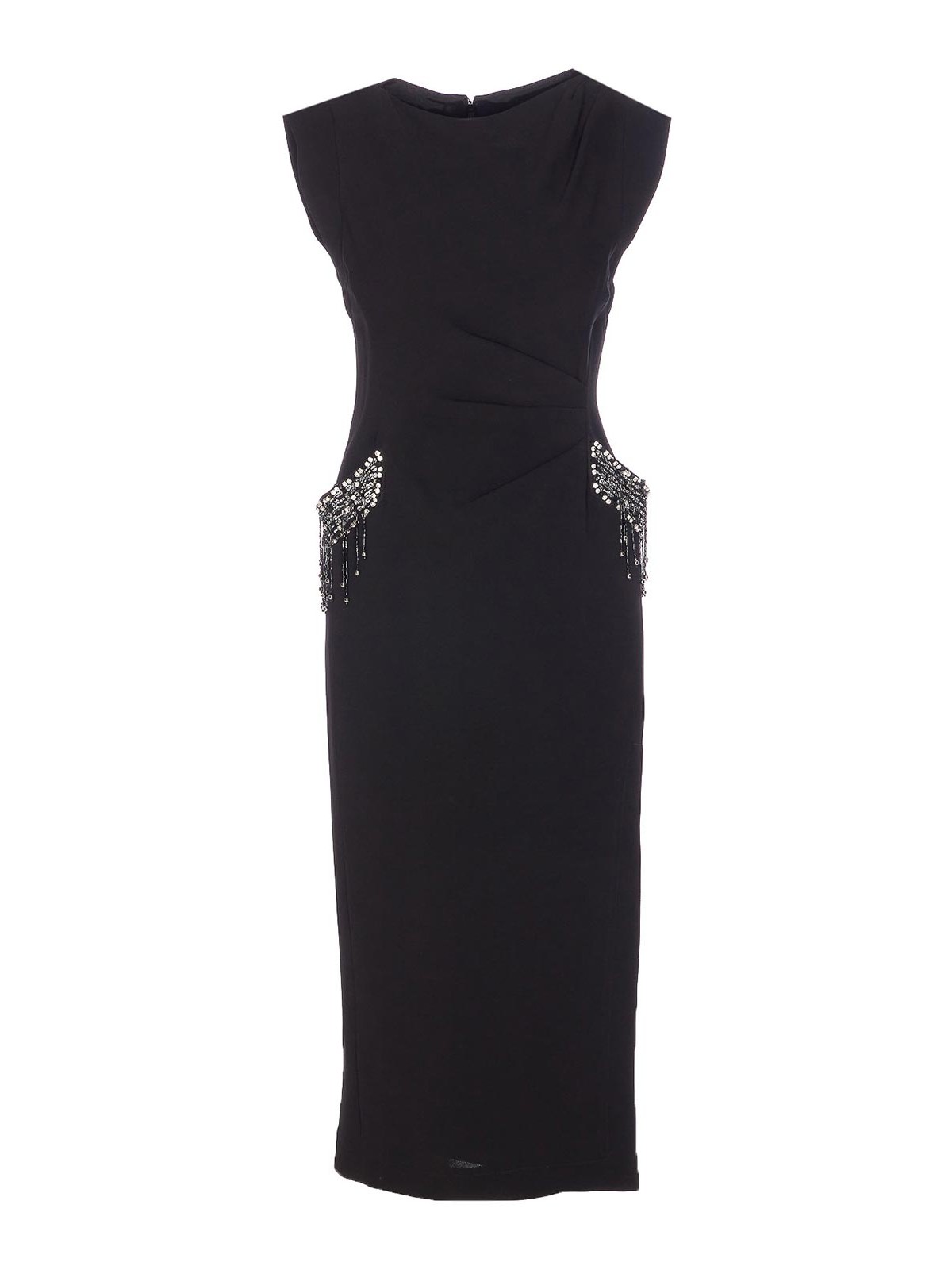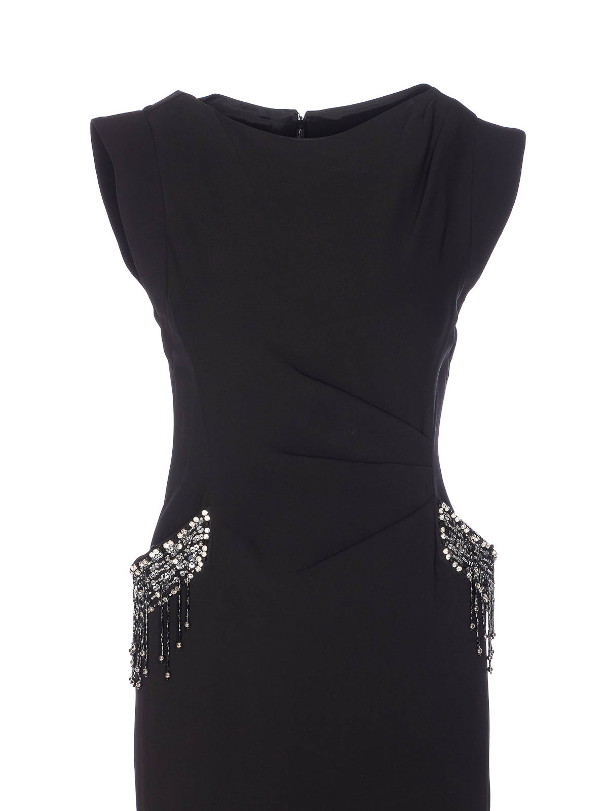 Abito Pinko nero freccette, chiusura con zip e gancio sul retro, girocollo, senza maniche, dettagli in paillettes e applicazioni, modello midi, spacco laterale