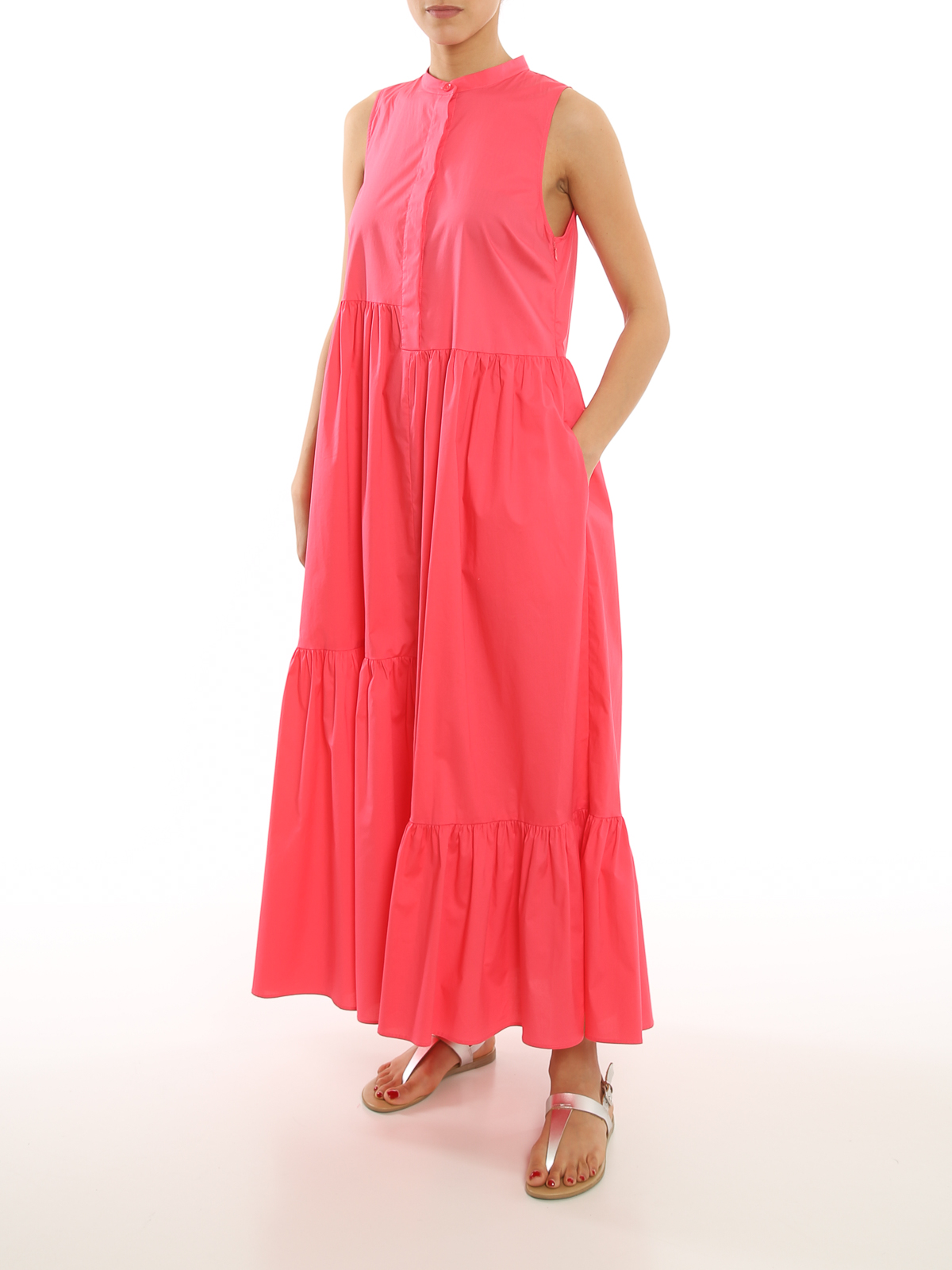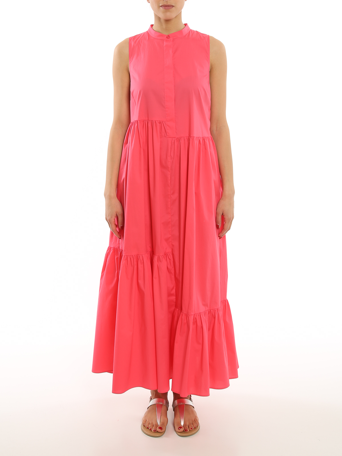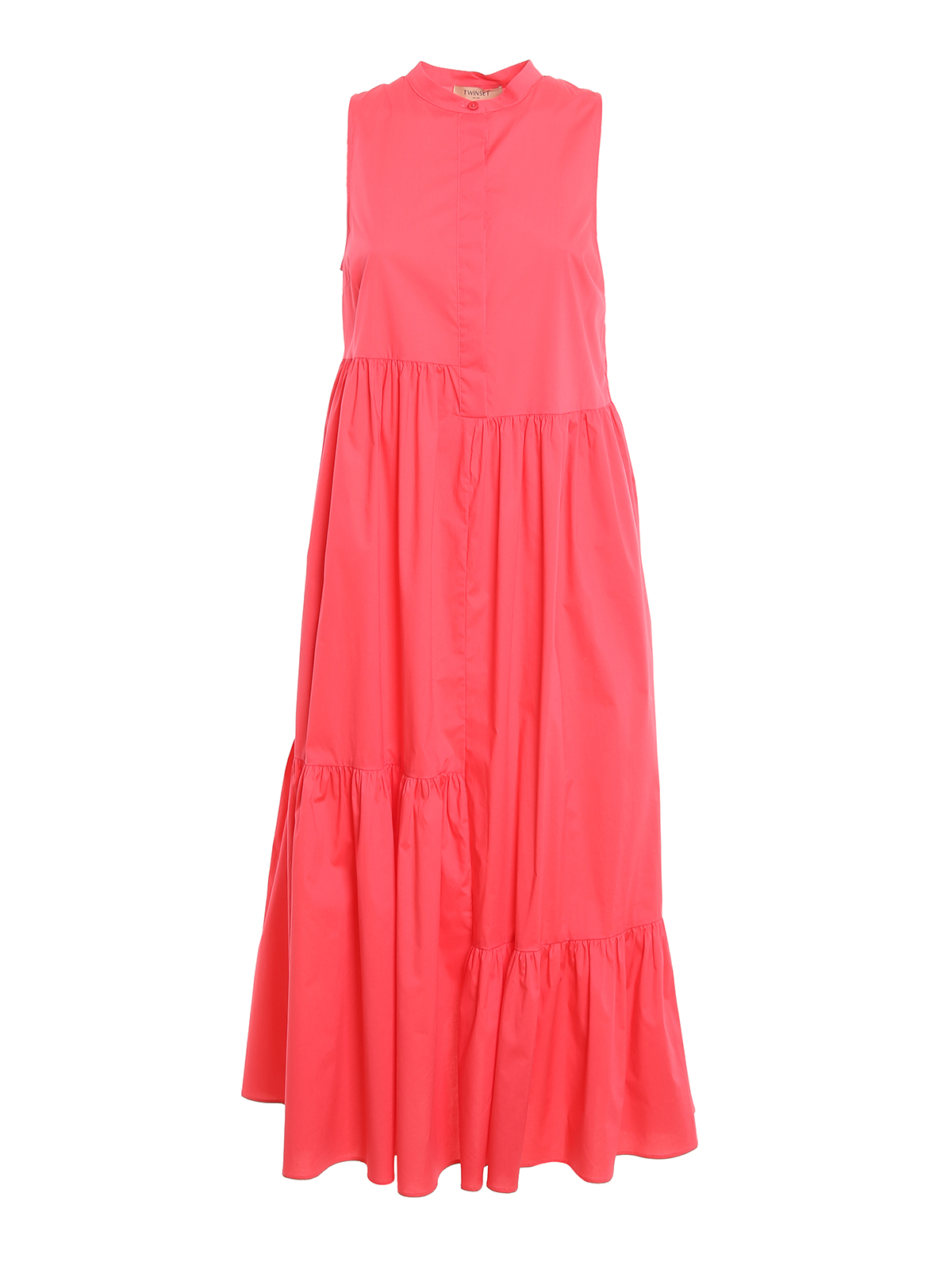 Abito midi in popeline di cotone stretch con colletto alla coreana e balze asimmetriche.
