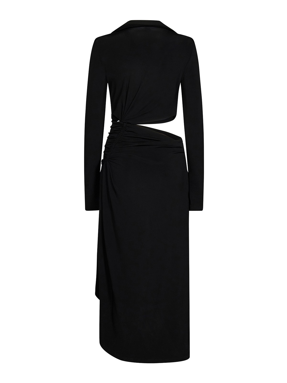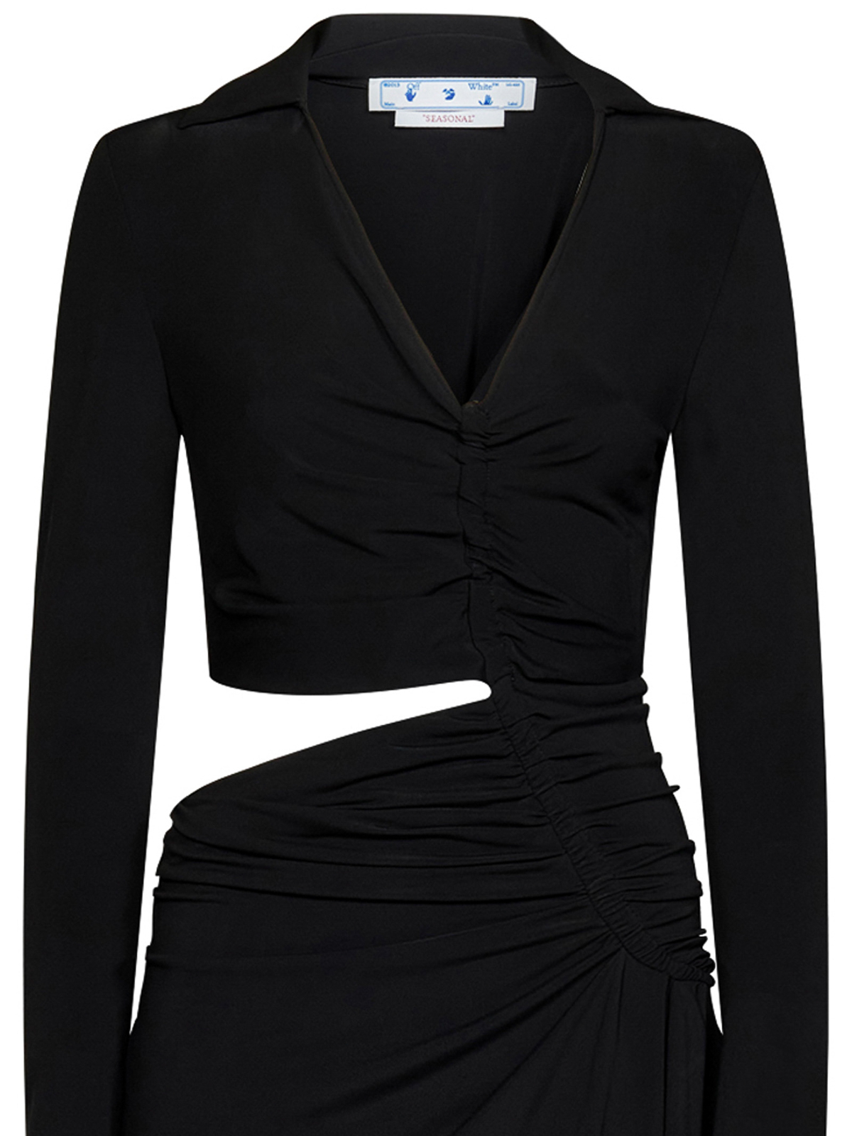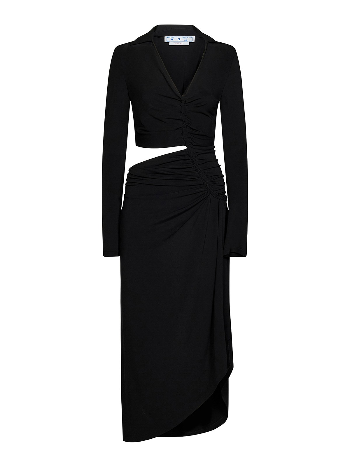 Scollo a V collo a punta maniche lunghe fondo asimmetrico cut out in vita all over drappeggio spacco laterale taglio midi colore nero 95% viscosa 5% elastan l'articolo in foto corrisponde ad una taglia it