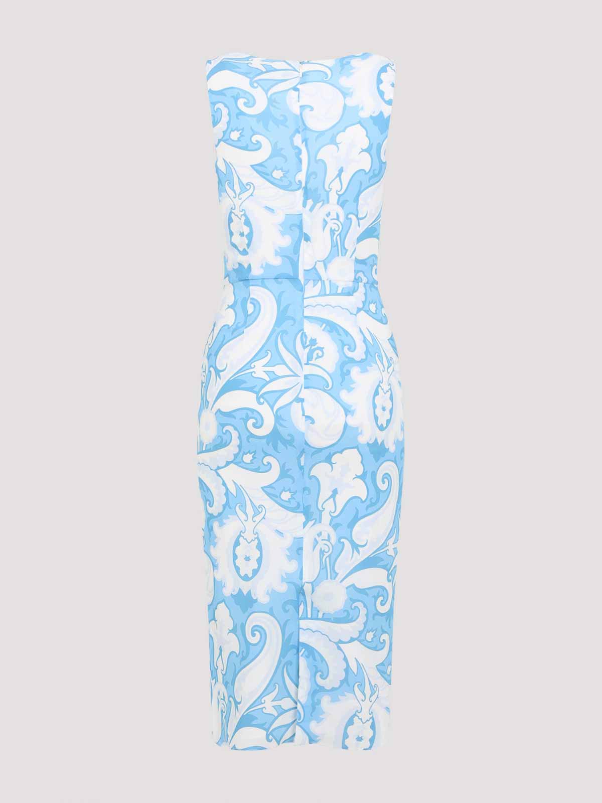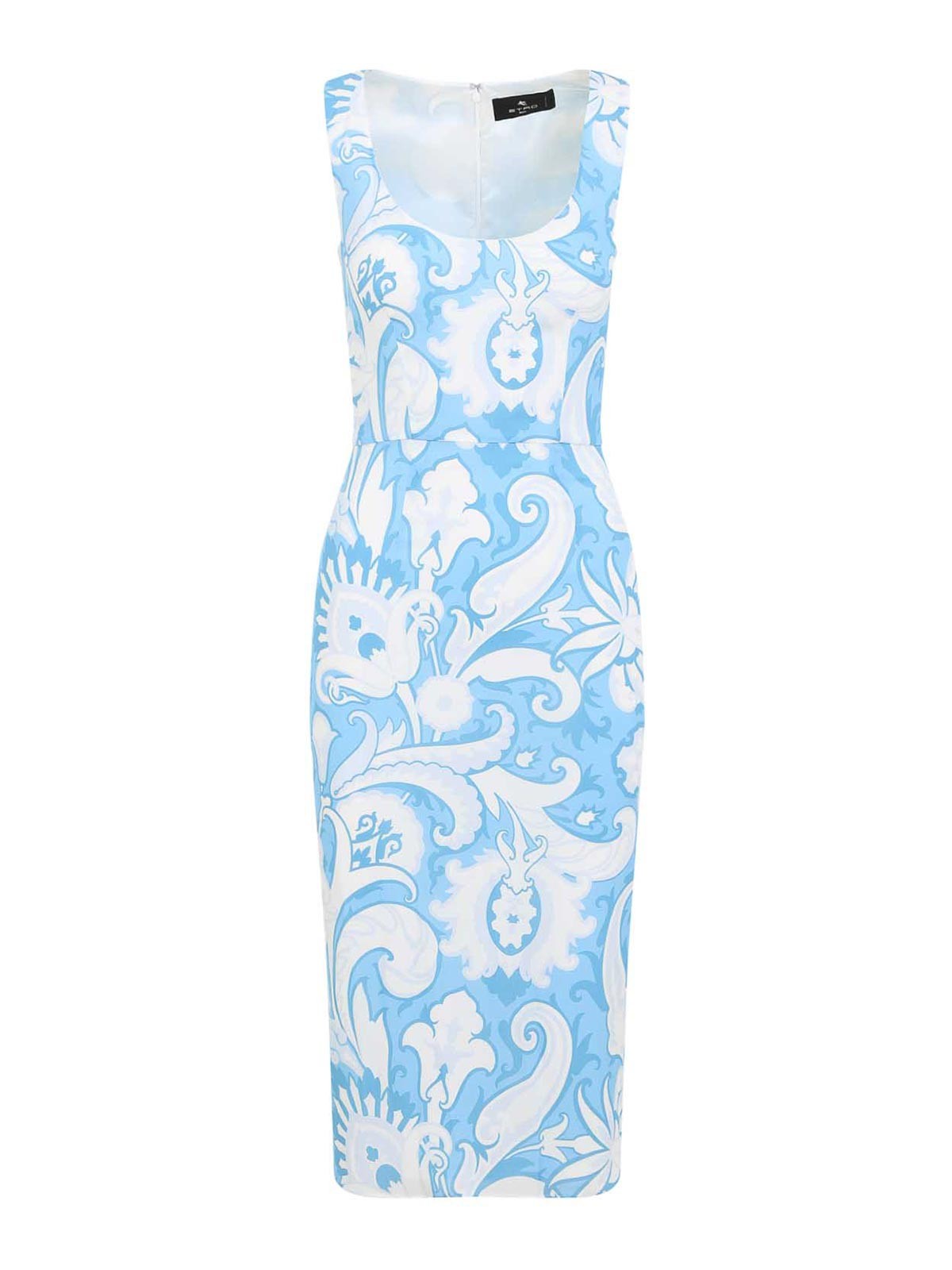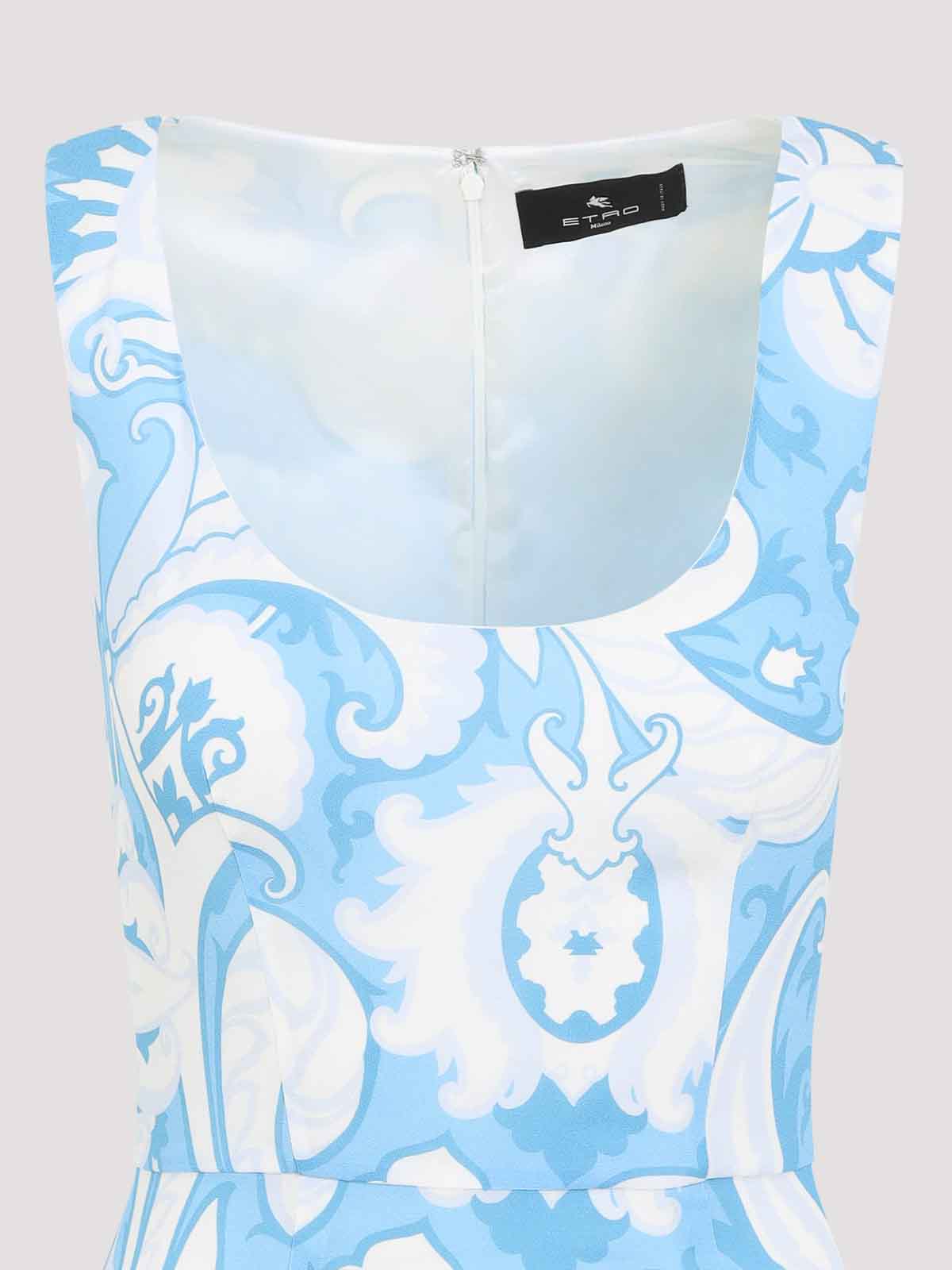 Abito midi in viscosa celeste stampato da Etro. Realizzato in viscosa elasticizzata celeste, con stampa bianca a contrasto su tutta la superficie. Scollo rotondo aperto, senza maniche, vita aderente, spacco centrale sul retro, orlo dritto.