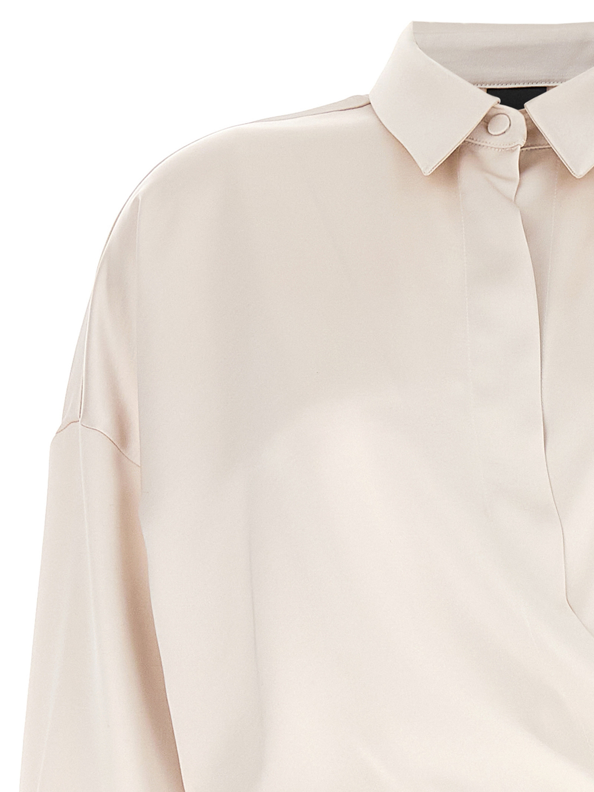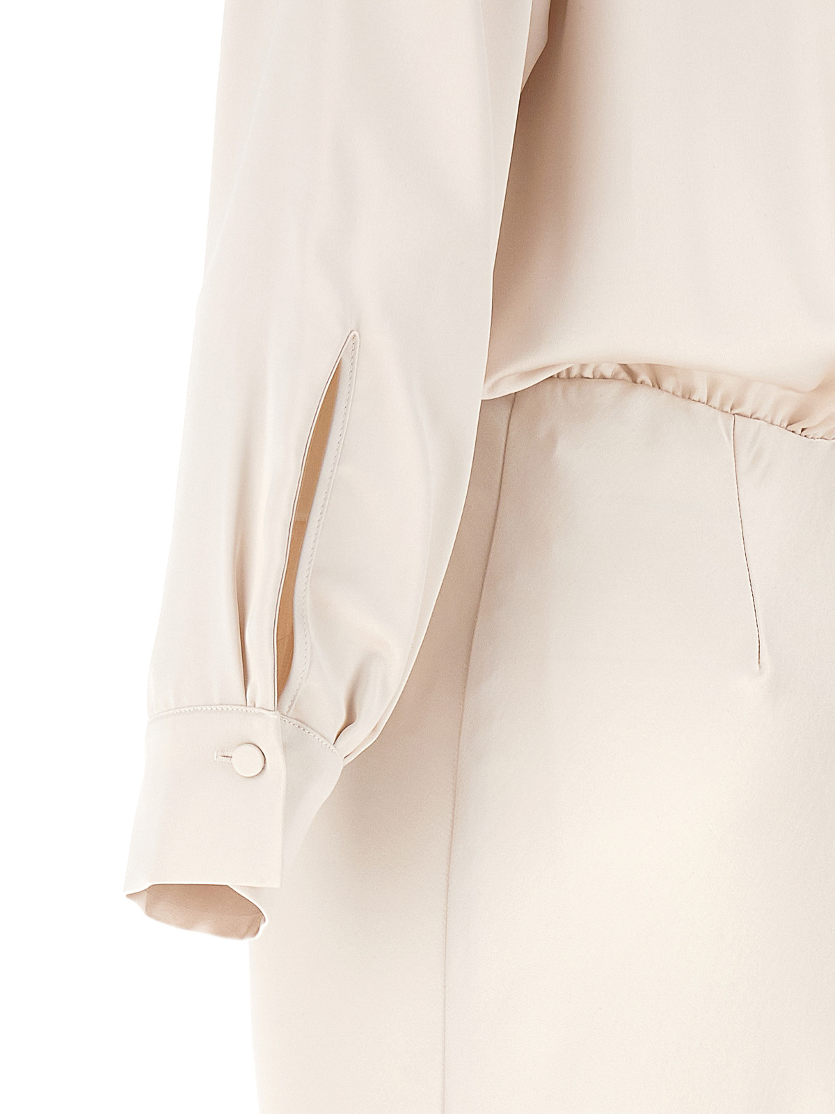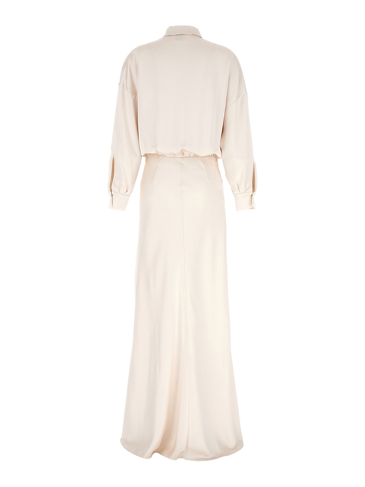 Abito attivita in raso con chiusura frontale con bottoni dettaglio cut out elastico in vita maniche lunghe con risvolto e ampio spacco frontale