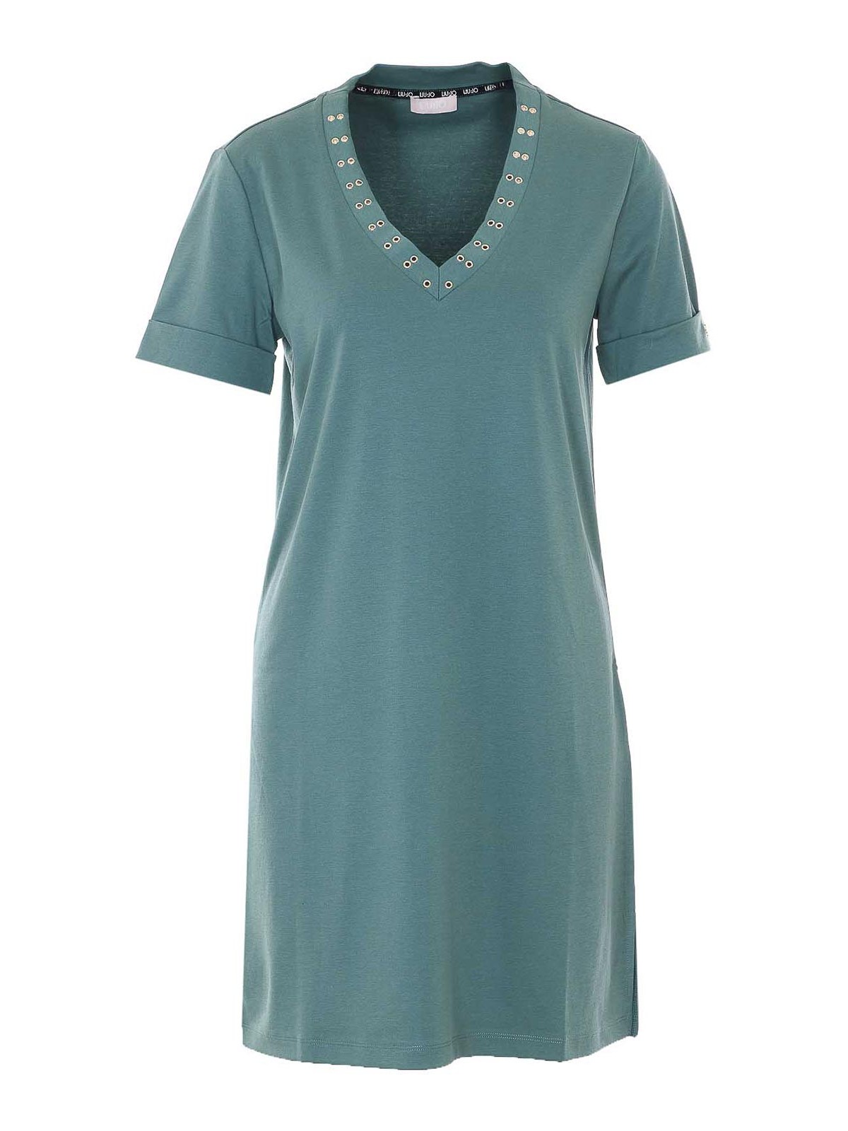 Abito verde Liu jo, scollo a v, dettagli sul colletto, modello mini, maniche corte