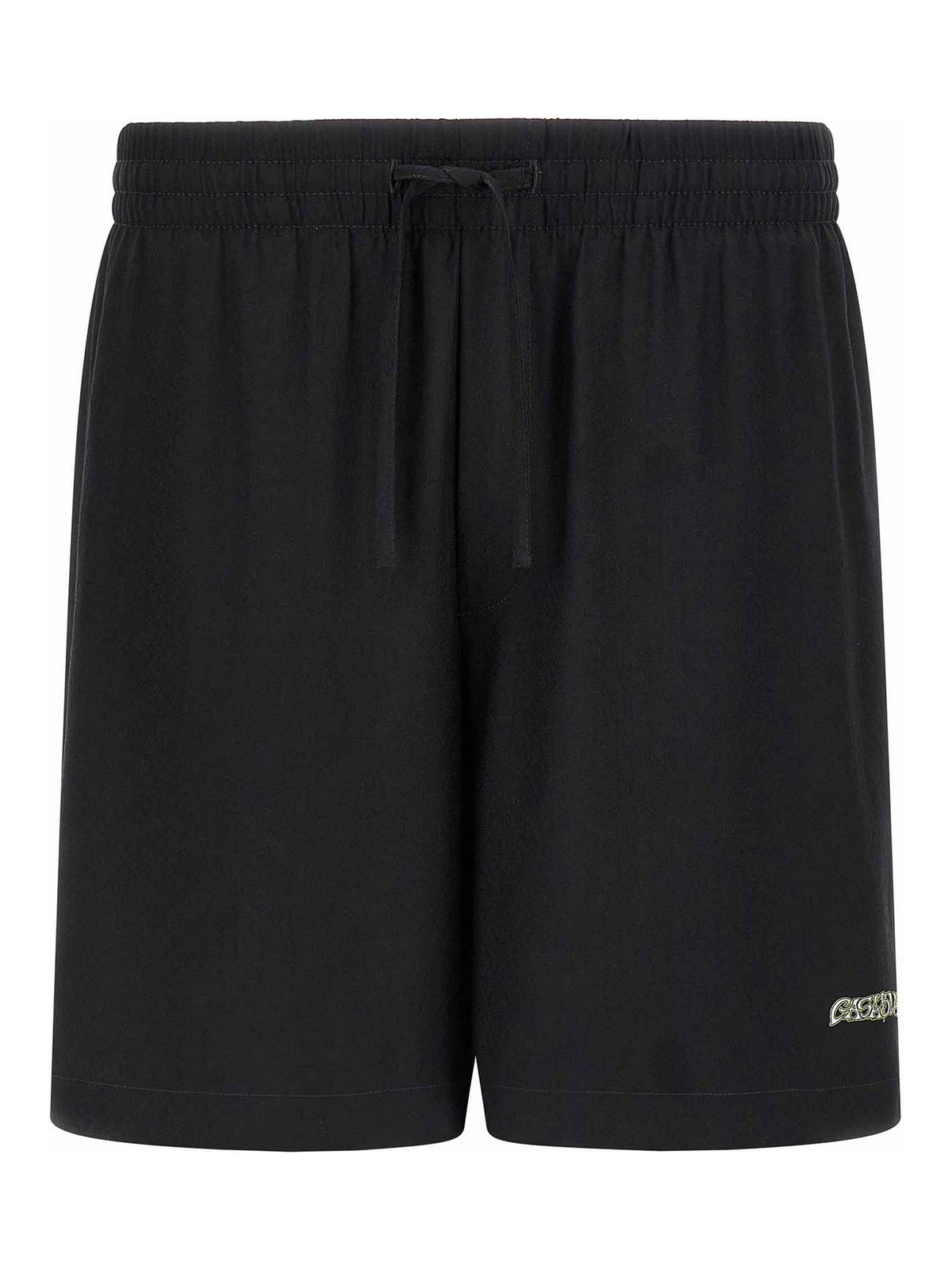 Bermuda in seta monogram jacquard, stampa logo davanti, stampa 'vulcano' dietro, coulisse in vita elastica, patta trompe l'oeil, tasche.