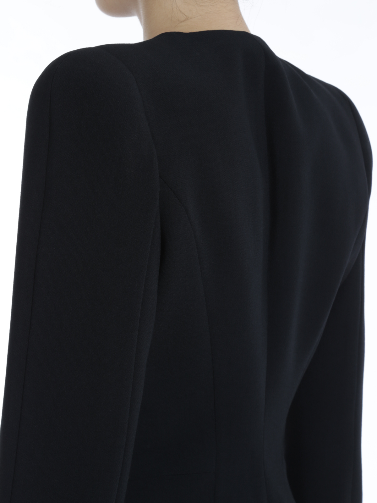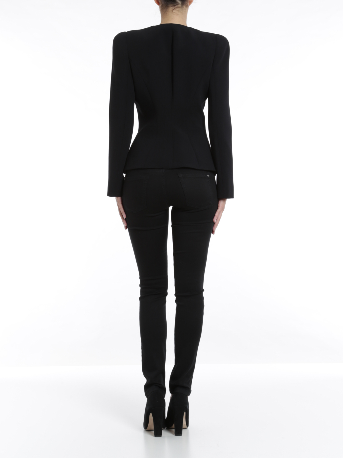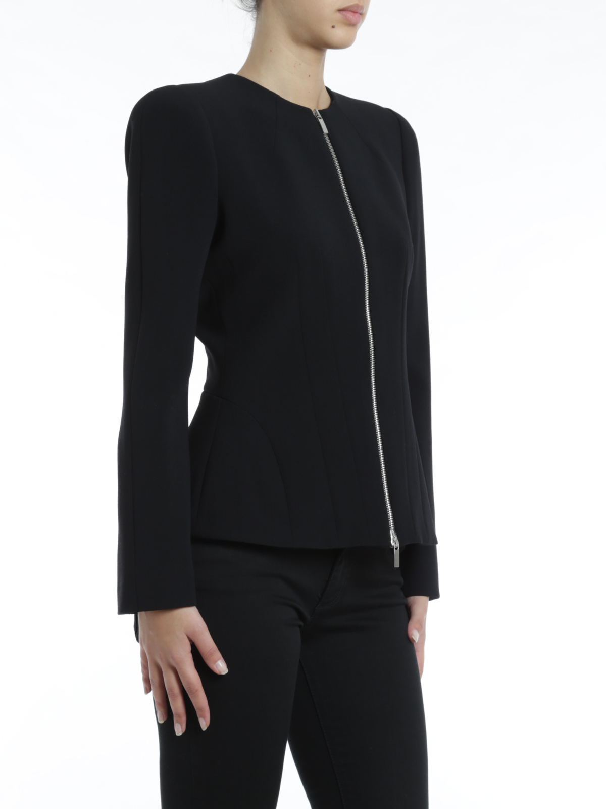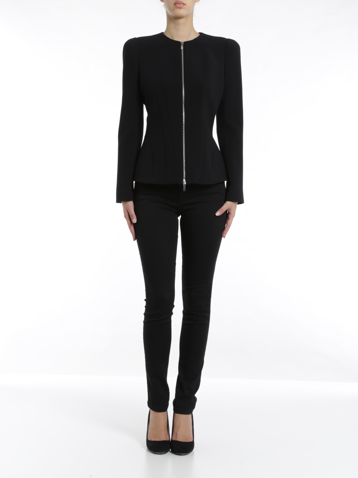 Blazer in misto lana con pinces che le conferiscono una silhouette avvitata e un effetto peplo sul fondo tipico di molti articoli del brand. Girocollo. Chiusura con zip, manica lunga. Fodera in raso. Da indossare con pantalone e decolleté a punta stretta.