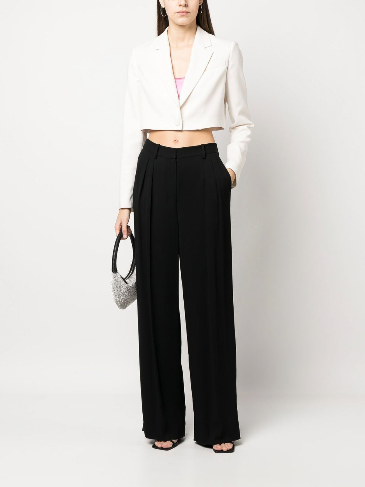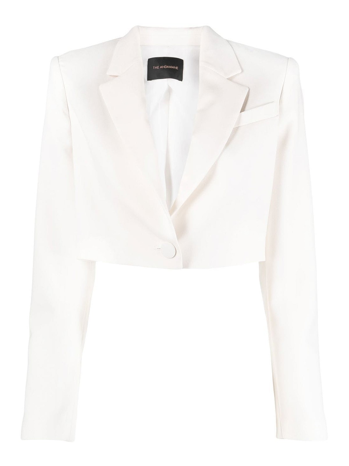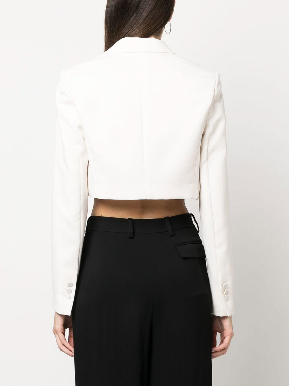 Blazer crop in crêpe di raso loulou bianco con revers a lancia, spalline imbottite, tasca applicata sul petto, chiusura frontale con bottoni, maniche lunghe, orlo dritto e crop.