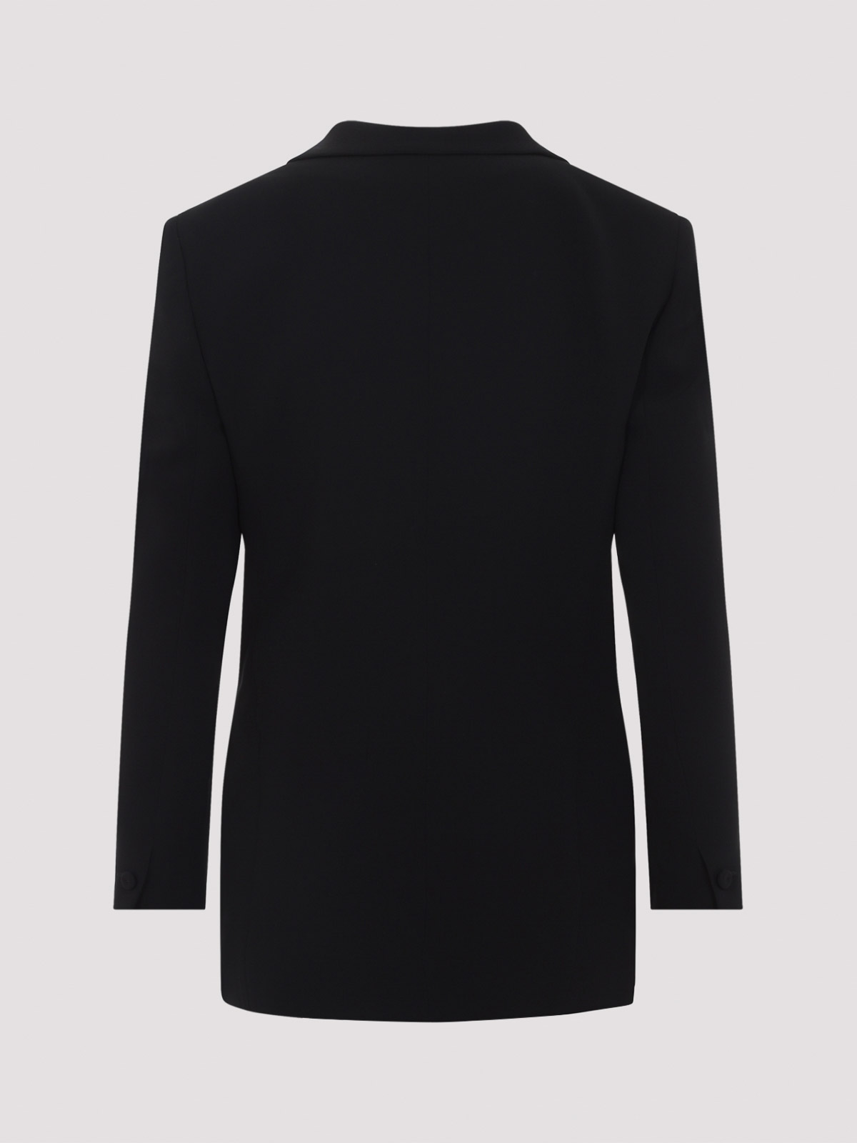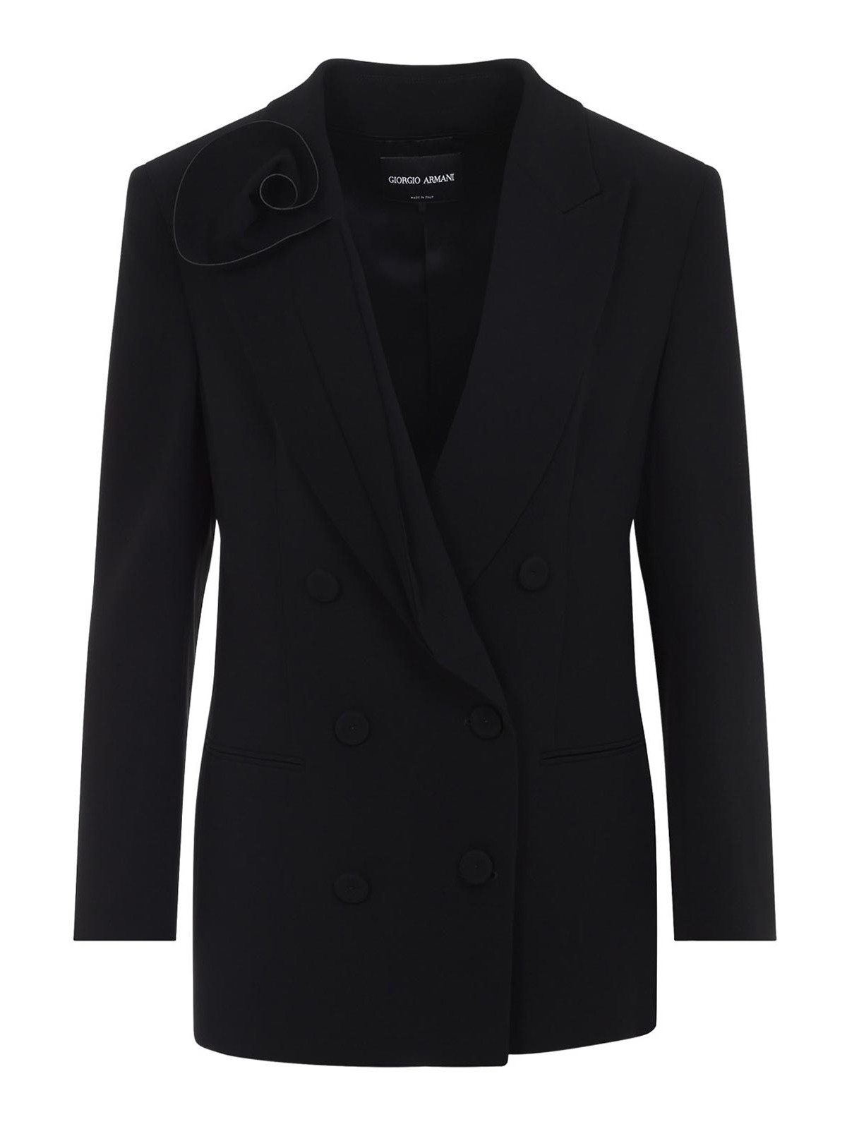 Blazer in seta nera Giorgio Armani Beauty. blazer in pura seta nera, colletto classico, decorazione laterale con dettaglio onda 3d tono su tono, chiusura frontale con bottoni, design doppiopetto, tasche laterali, maniche lunghe, polsini con bottoni, orlo dritto, fodera interamente tono su tono.