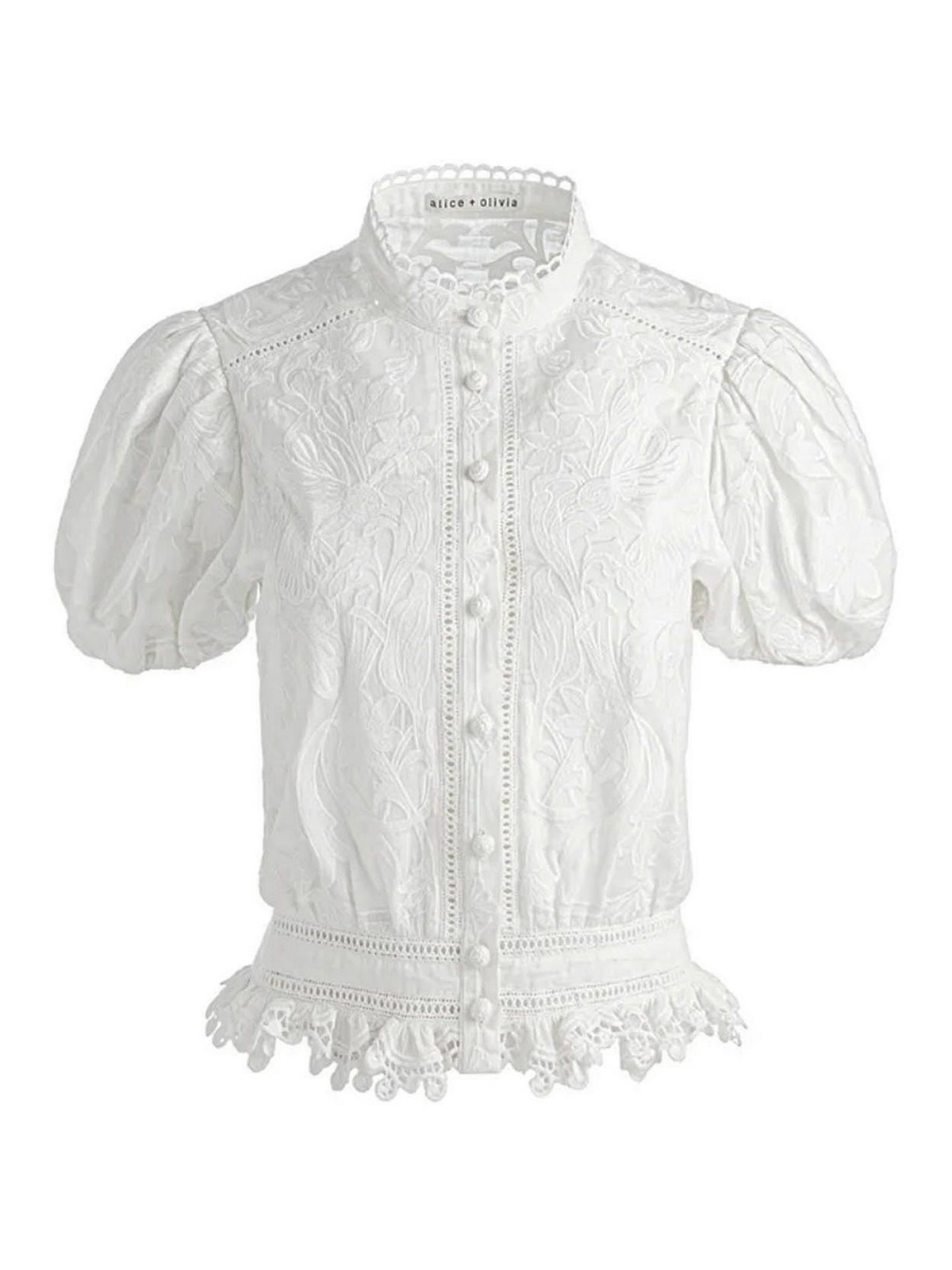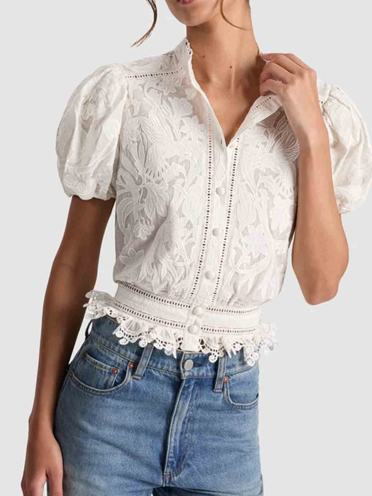 Blusa con bottoni in voile di cotone riccamente ricamato, maniche a sbuffo, abbottonatura frontale, bottoni rivestiti, design corto. composizione 100% cotone