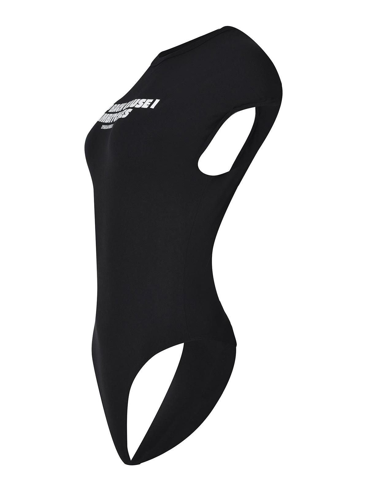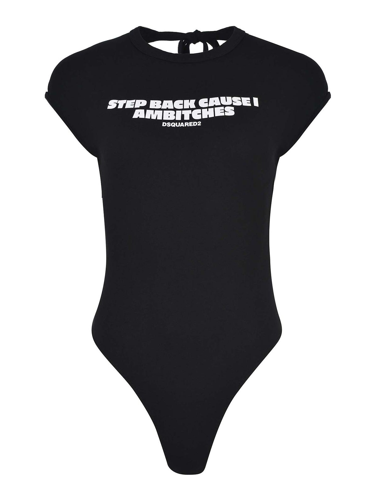 Body Dsquared2 realizzato in cotone nero, girocollo, maniche corte, scritta logo e lettering a contrasto sul petto, schiena scoperta, lacci da annodare sul retro del collo, chiusura al fondo con bottoncino, 100% cotone made in Italy