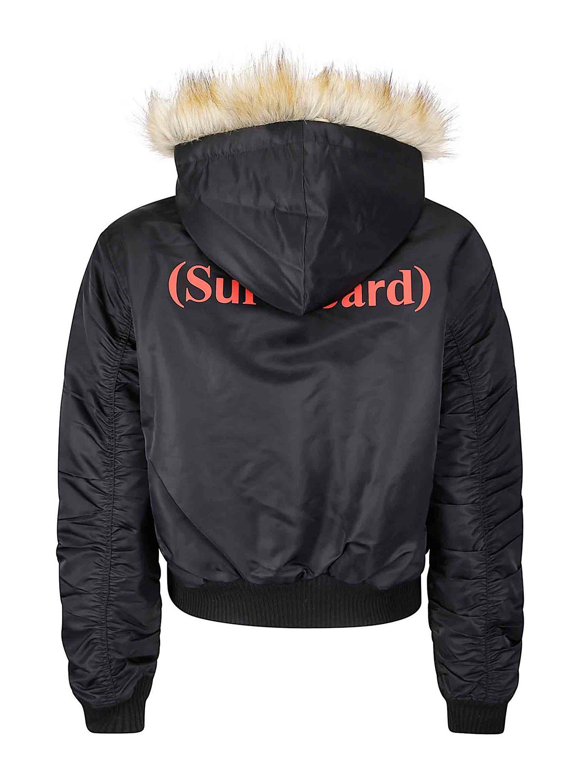 Bomber con cappuccio con pelo, chiusura con zip, due tasche frontali, stampa posteriore, vestibilita' ampia.