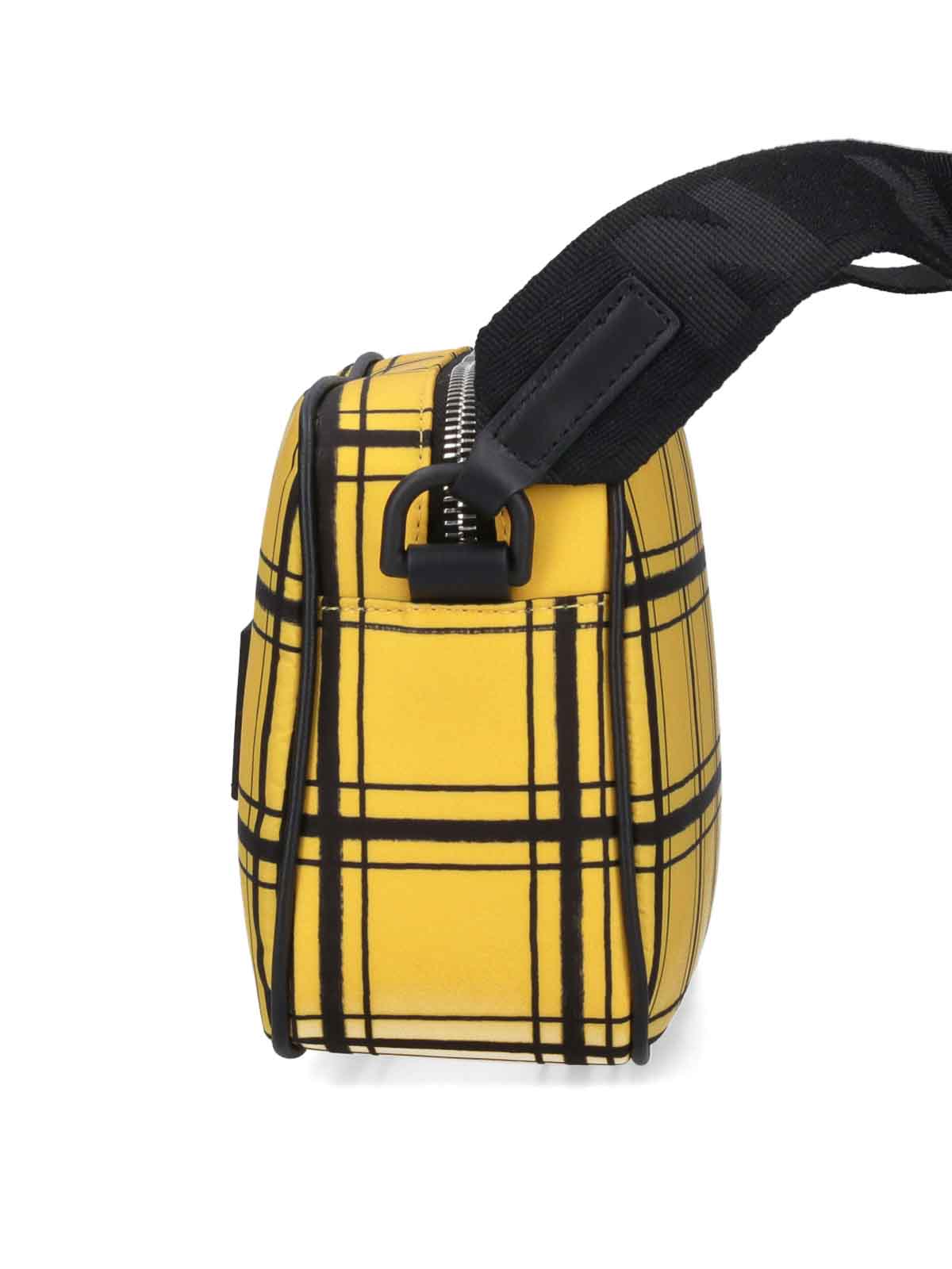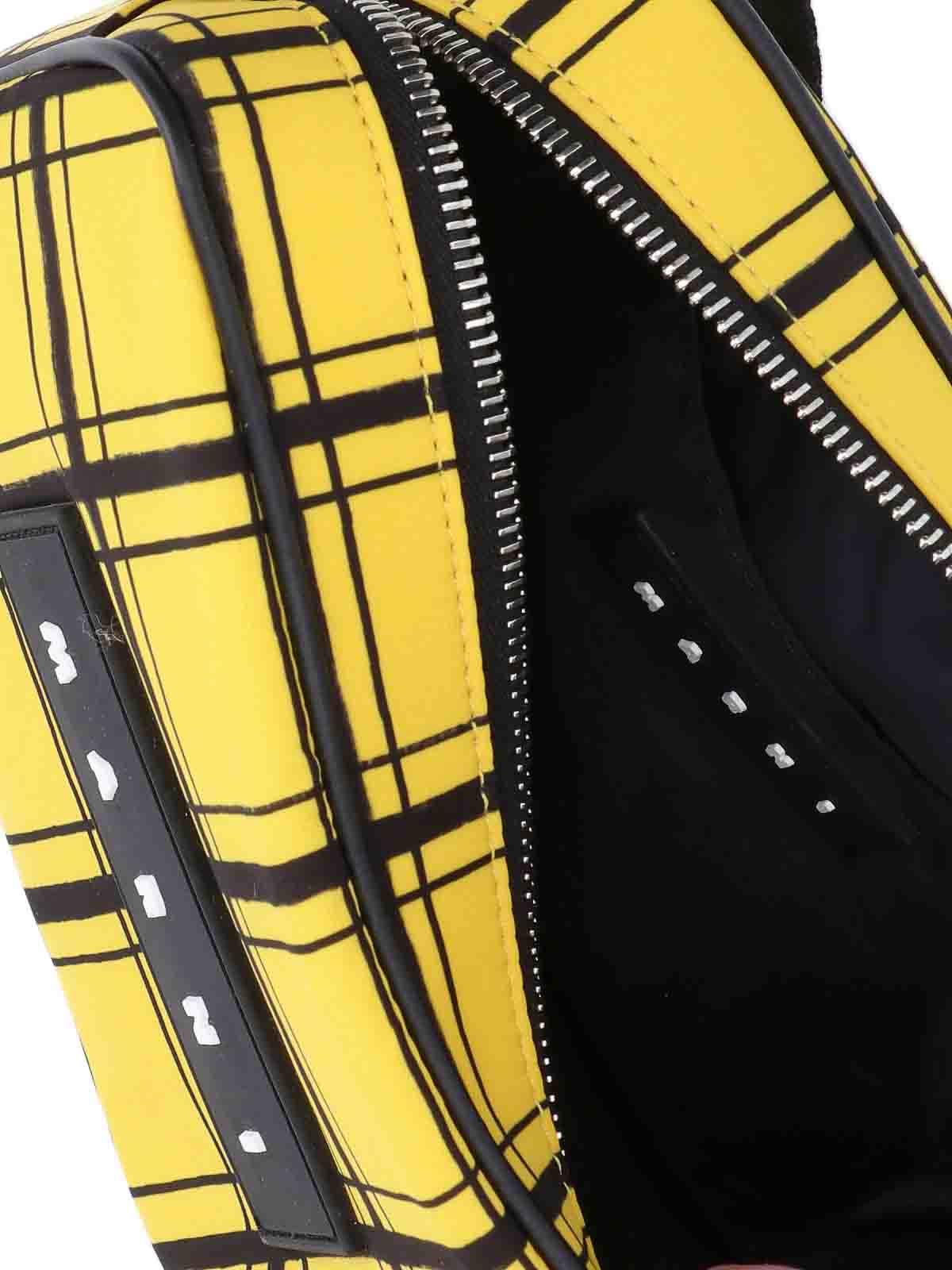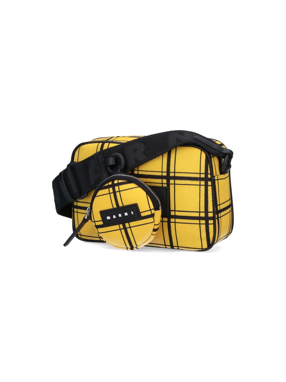 Borsa camera puff marni in giallo motivo a quadri neri all-over zip regolabile patch logo fronte portamonete rotondo rimovibile una tasca piatta interna uno scomparto principale