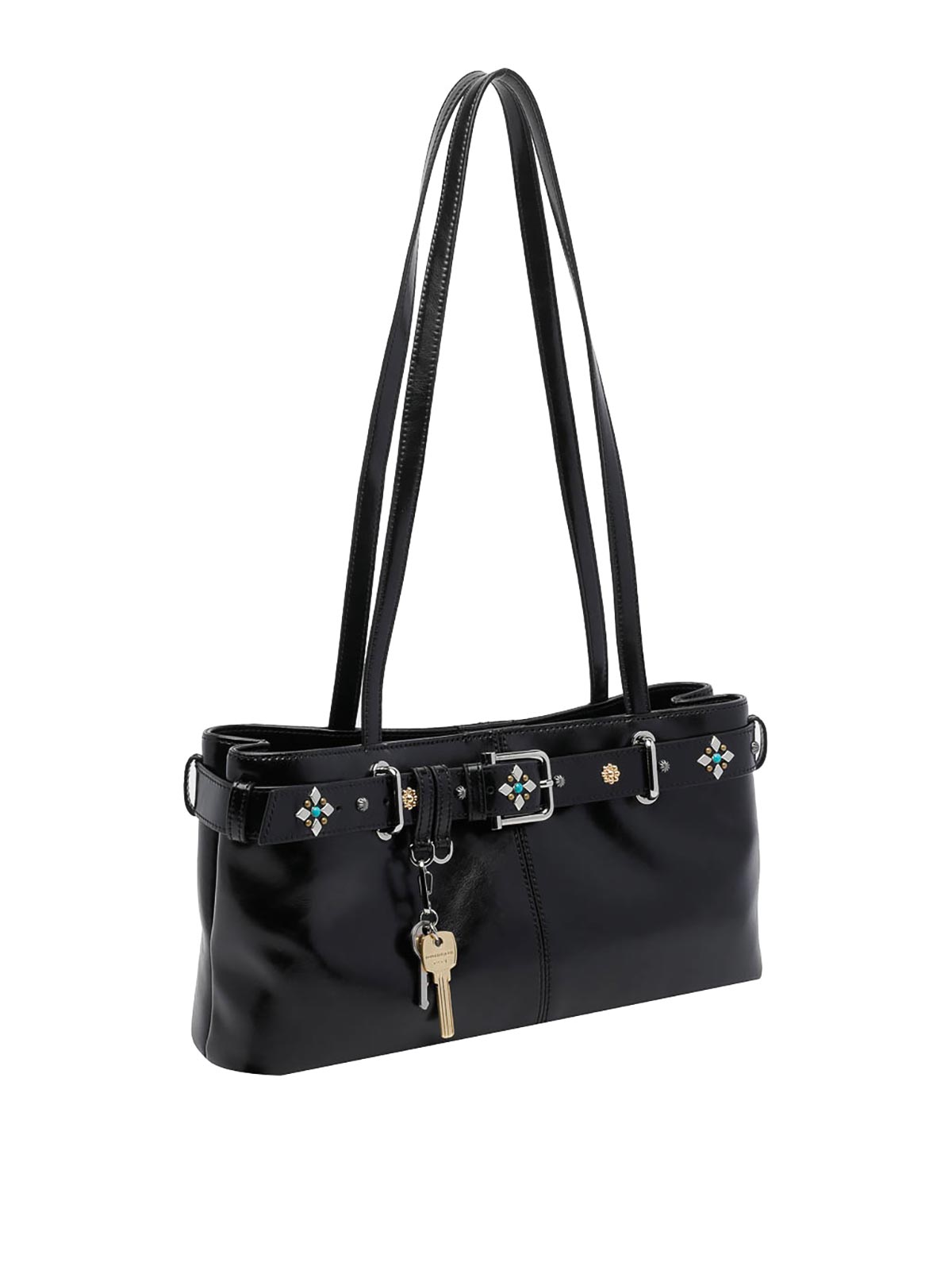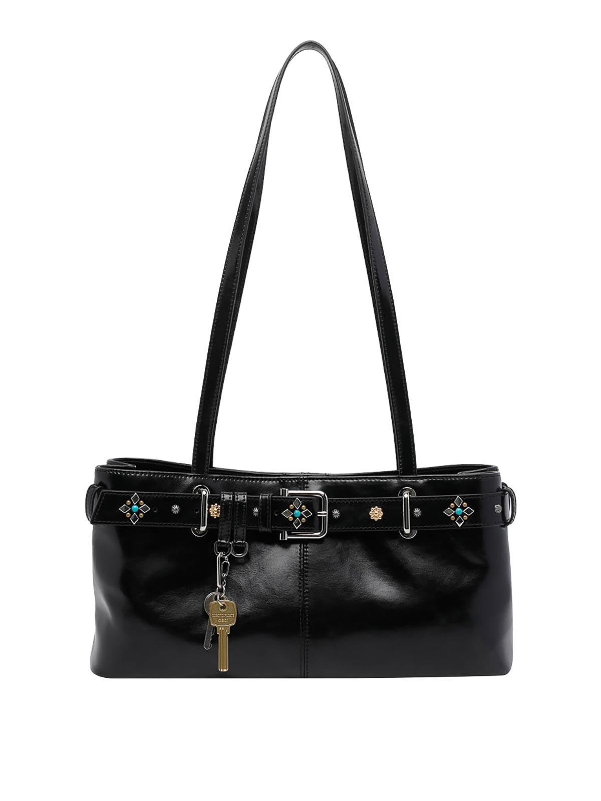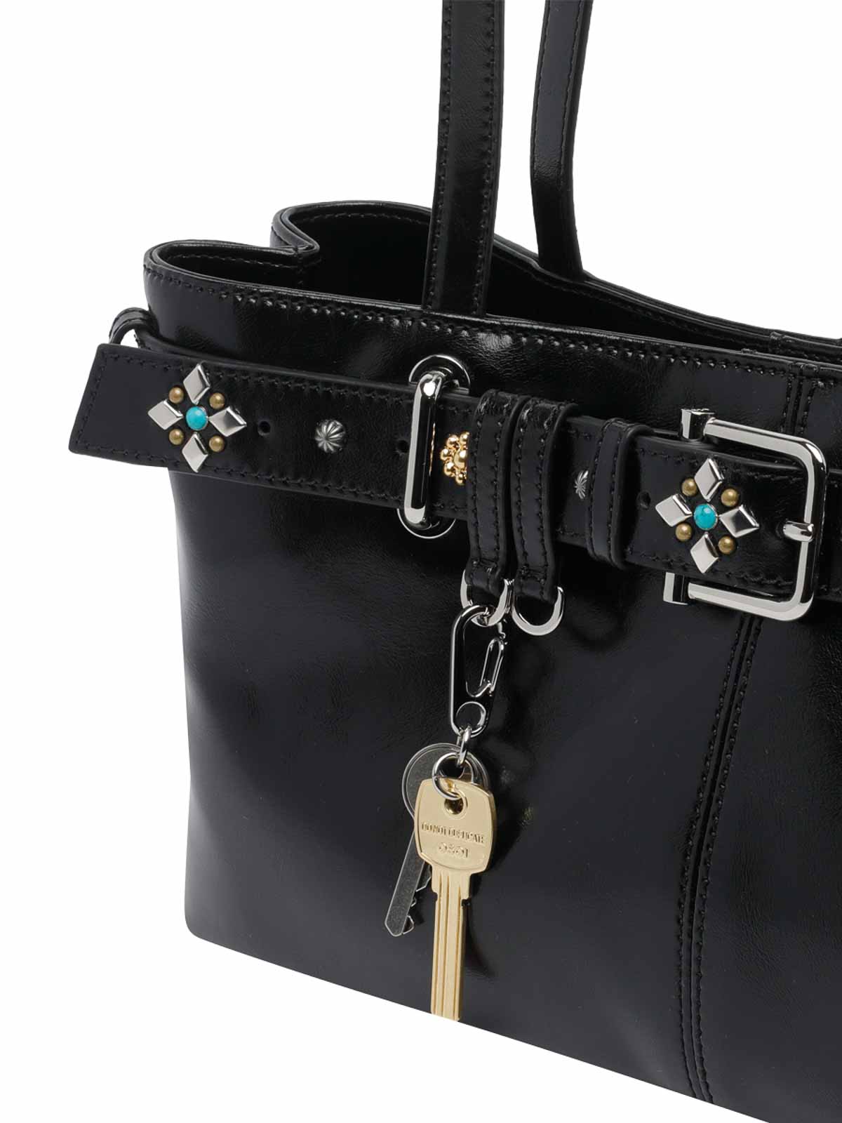 Borsa a tracolla nera Osoi, chiusura magnetica, tasca interna aperta, 2 manici, dettaglio charm