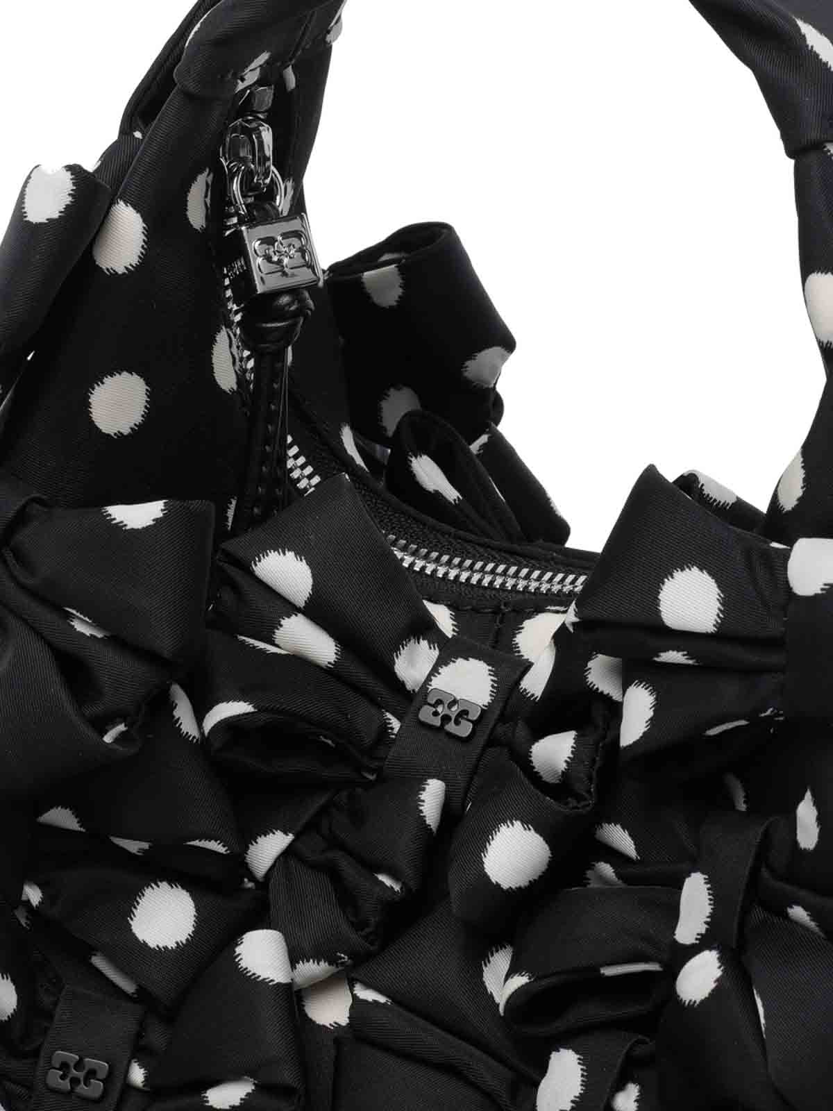 Borsa hobo Ganni nera stampa mini fiocco in raso, chiusura con zip, tasca interna aperta, tracolla adattabile e removibile, pois all over