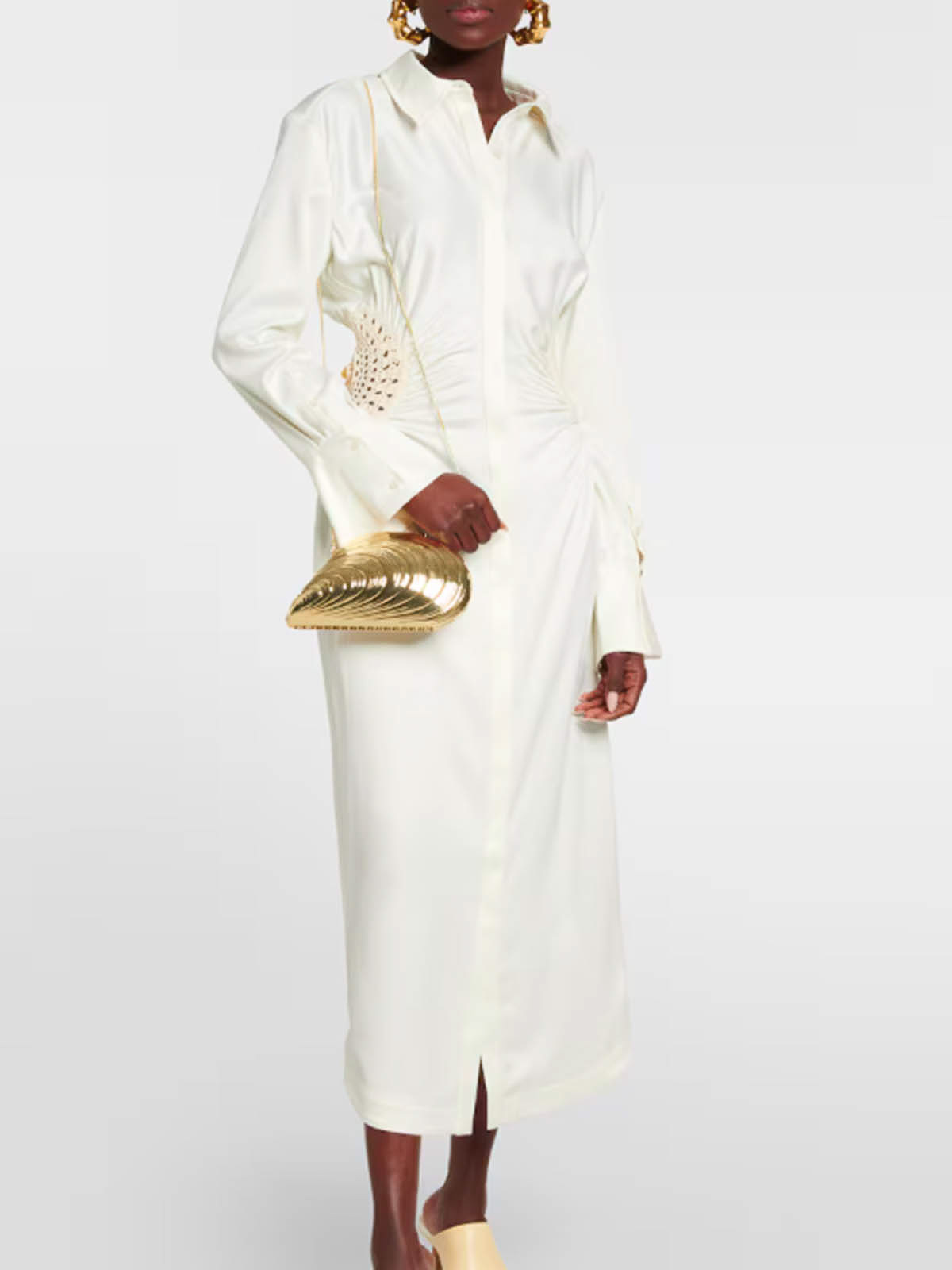 Modello finitura lucida, design a conchiglia, colore oro, tracolla removibile, scomparto unico, fodera scamosciata, chiusura con moschettone.
