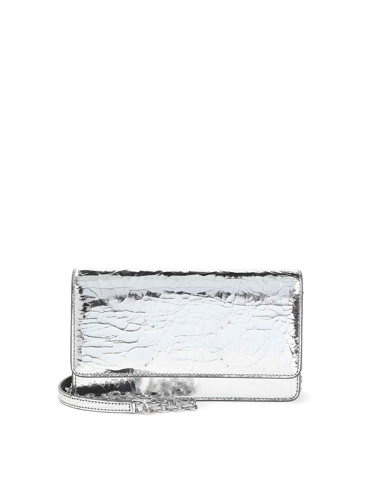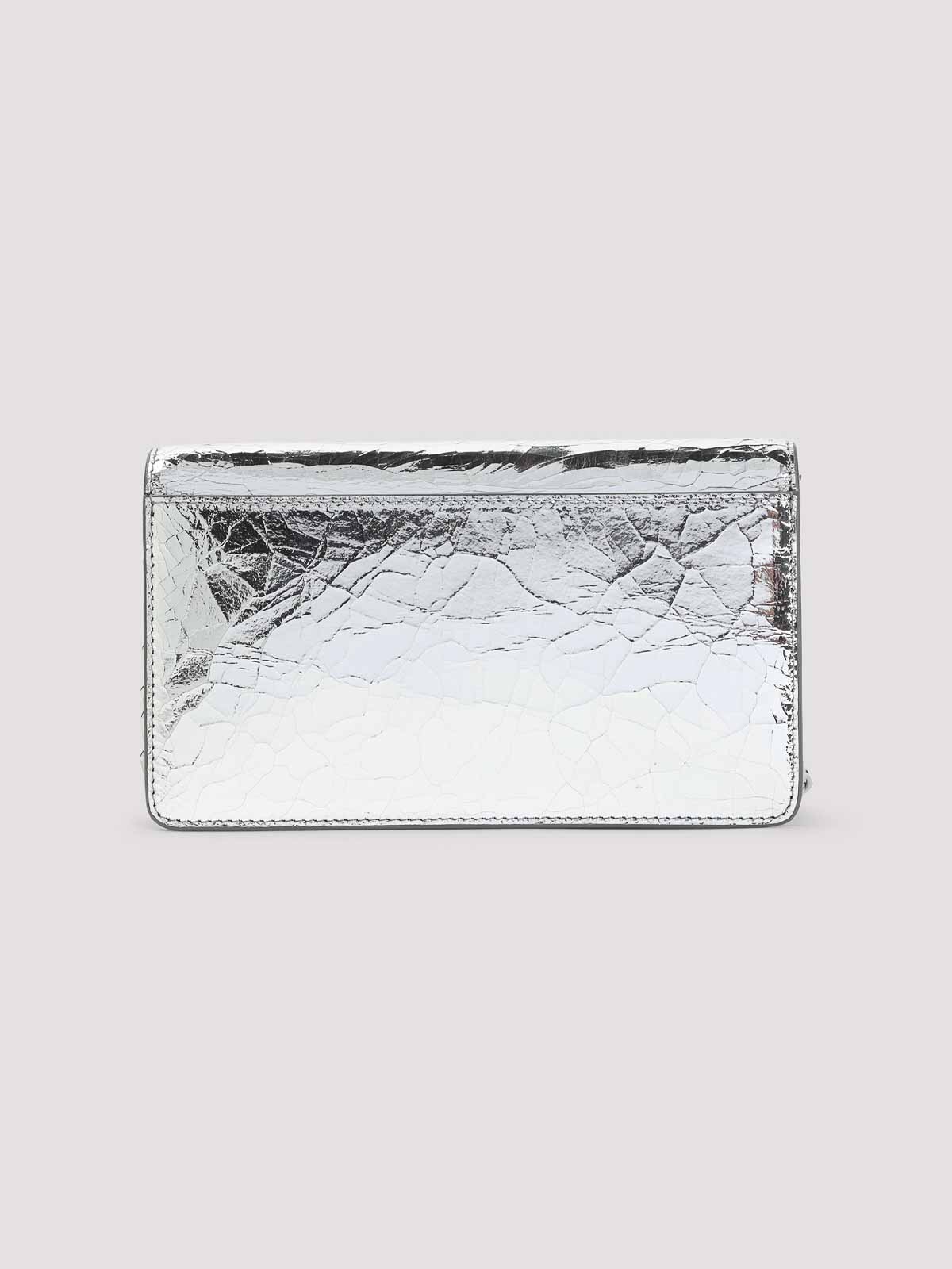 Borsa pieghevole Maison Margiela in pelle craquelé argento. pelle craquelé argentata, design pieghevole, chiusura con automatico magnetico, tasca con zip, sei scomparti per carte di credito e tracolla a catena staccabile. dettagli logo, completamente foderato.