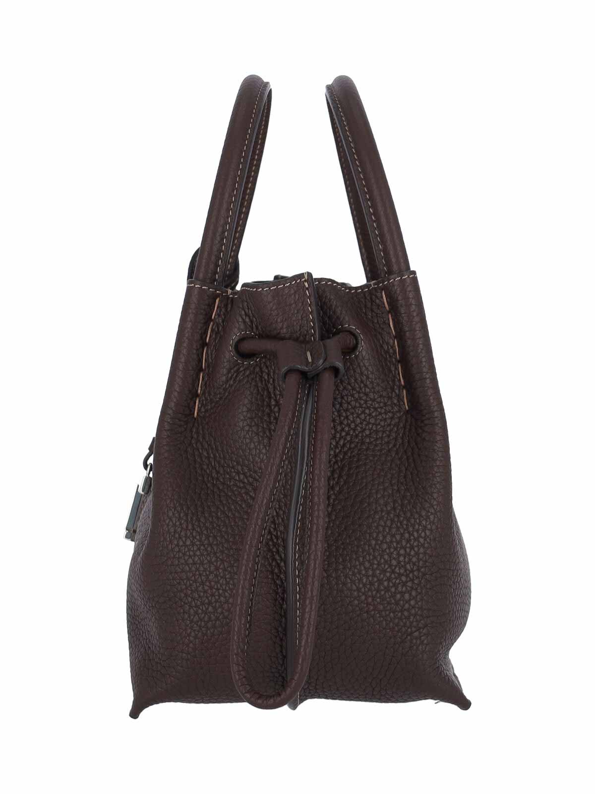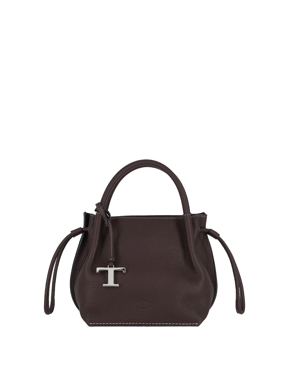 Borsa secchiello piccola logo tod's in pelle martellata marrone, due manici, dettaglio charm logo