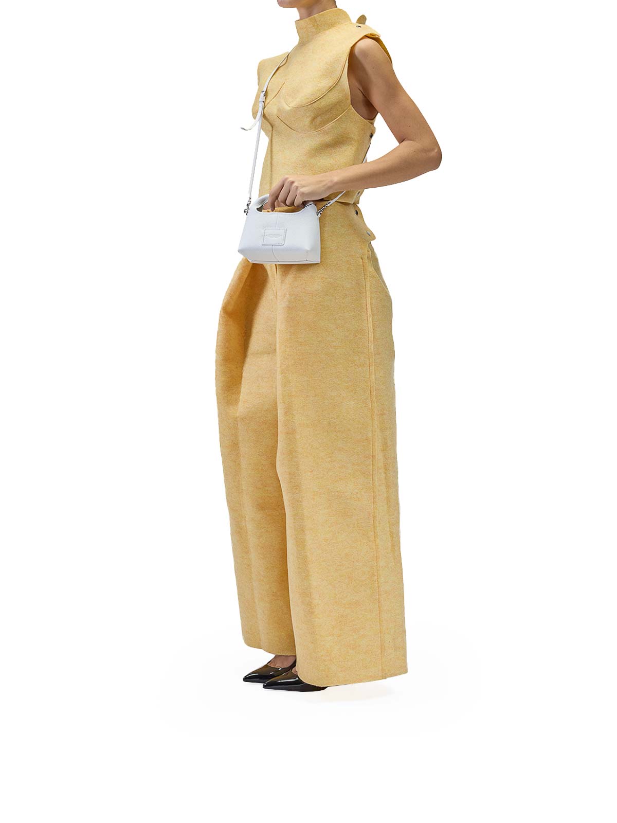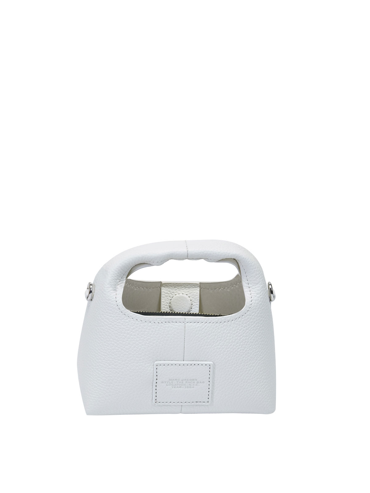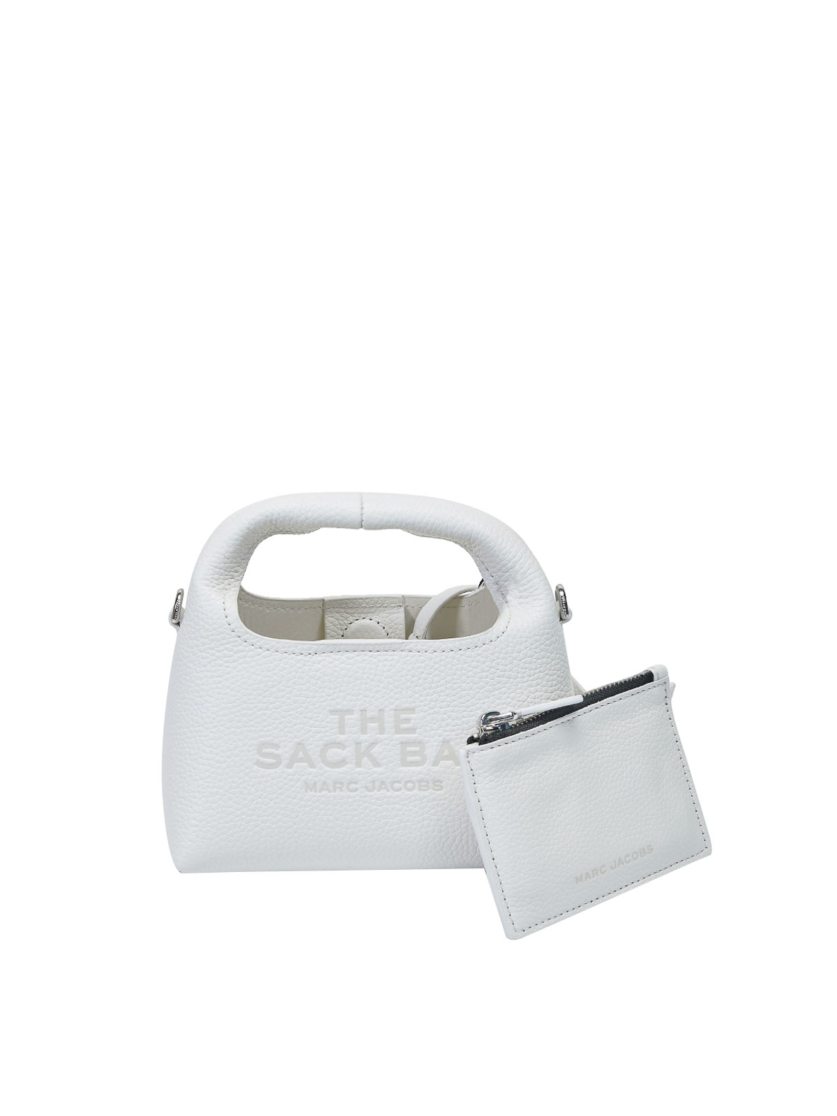 the micro crossbody sack in bianco, la versione micro dell'iconica sack bag di marc jacobs si, presenta come borsa a mano con manico superiore in pelle, e chiusura con bottone magnetico. questa sack bag , caraterizzata da una silhoutte compatta e morbida ed , realizzata in pelle pieno fiore con la stampa ad impressione, del logo davanti e la targhetta con logo sul retro., all'interno la borsa si presenta con una pochette removibilecon chiusura a zip, che inserita rende l'interno a doppio, scomparto, modello a mano, manico superiore, stampa del logo sul davanti, targhetta con logo sul retro, pochette removibile con zip, tracolla removibile, chiusura con bottone magnetico,