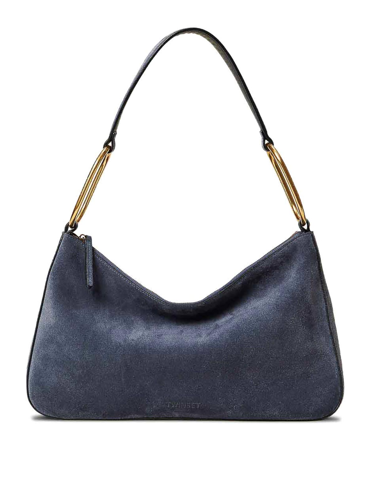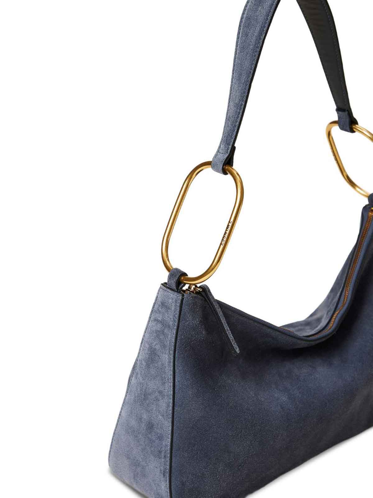 Tasca superiore con cerniera in vero bovino blu scuro con manici ad anello diviso