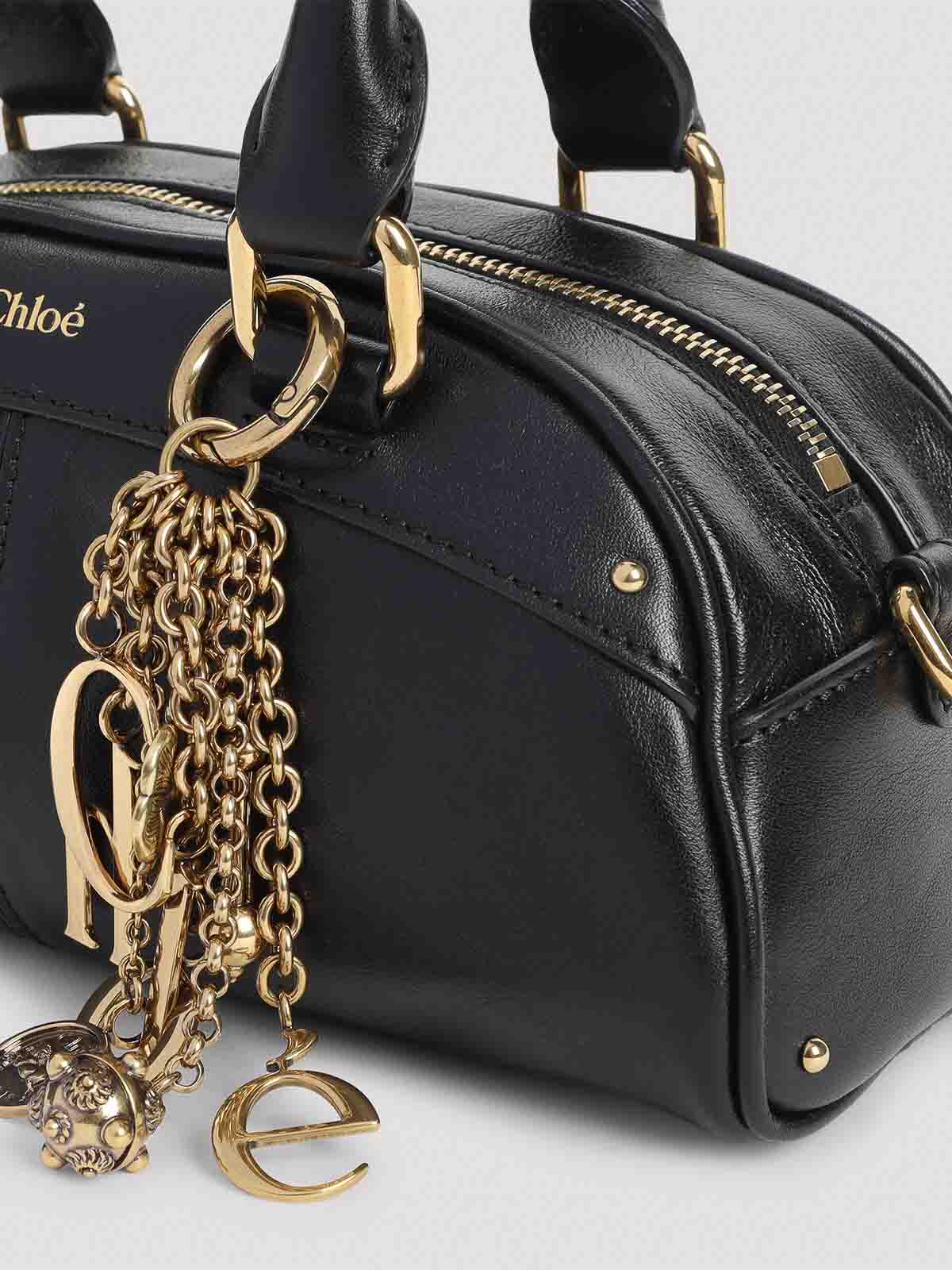 Borsa a mano Chloe in pelle di vitello nera. borsa a mano in pura pelle di vitello nera, manici superiori, chiusura superiore con zip, logo lettering superiore color oro, ciondoli laterali metallici color oro con dettagli in cristallo, tracolla regolabile e staccabile, uno scomparto principale. hardware color oro.