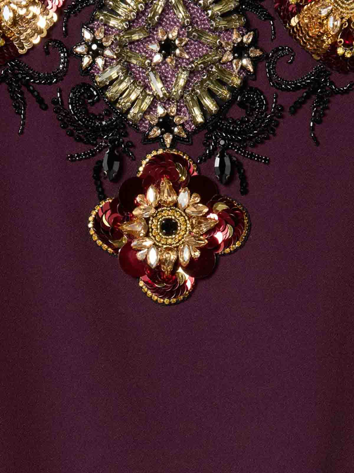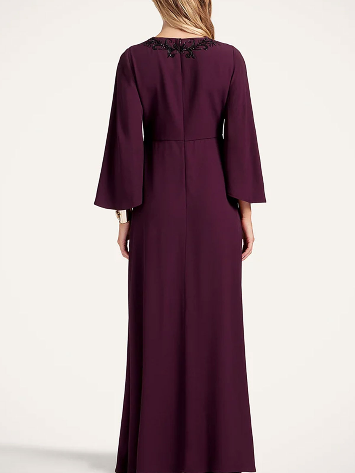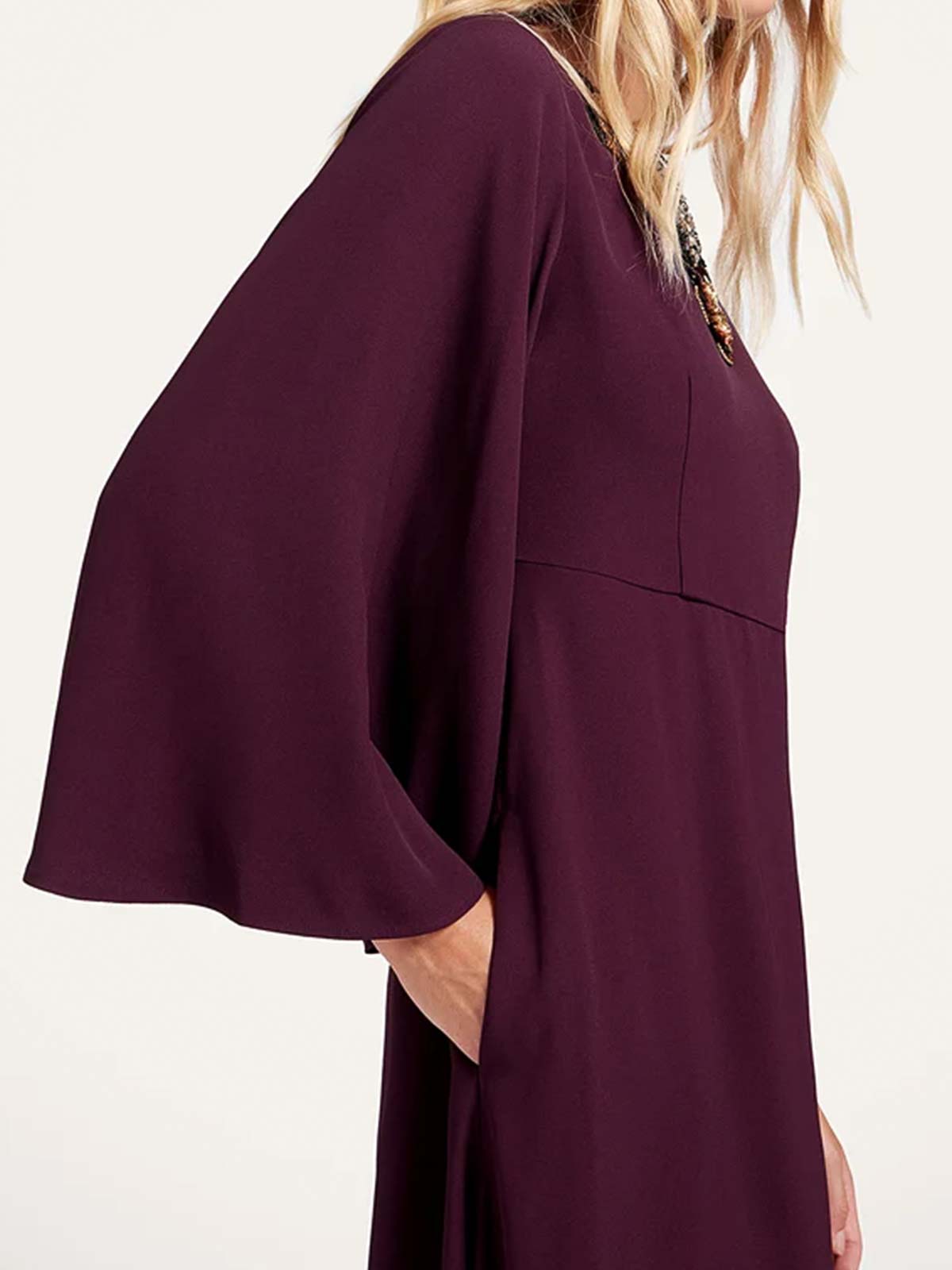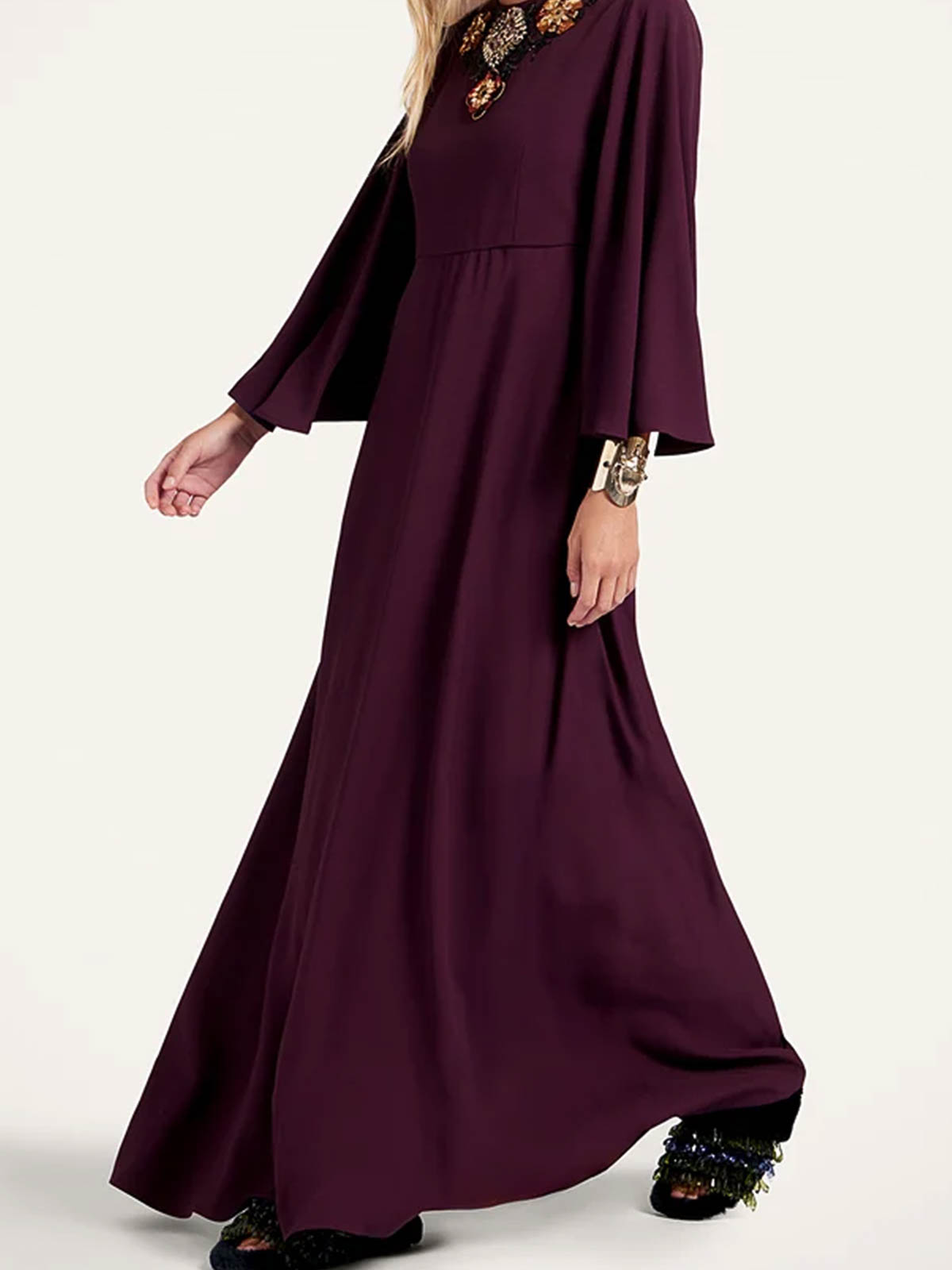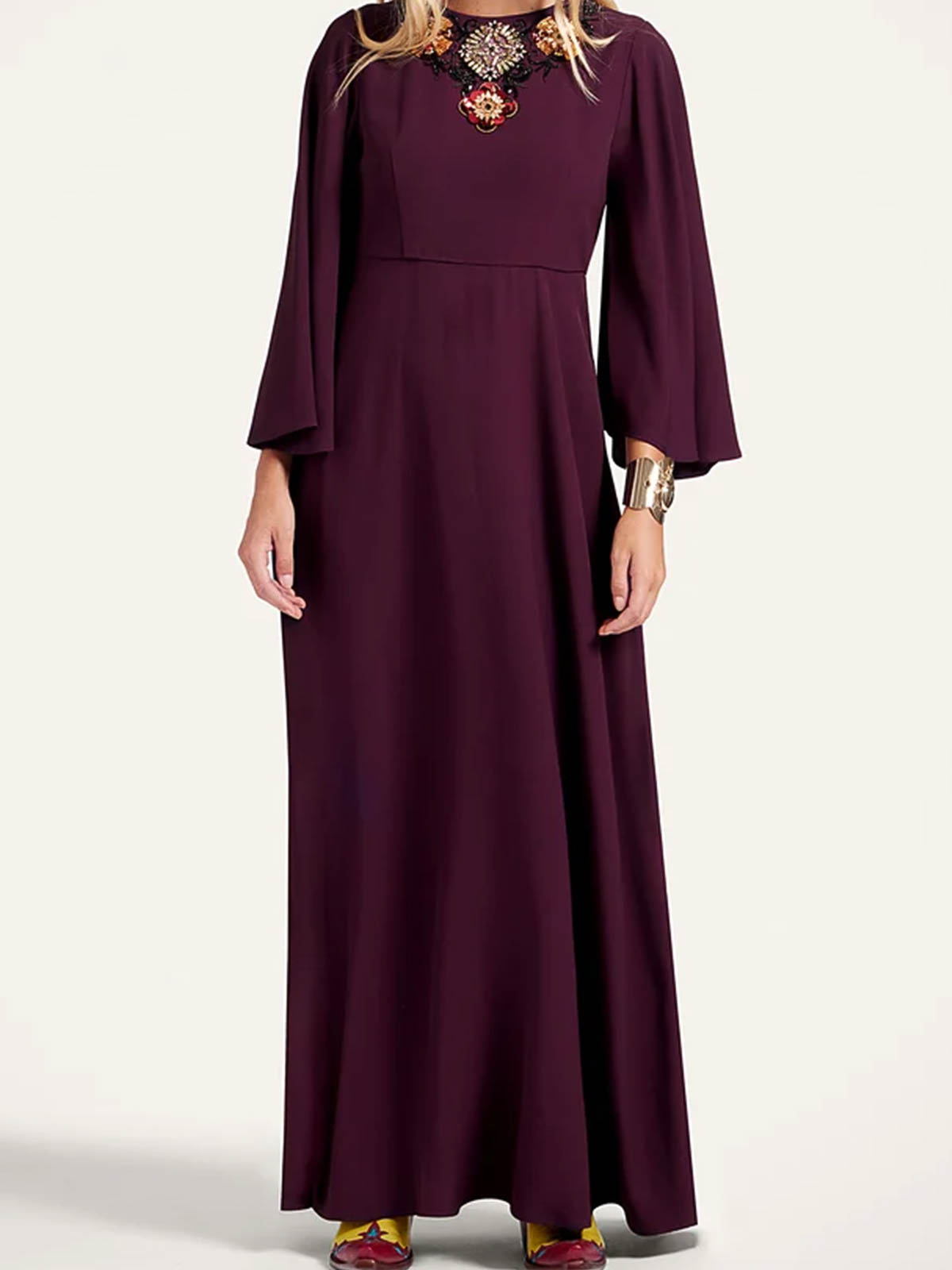 Girocollo, sabl in raso, maniche a campana, lunghezza alla caviglia, tasche laterali nascoste, vita aderente, design leggermente svasato, applicazioni frontali. composizione: 100% viscosa made in Italy