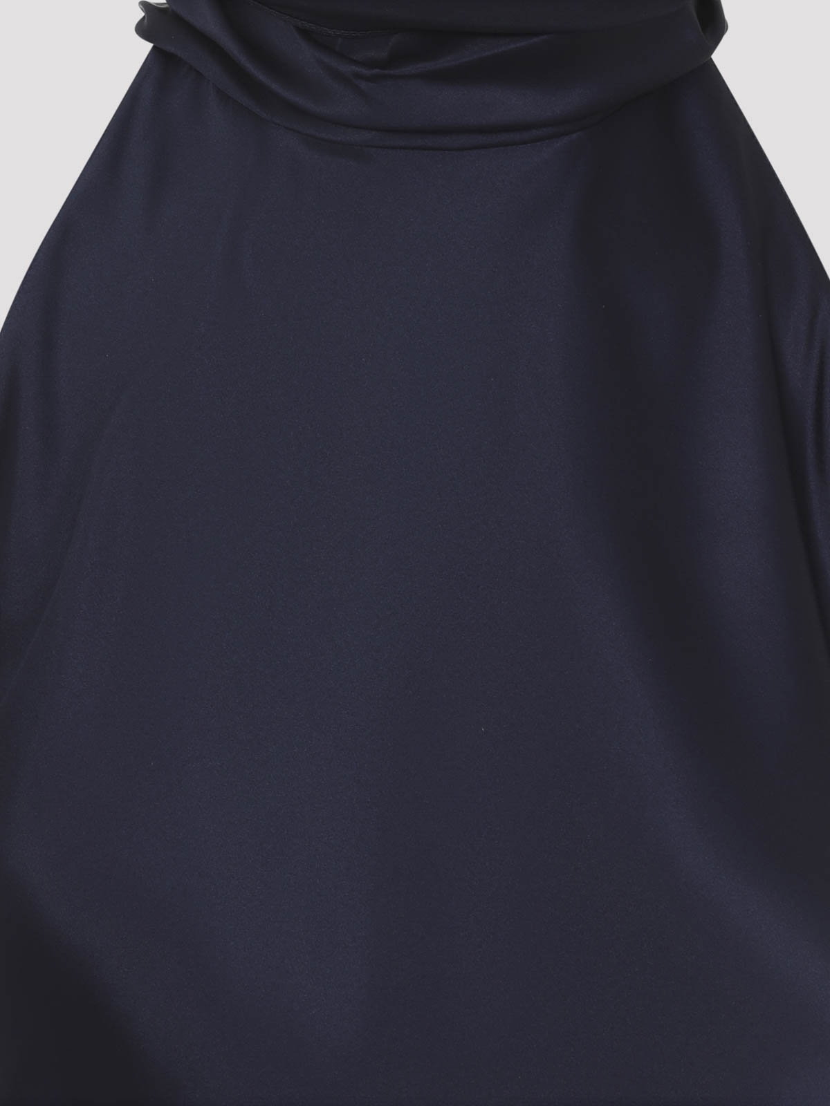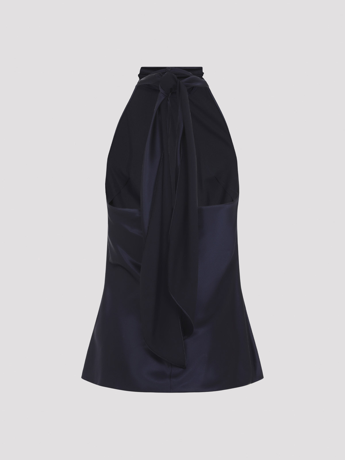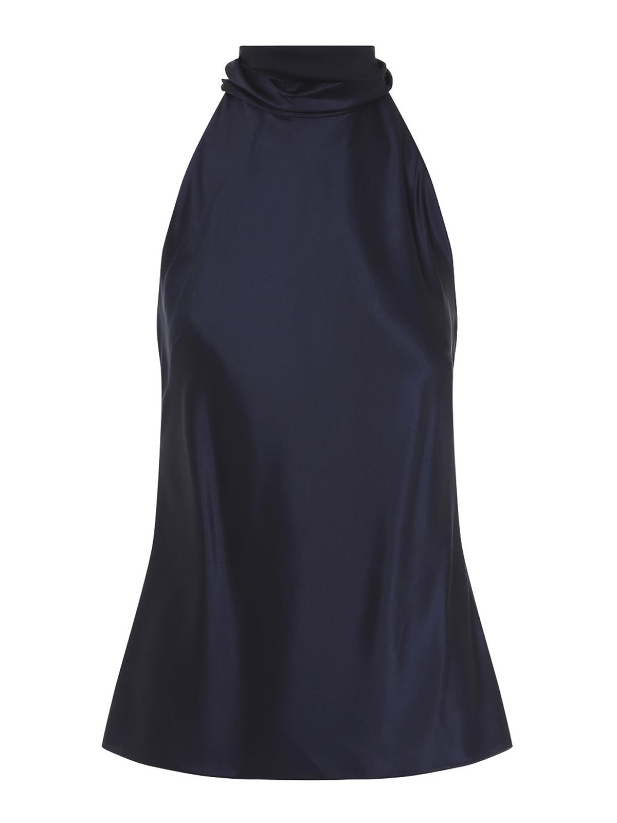 Blusa Ralph Lauren in chilton di seta di gelso blu navy con icona. realizzato in misto seta di gelso ed elastan. scollo all'americana, dettagli plissettati davanti sul collo, dettaglio fiocco tono su tono sul retro, schiena aperta, senza maniche, orlo dritto, cuciture tono su tono.