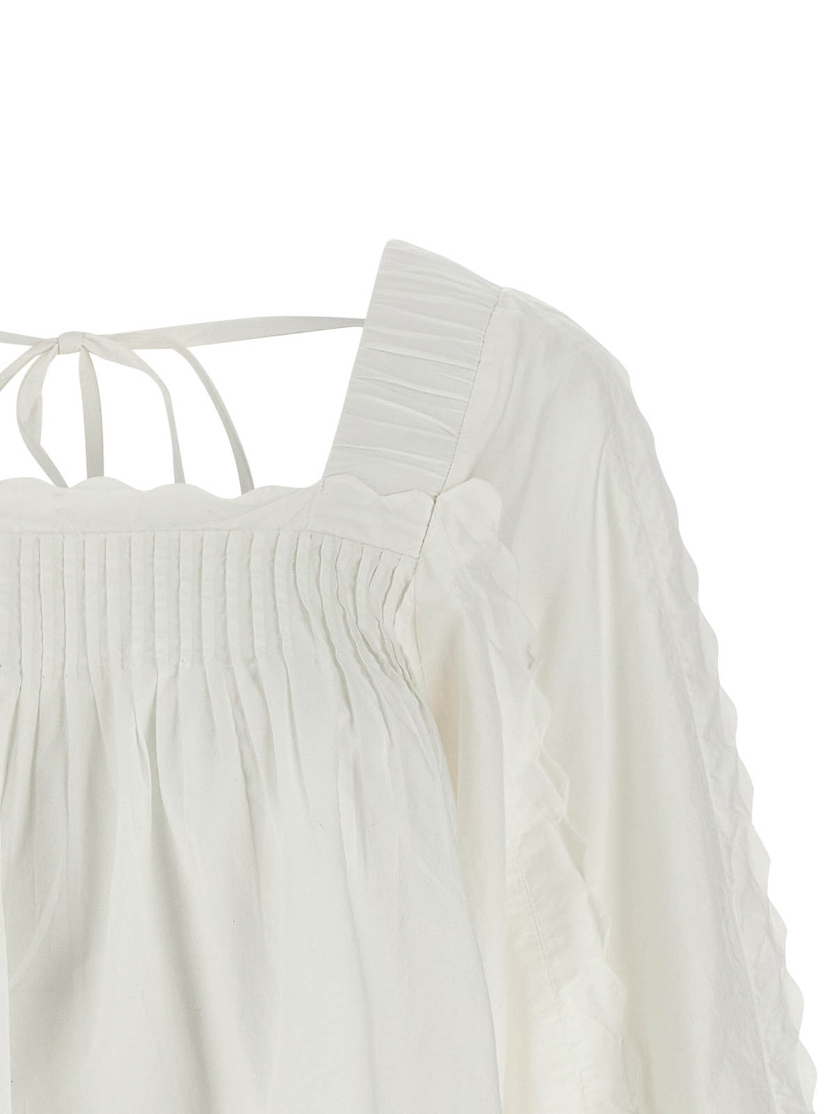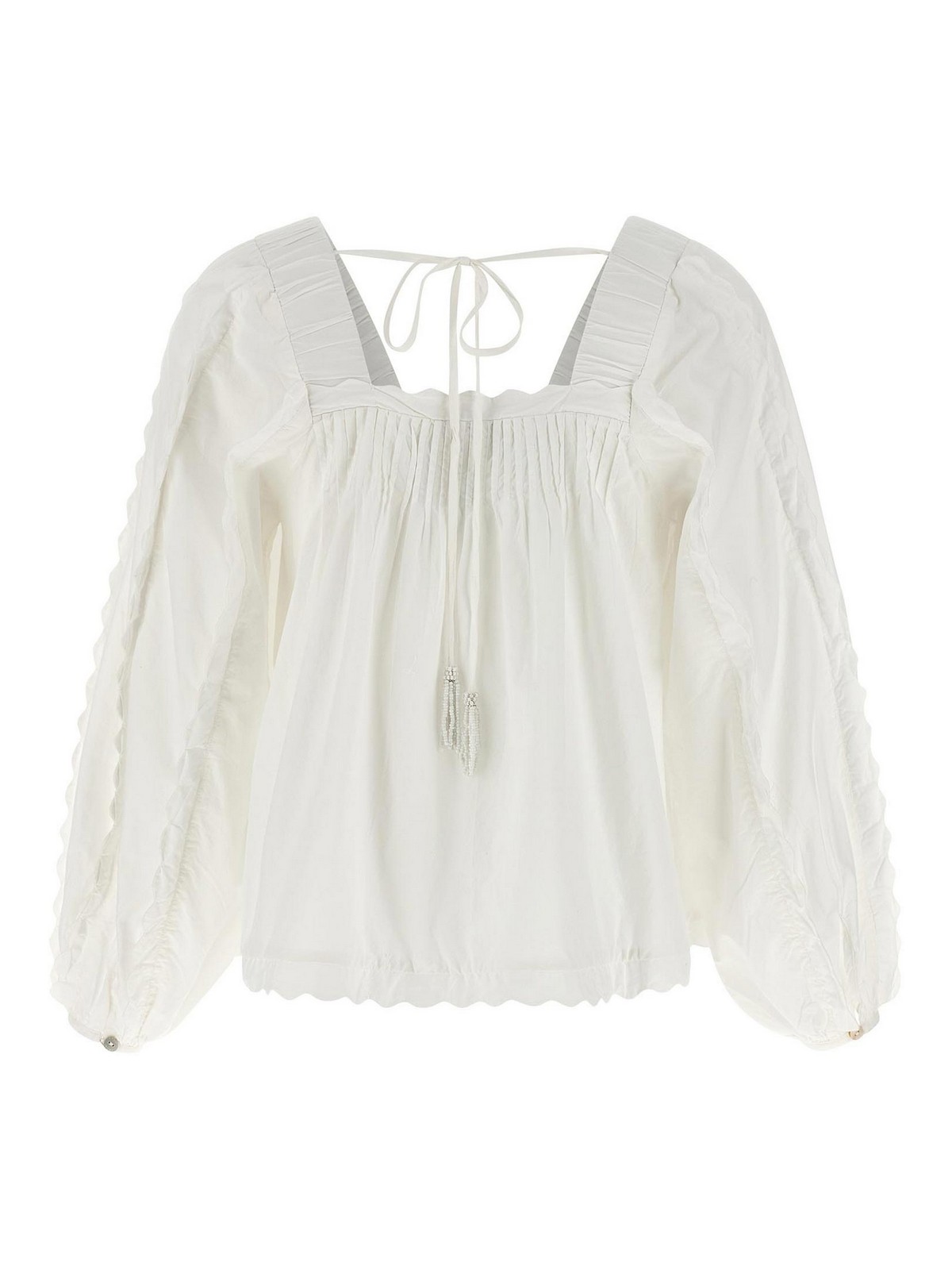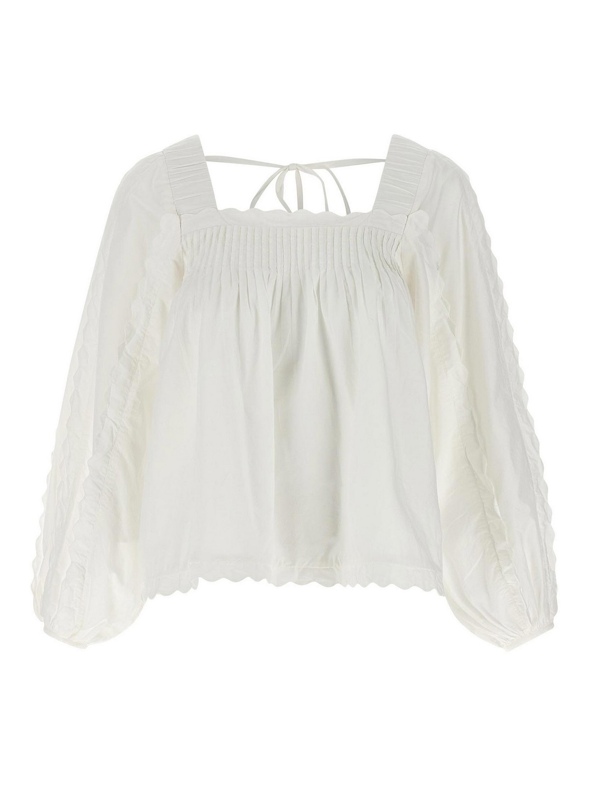 Blusa in cotone, scollo quadrato con inserti elastici e laccetto sul retro, pinces davanti e dietro, maniche lunghe con polsino e inserti tono su tono, silhouette svasata.